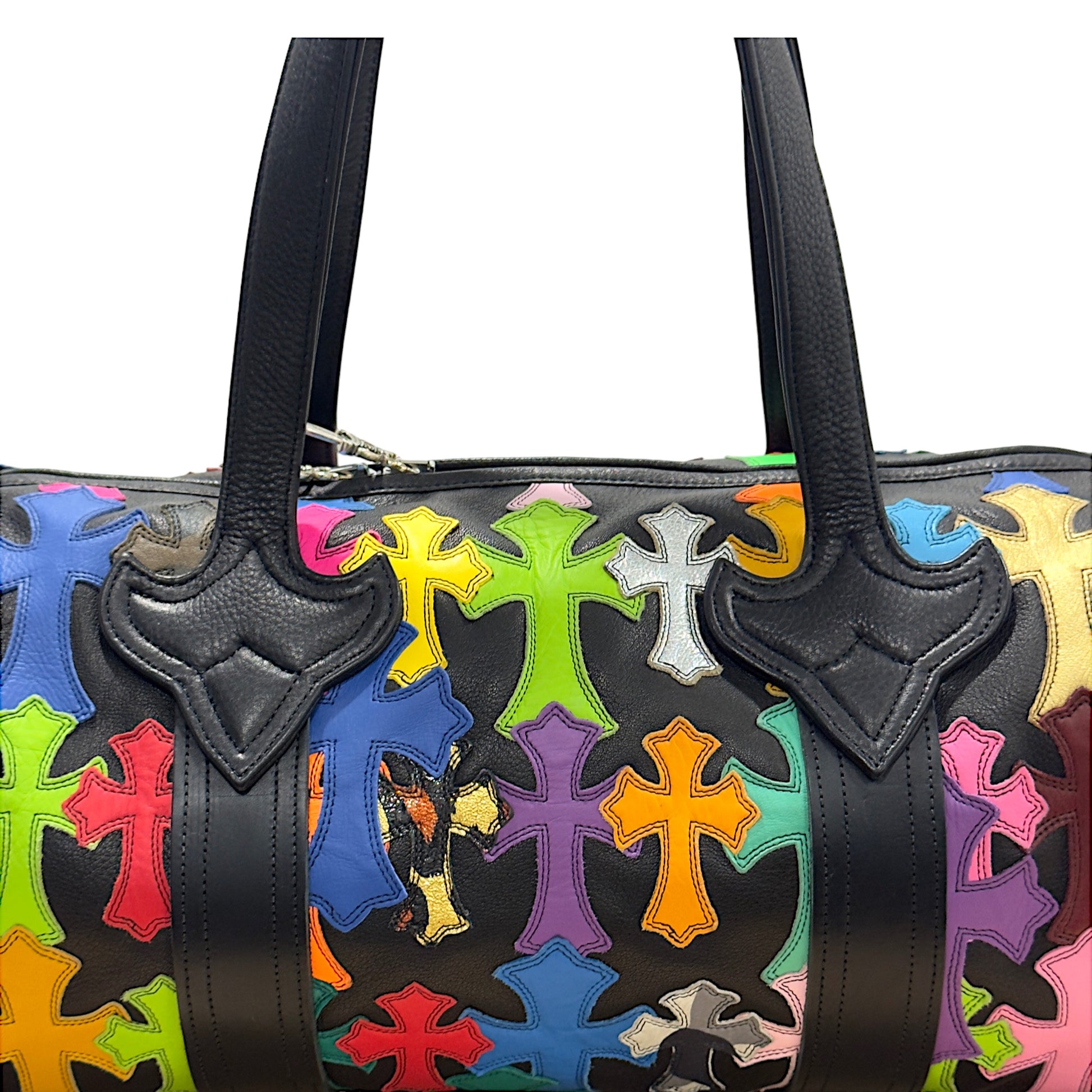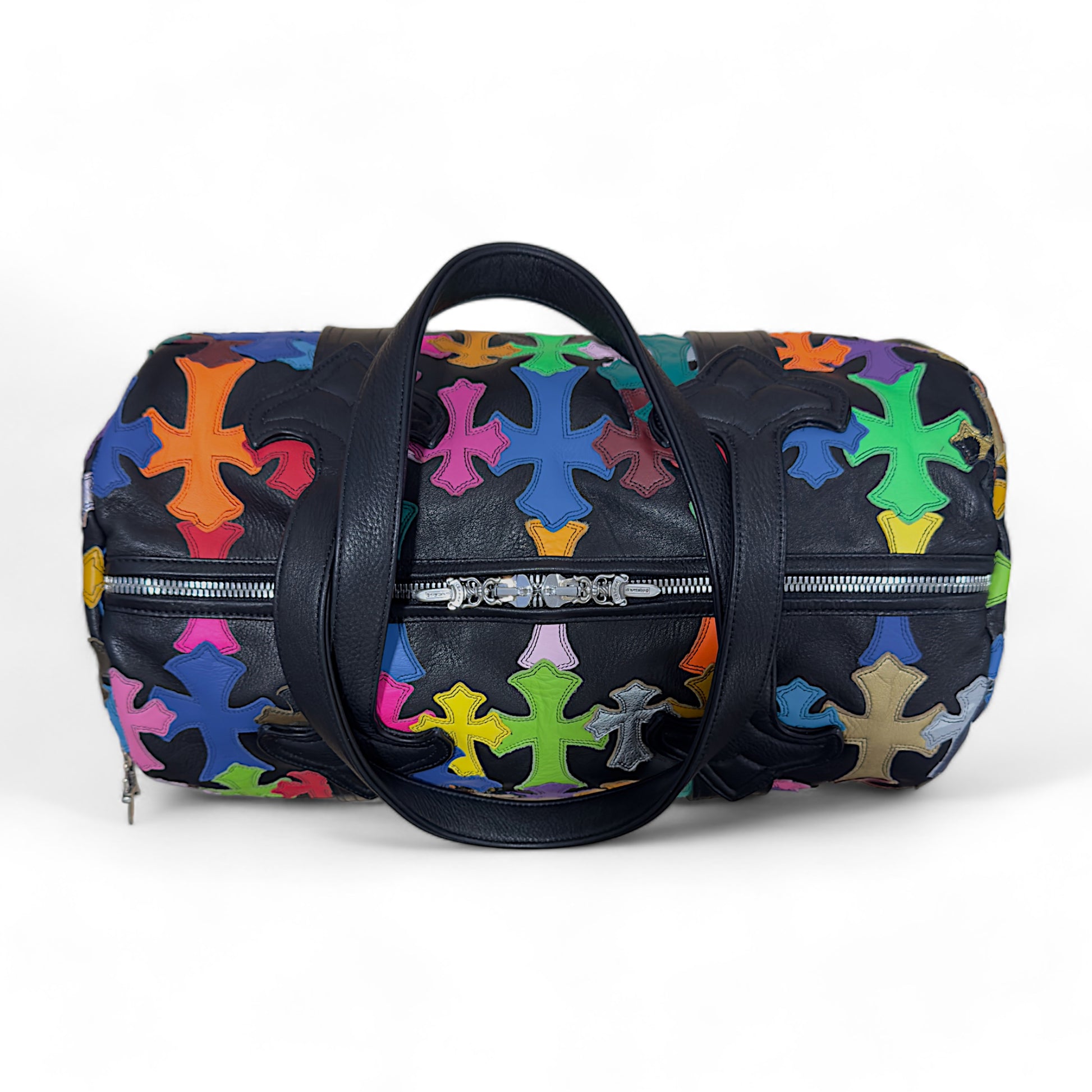 Chrome Hearts Tiny Duffle Bag with Multi Color Leather Cross Patches. This bag features a black leather base with a wide variety of cross patch variants from leopard print, to camouflage, to other solid vibrant colors. It also features .925 silver CH Dagger zippers.