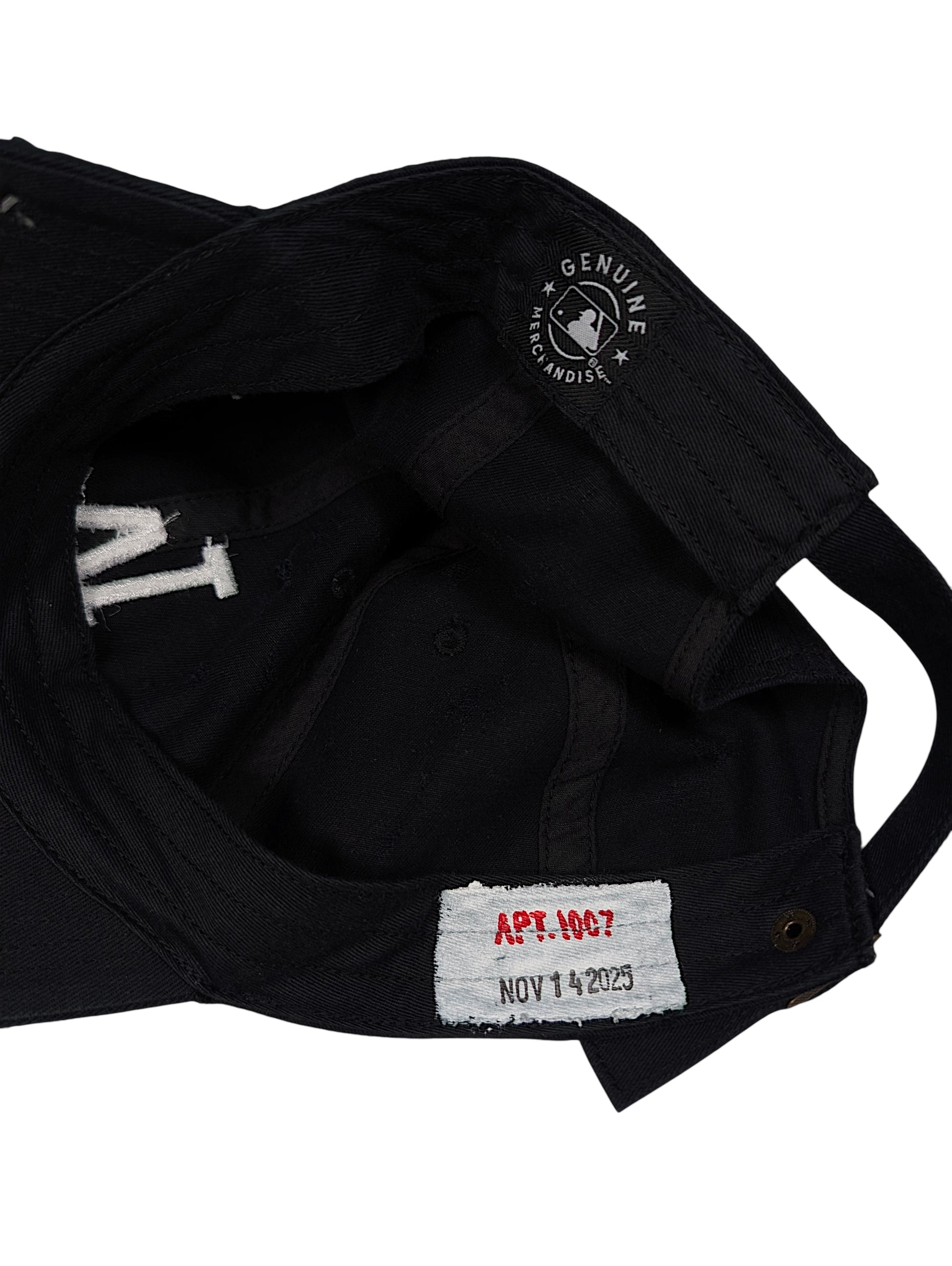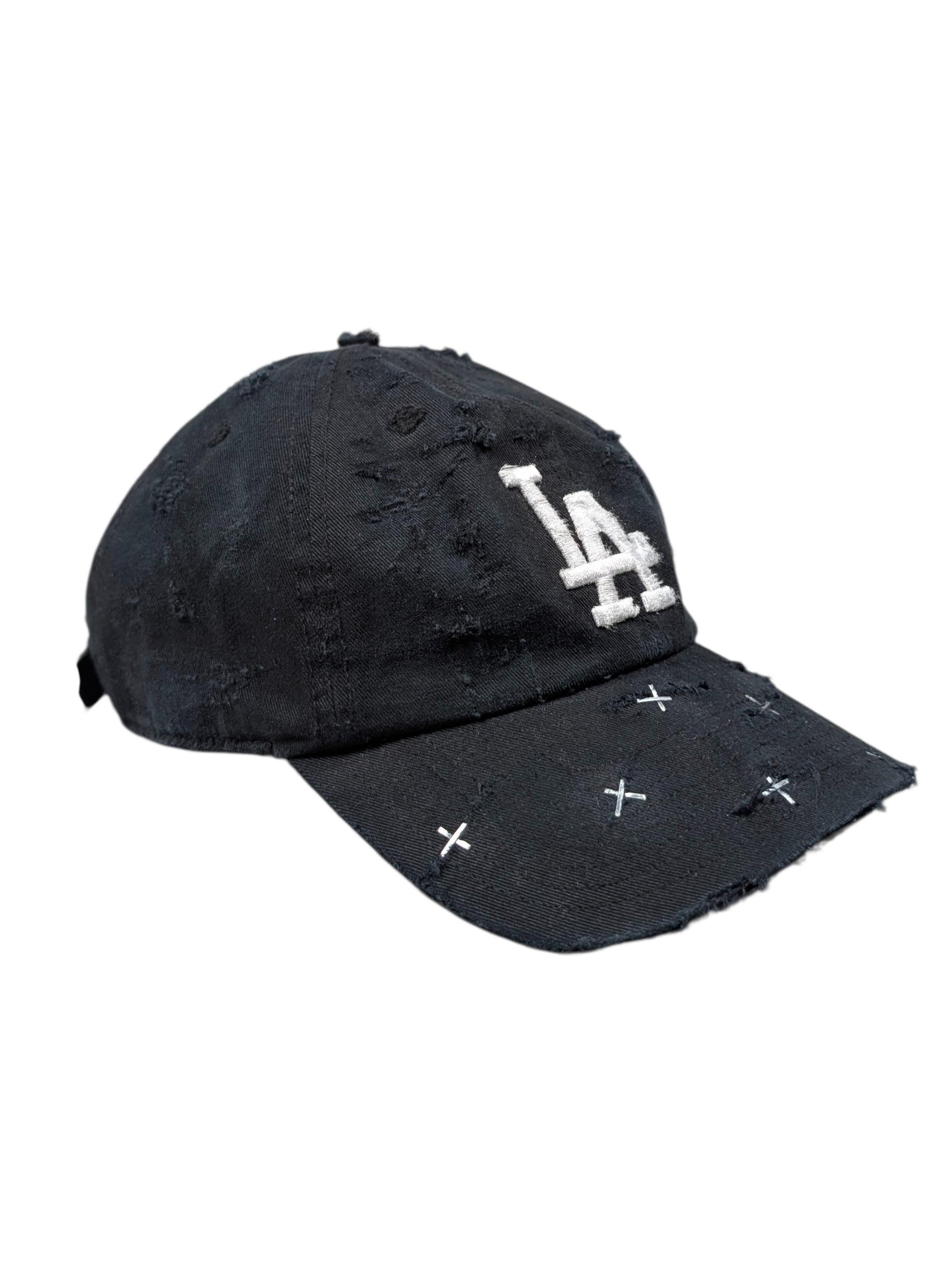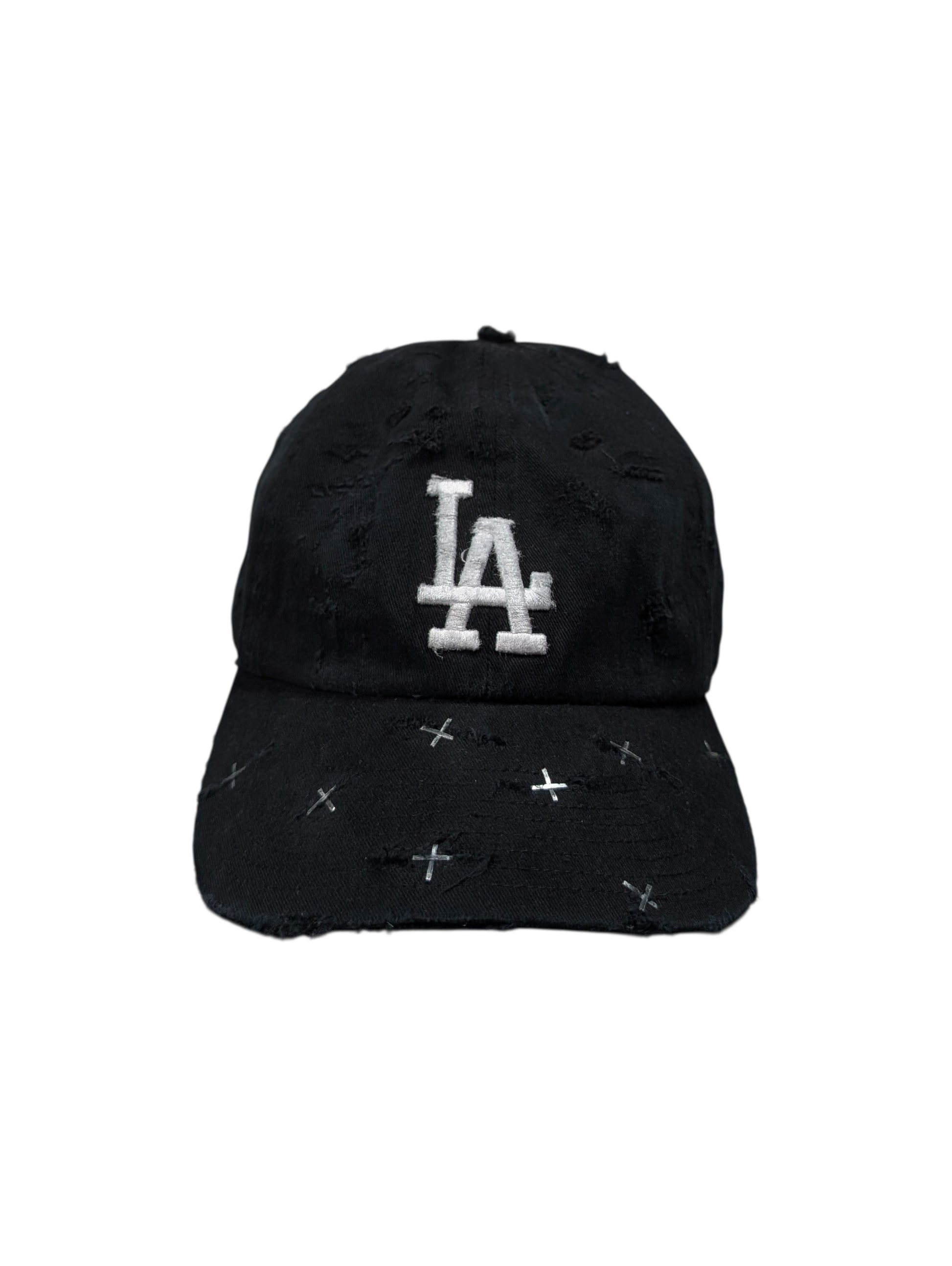 Apt. 1007 Black LA Logo Baseball Cap (#116). One-of-one (1/1) handmade wearable artwork produced in the USA. Features intentional distressing throughout with hand-applied cross-staple detailing across the brim; all wear, fading, and markings are deliberate and unique to this hat (see photos).