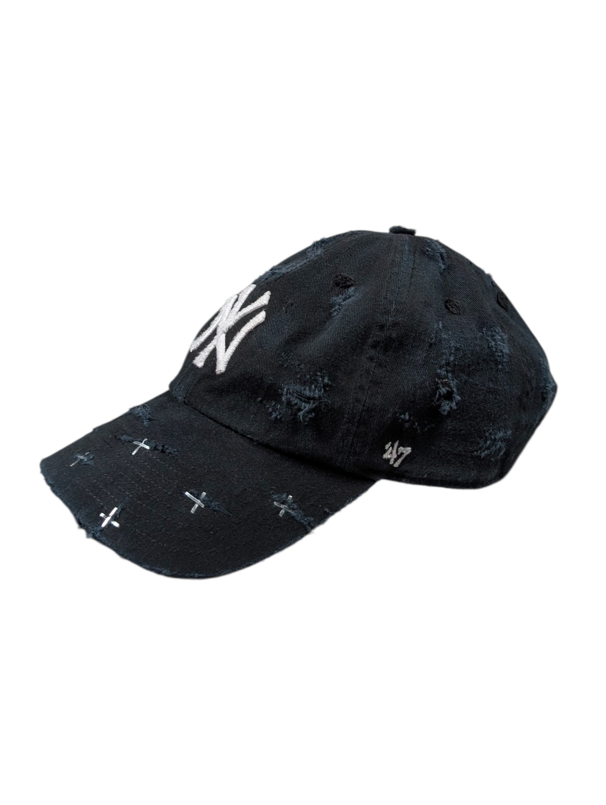 - Details: NY logo front, cross-staple pattern across brim, distressed/aged finish