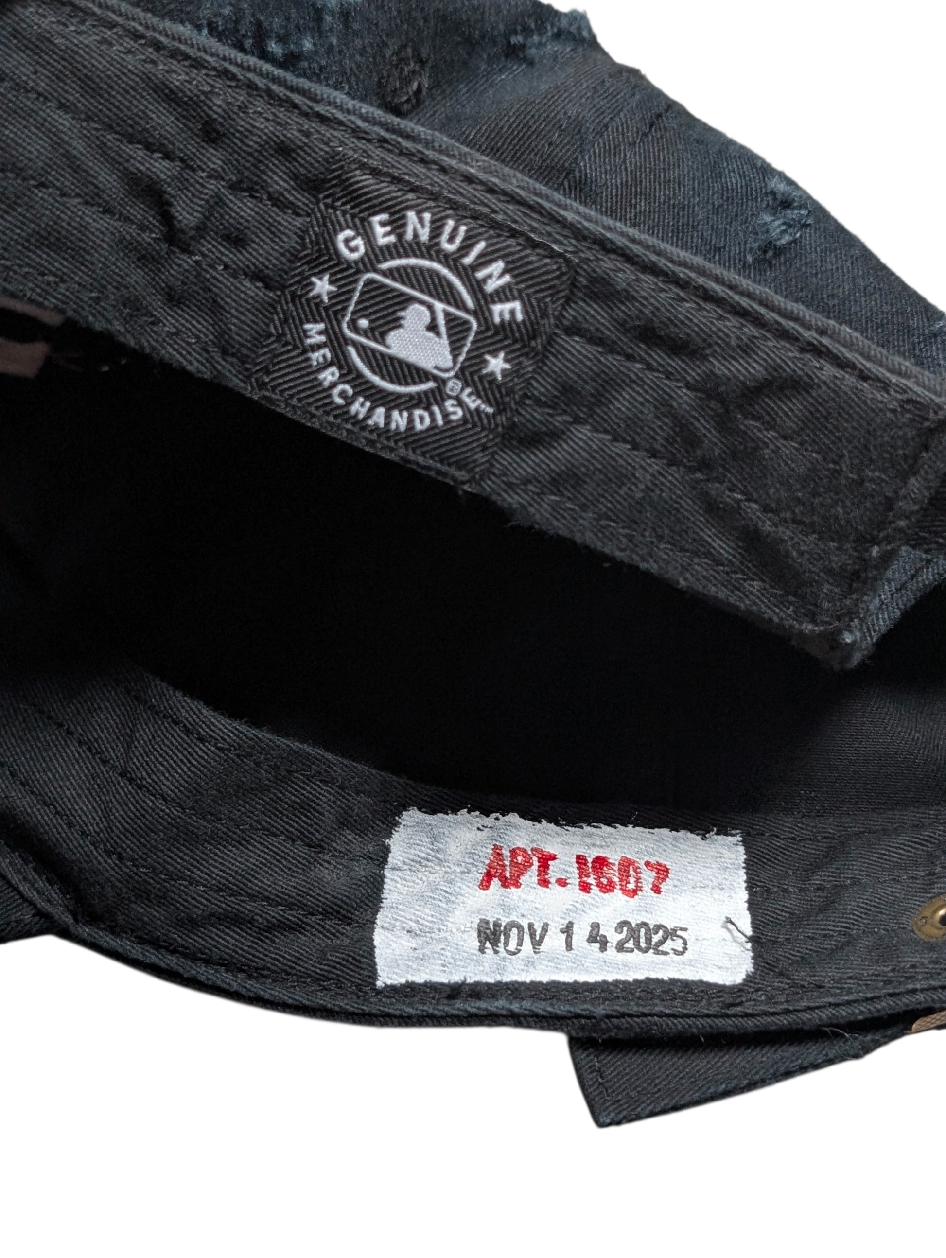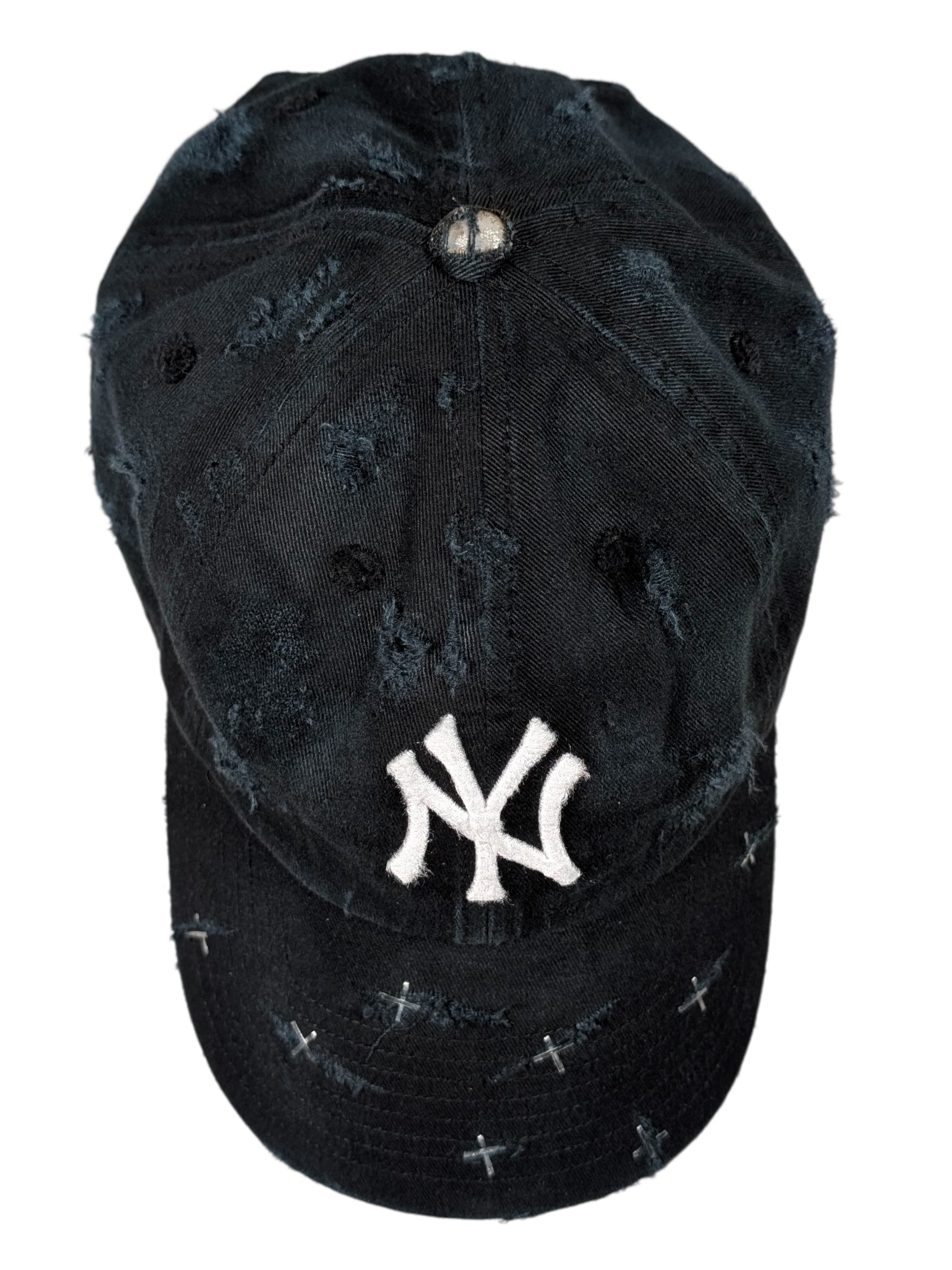 Apt. 1007 Black NY Logo Baseball Cap (#79). One-of-one (1/1) handmade wearable artwork produced in the USA. This black cap features intentional distressing and fading throughout with hand-applied cross-staple detailing across the brim; all wear, markings, and repairs are deliberate and unique to this piece (see photos).