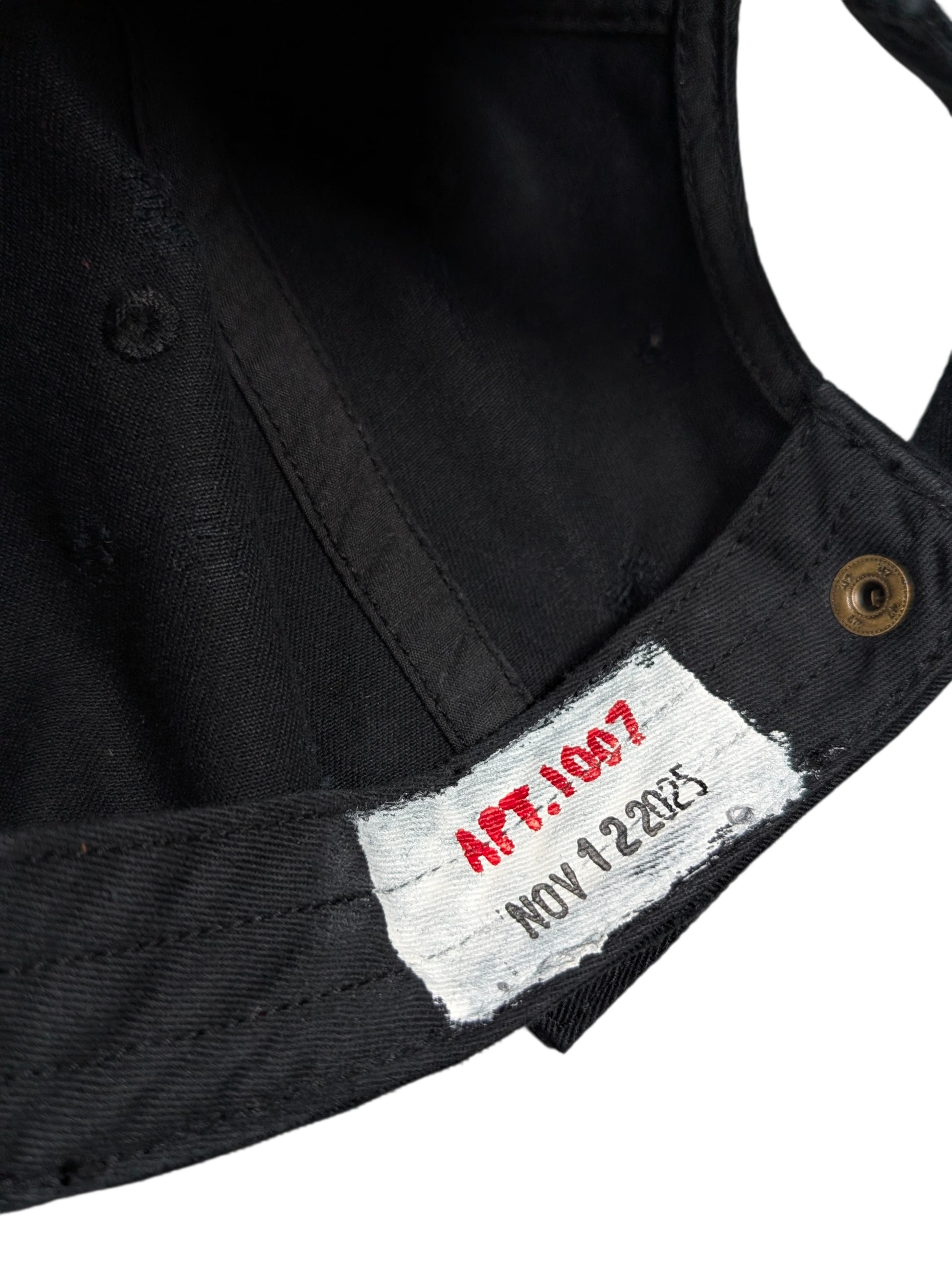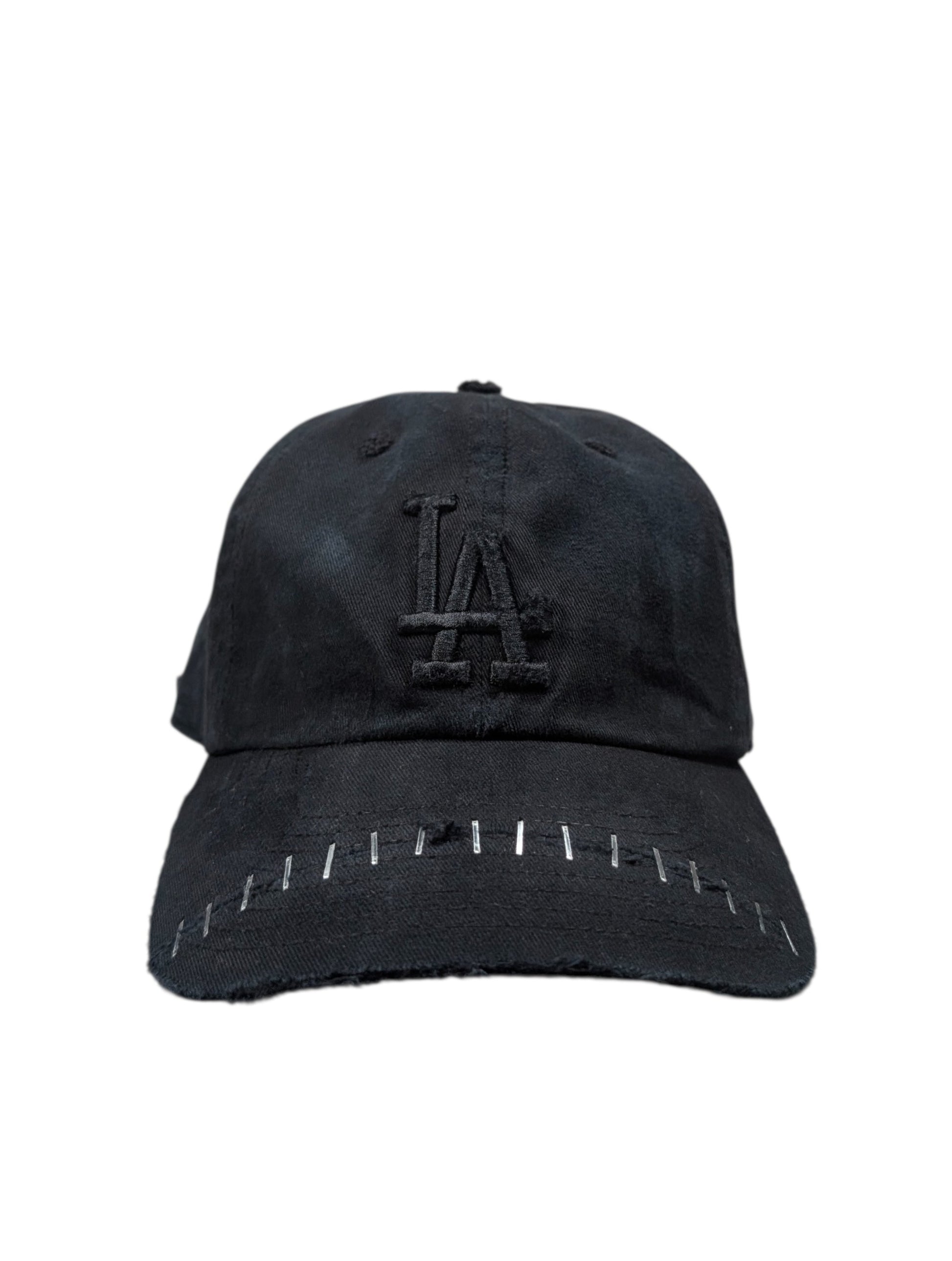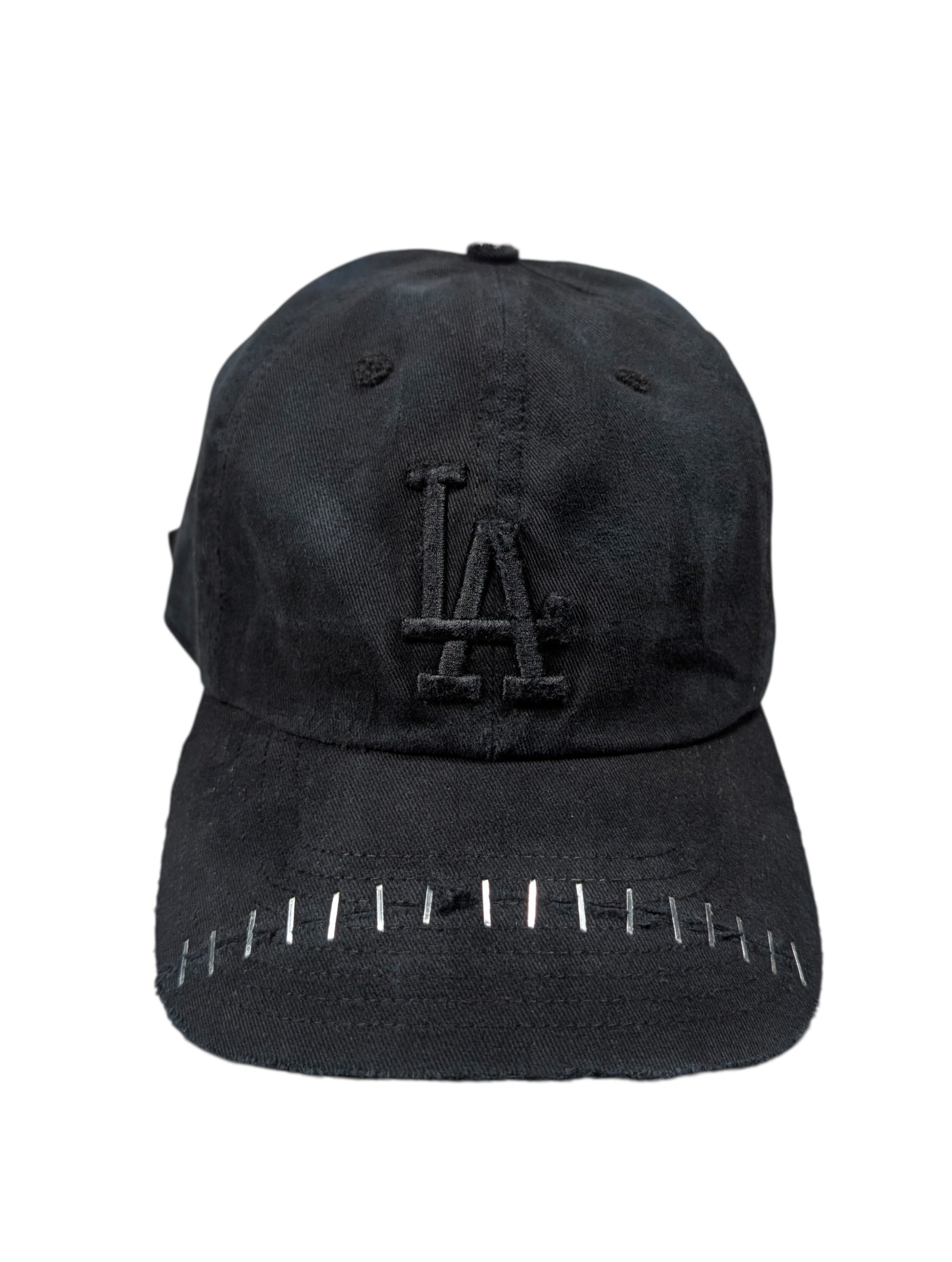 Apt. 1007 “Joker” LA Dodgers Baseball Cap #51. One-of-one (1/1) handmade wearable artwork hat produced in the USA. This black-on-black piece features the signature Joker silhouette with light distressing throughout and hand-applied staple detailing across the brim; all wear, fading, and markings are intentional and unique to this cap (see photos).