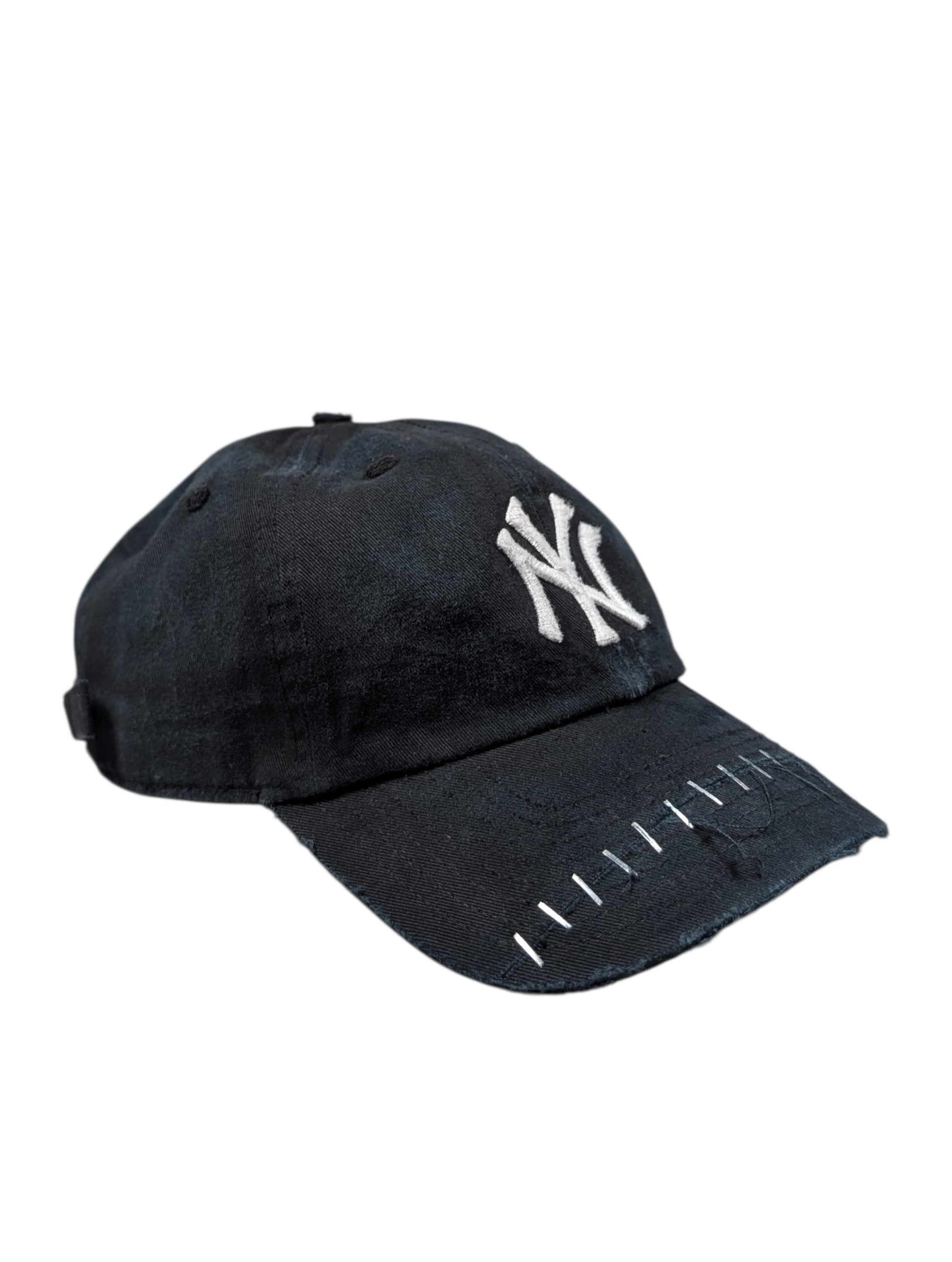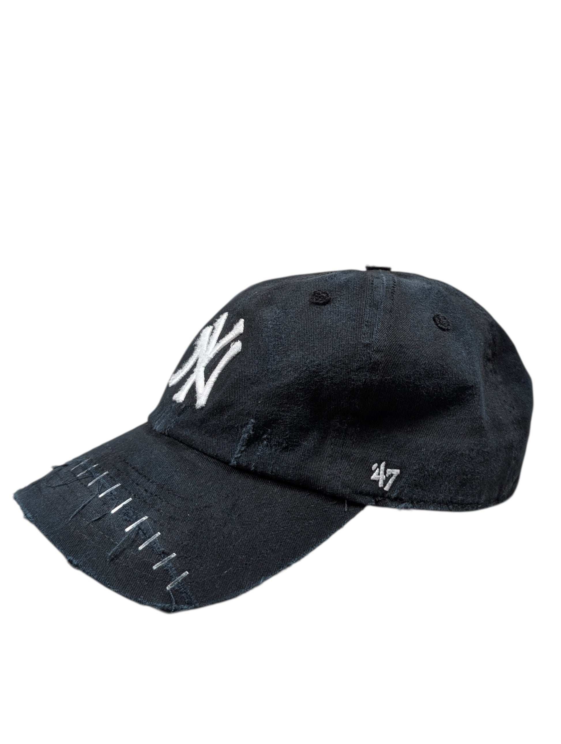 Apt. 1007 “Joker” NY Yankees Baseball Cap (#117). One-of-one handmade wearable artwork produced in the USA. This piece features the signature Joker silhouette with light distressing throughout and hand-applied staple work across the brim; all wear, fading, and markings are intentional and unique to this cap (see photos).