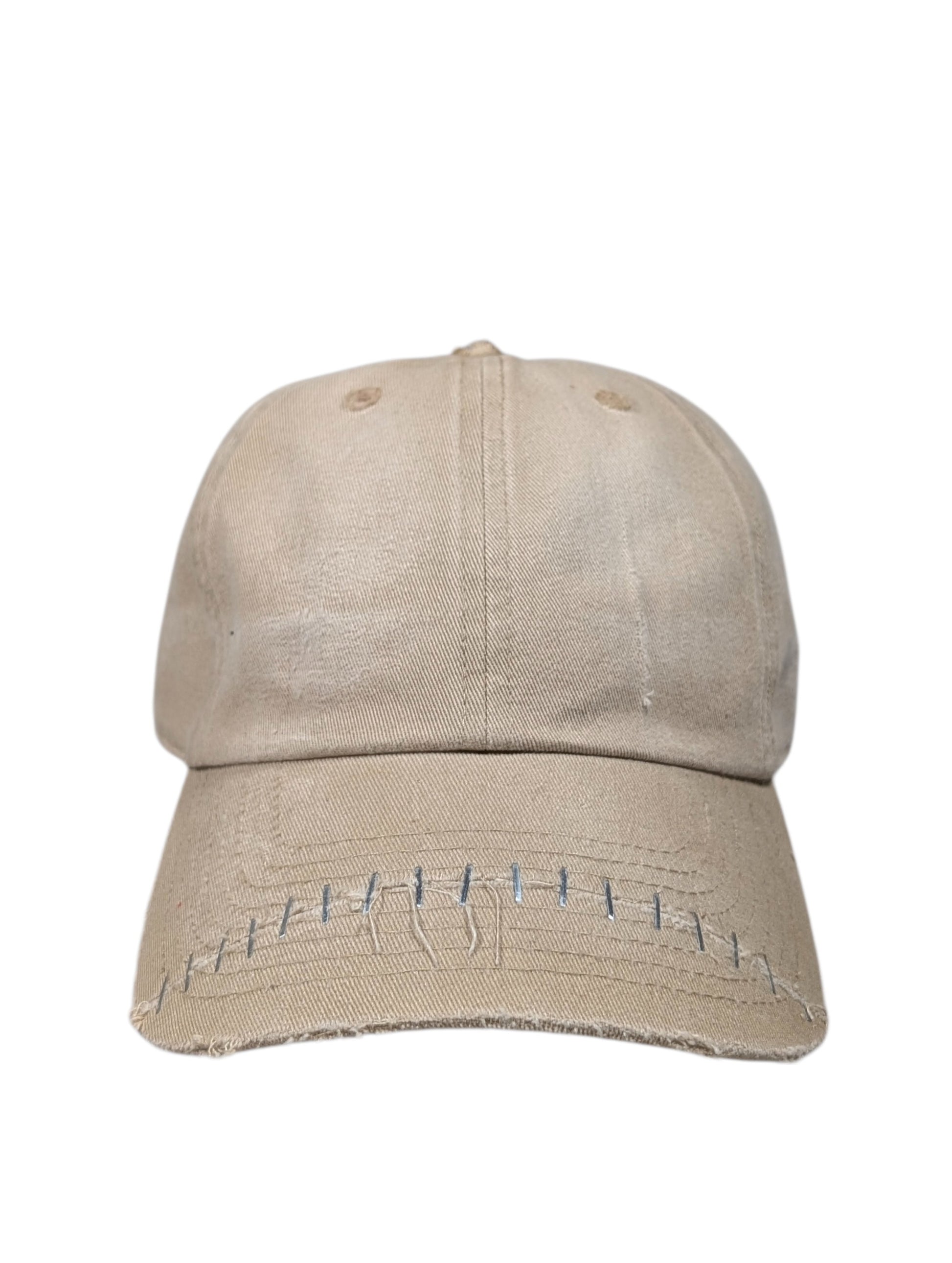 Apt. 1007 “Joker” Baseball Cap #51. One-of-one (1/1) handmade wearable artwork produced in the USA. This khaki piece features the signature Joker silhouette with light distressing throughout and hand-applied staple detailing across the brim; all wear, fading, and markings are intentional and unique to this cap (see photos).