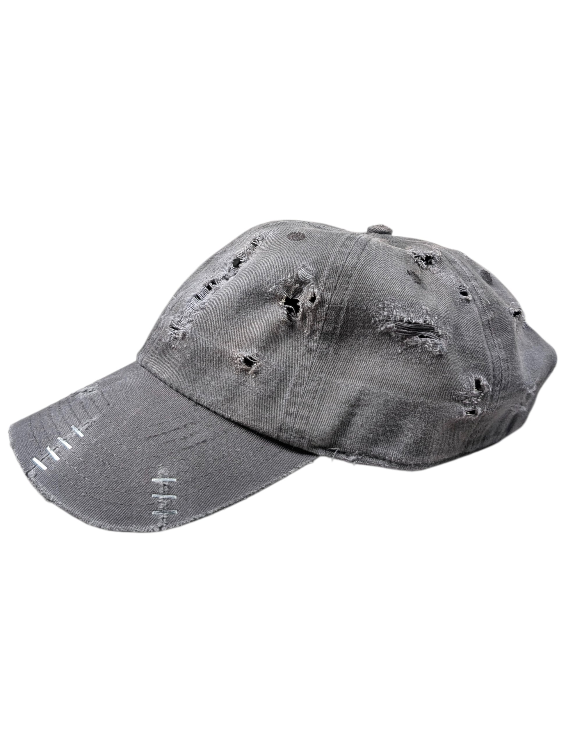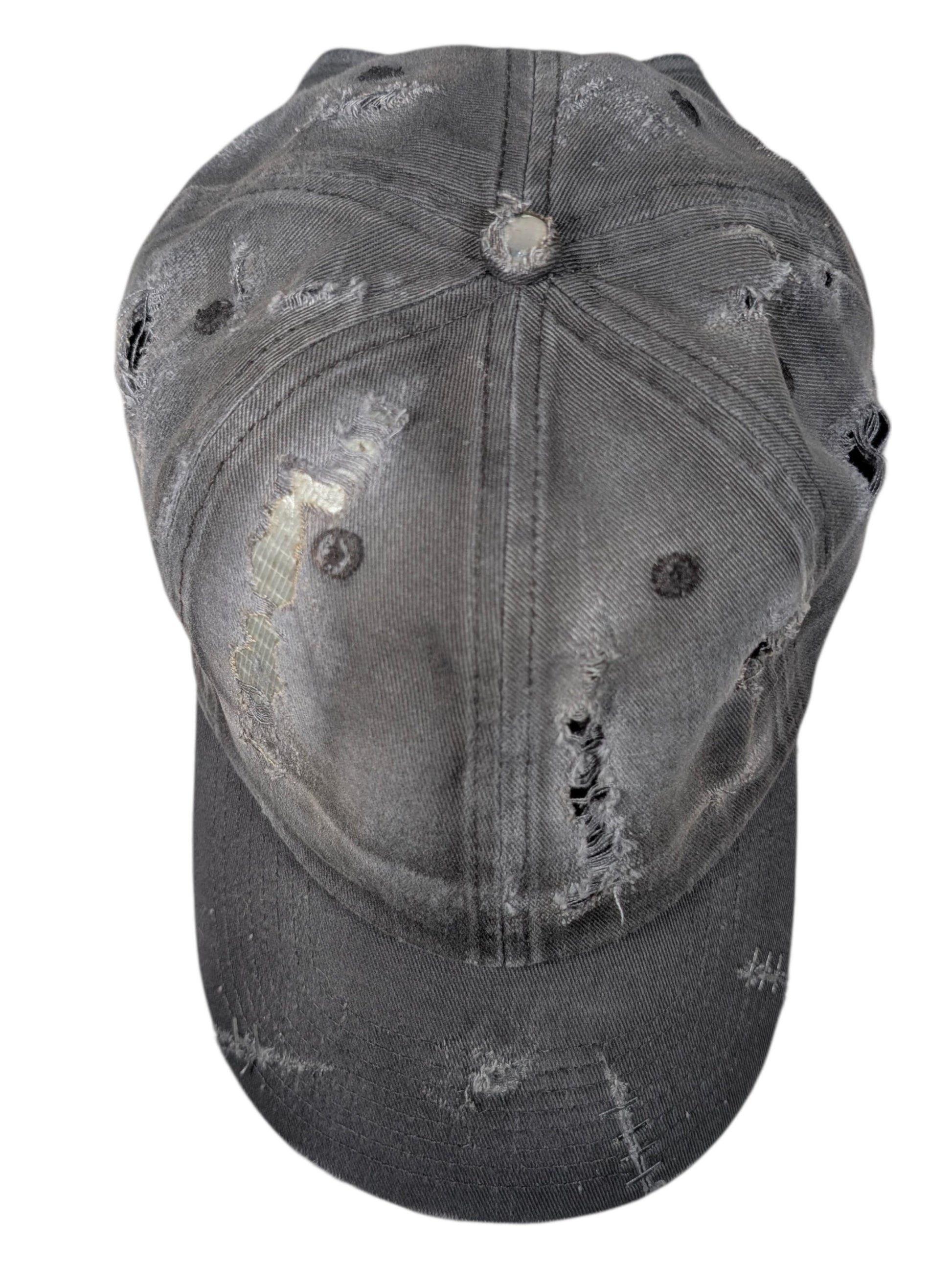 Apt. 1007 Repaired Work Hat (#118). One-of-one (1/1) handmade wearable artwork produced in the USA. This grey work capfeatures extensive repair and distressing work, including burn marks, reinforced areas, irregular hand-applied staple detailing, and visible wear throughout; all repairs, marks, fading, and construction details are intentional and unique to this piece (see photos).