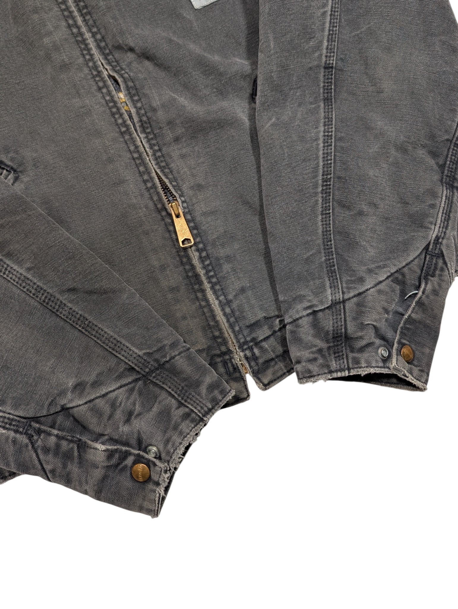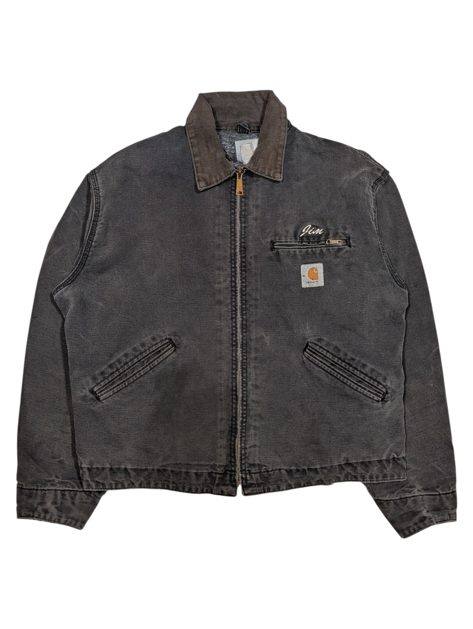 Vintage 1990s Carhartt Detroit work jacket in faded black (grey tone) denim. Features embroidered construction back graphic, name, blanket lining, and metal zipper front. Authentic Carhartt workwear silhouette with natural fading and wear throughout. Jim Name Embroidery, Commercial Erectors tractor workwear company embroidery.