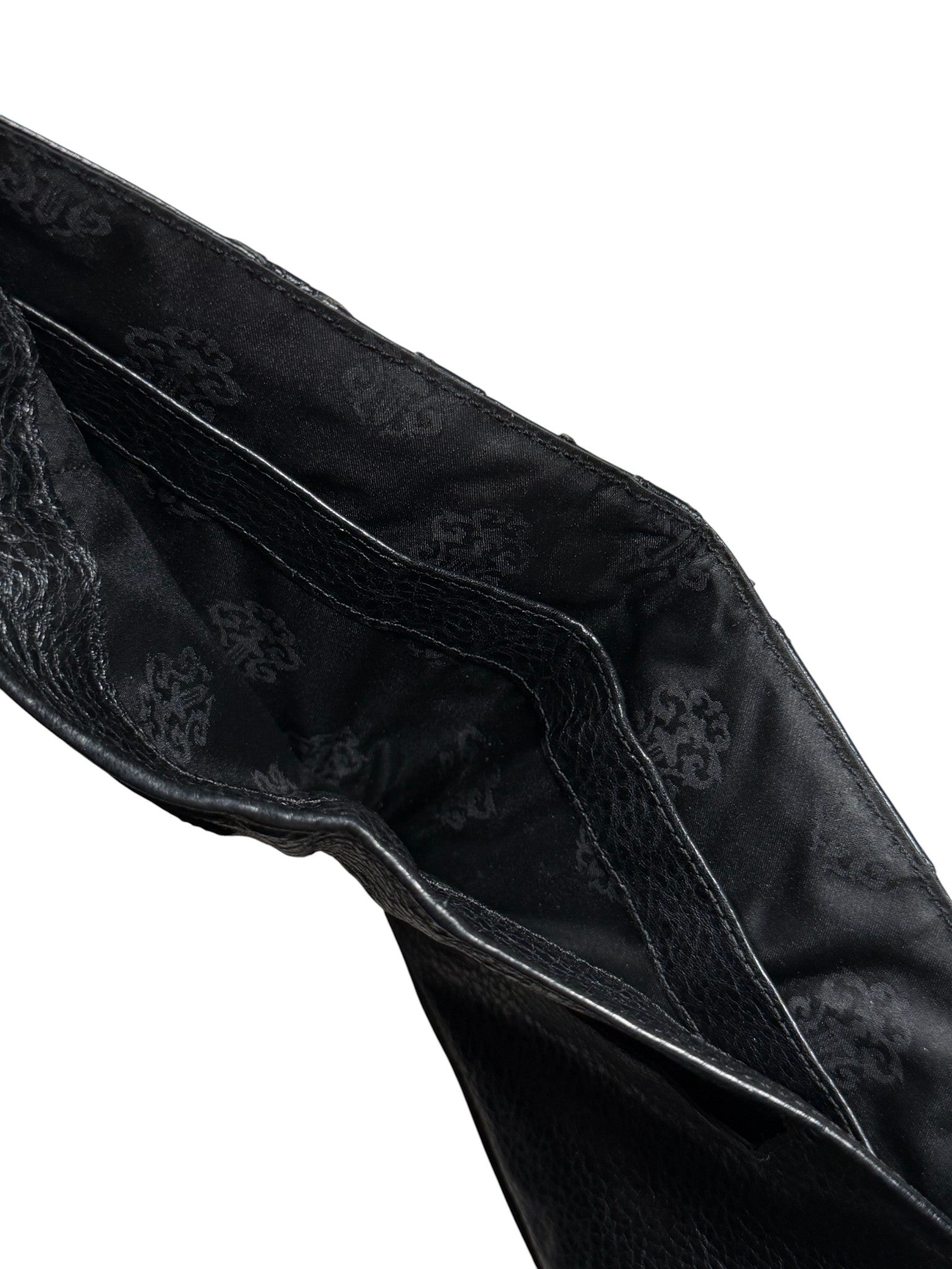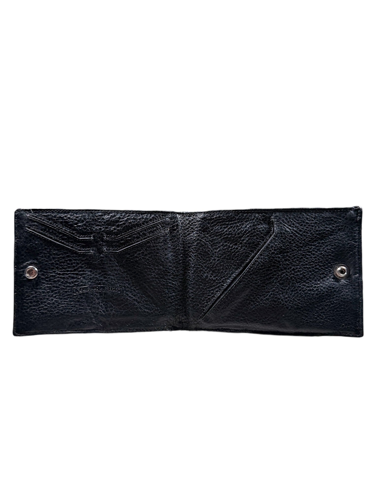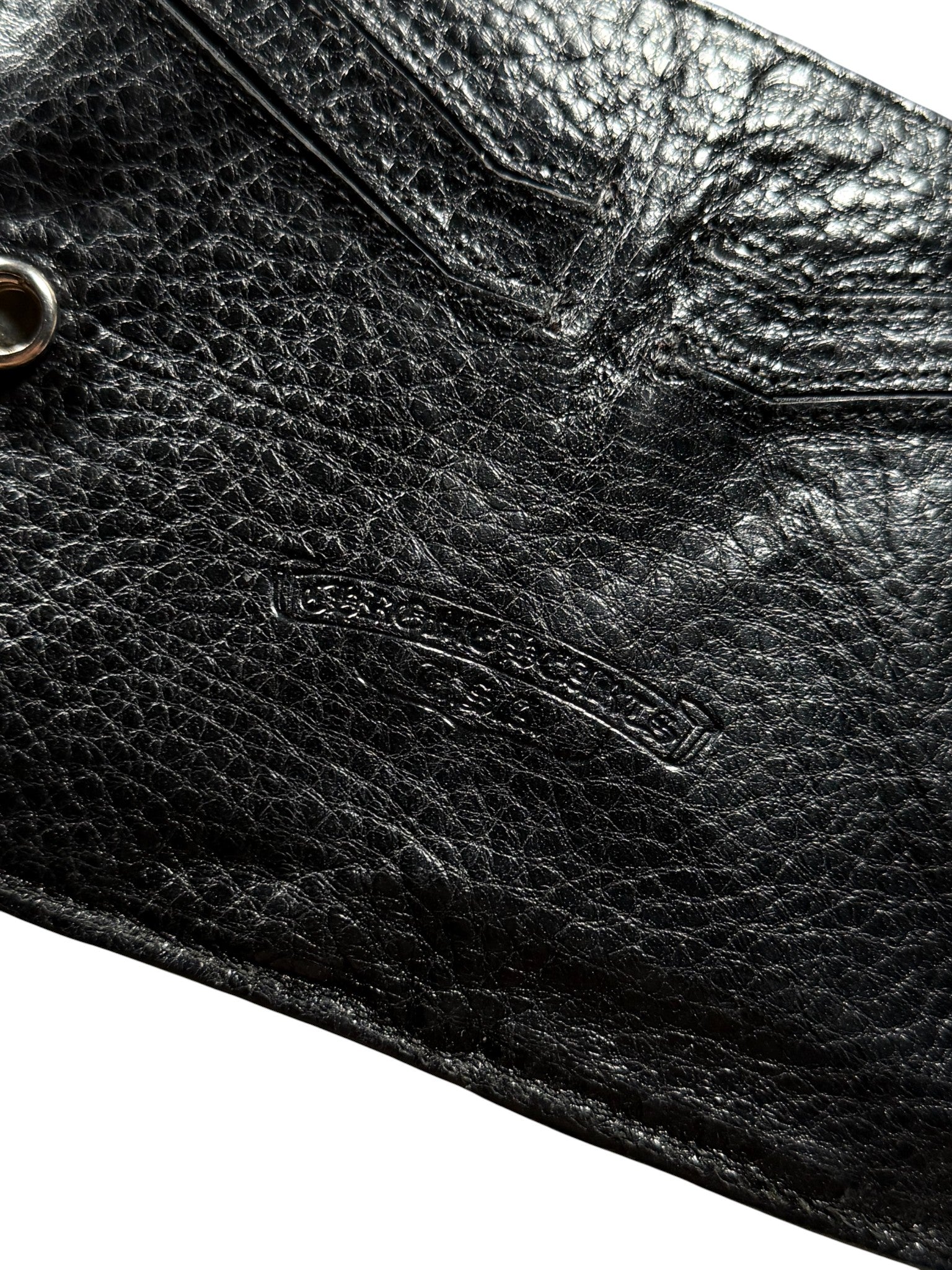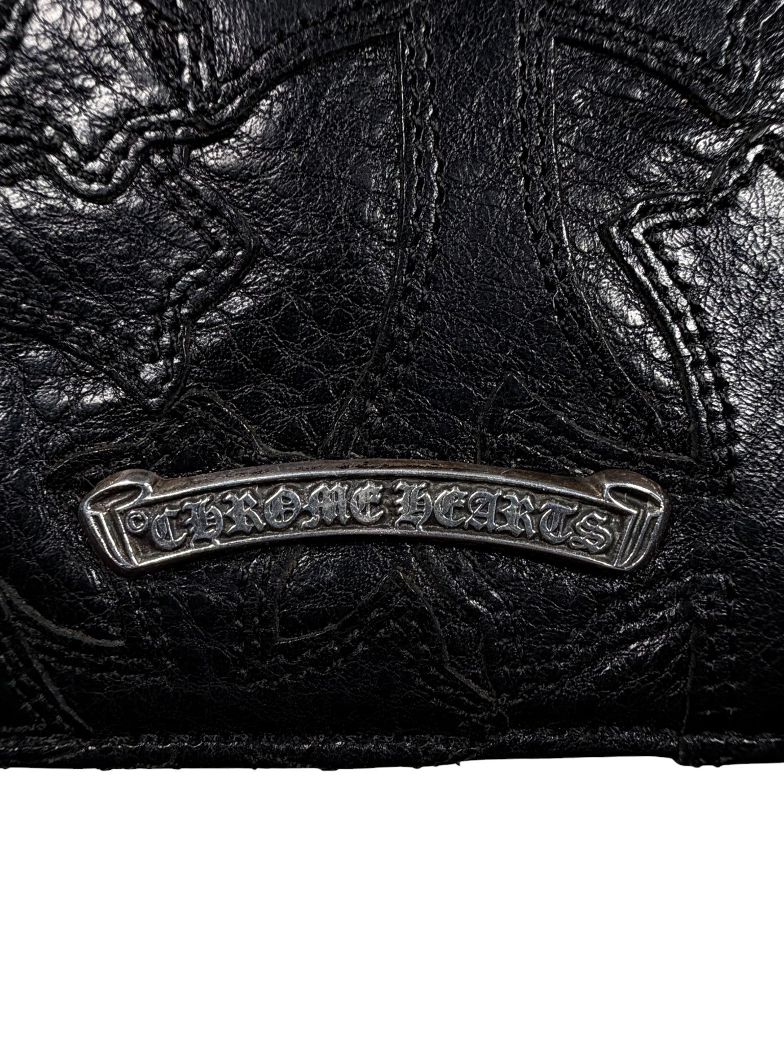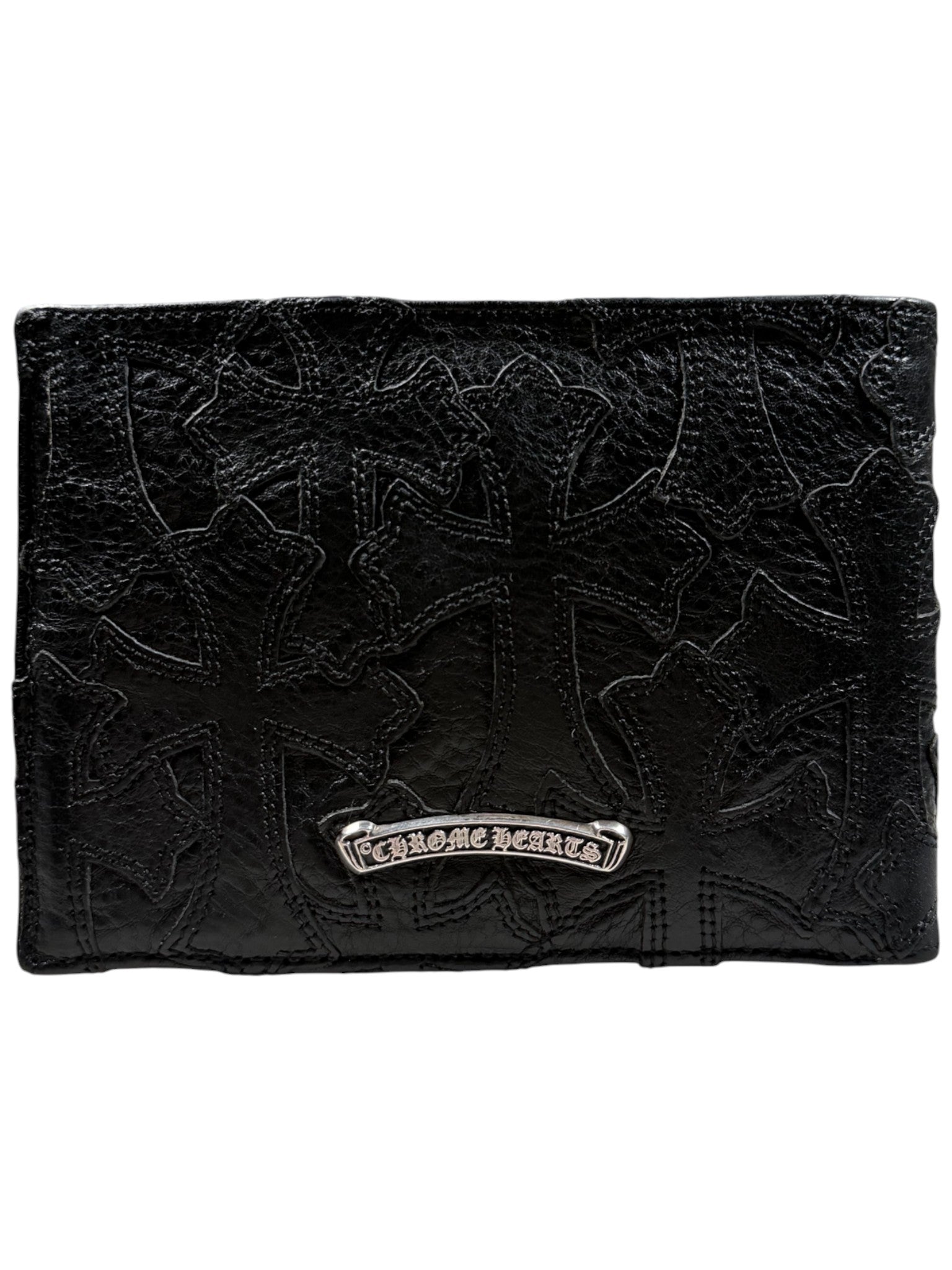 DETAILS: Chrome Hearts "Cashing Out" snap bi-fold wallet. A masterpiece of leatherwork featuring a complex Cemetery Cross Patch motif with multiple hand-stitched leather crosses layered across the exterior. Crafted from premium, heavy-duty black leather by hand in Los Angeles. Features a secur snap button closure with a signature .925 sterling silver CH Horseshoe button. The interior is designed for high-utility organization, fitting more than the average bifold, large receipts, and more making it a very collectible and practical daily driver. Amazing condition. Made in the USA.