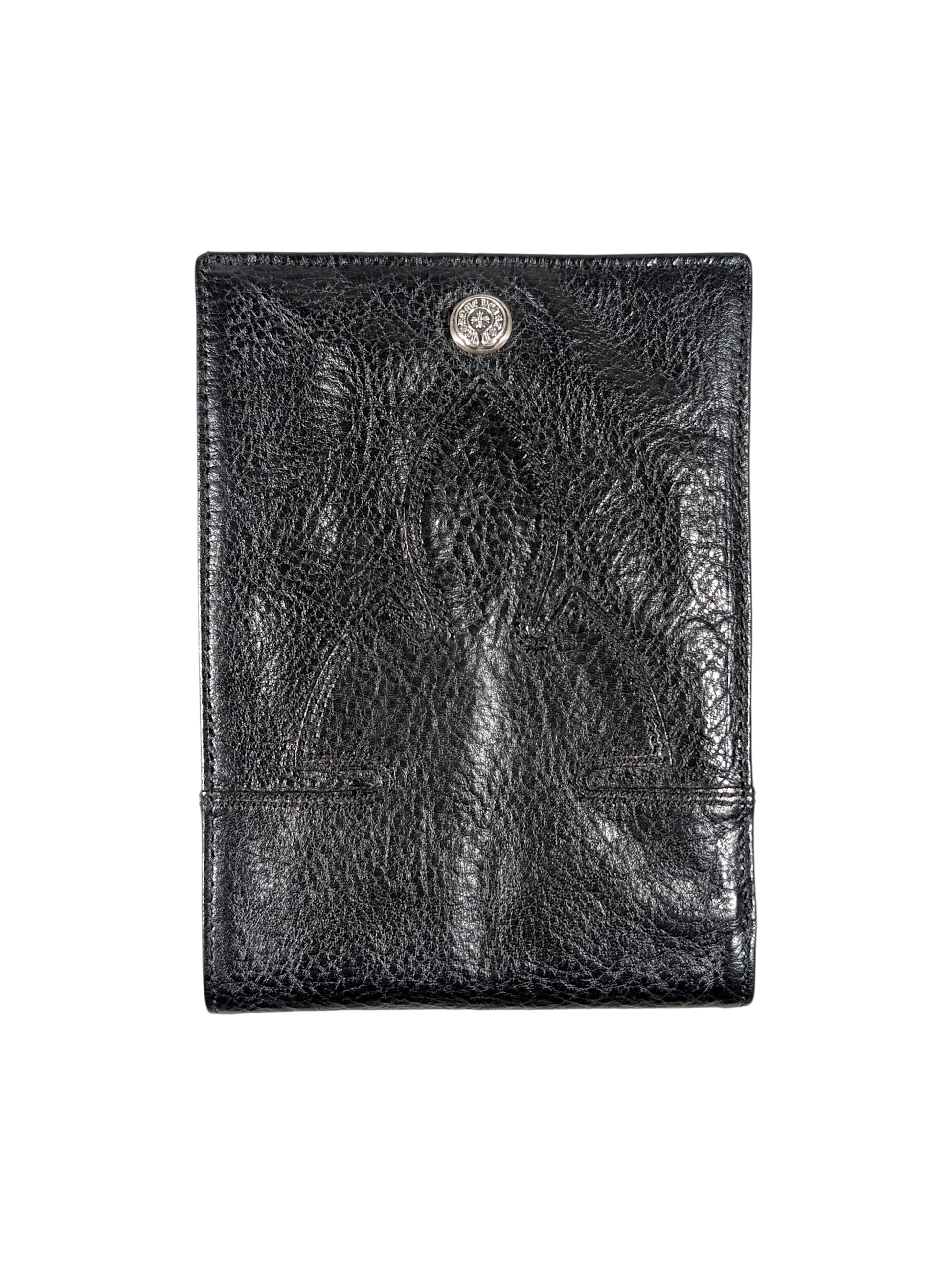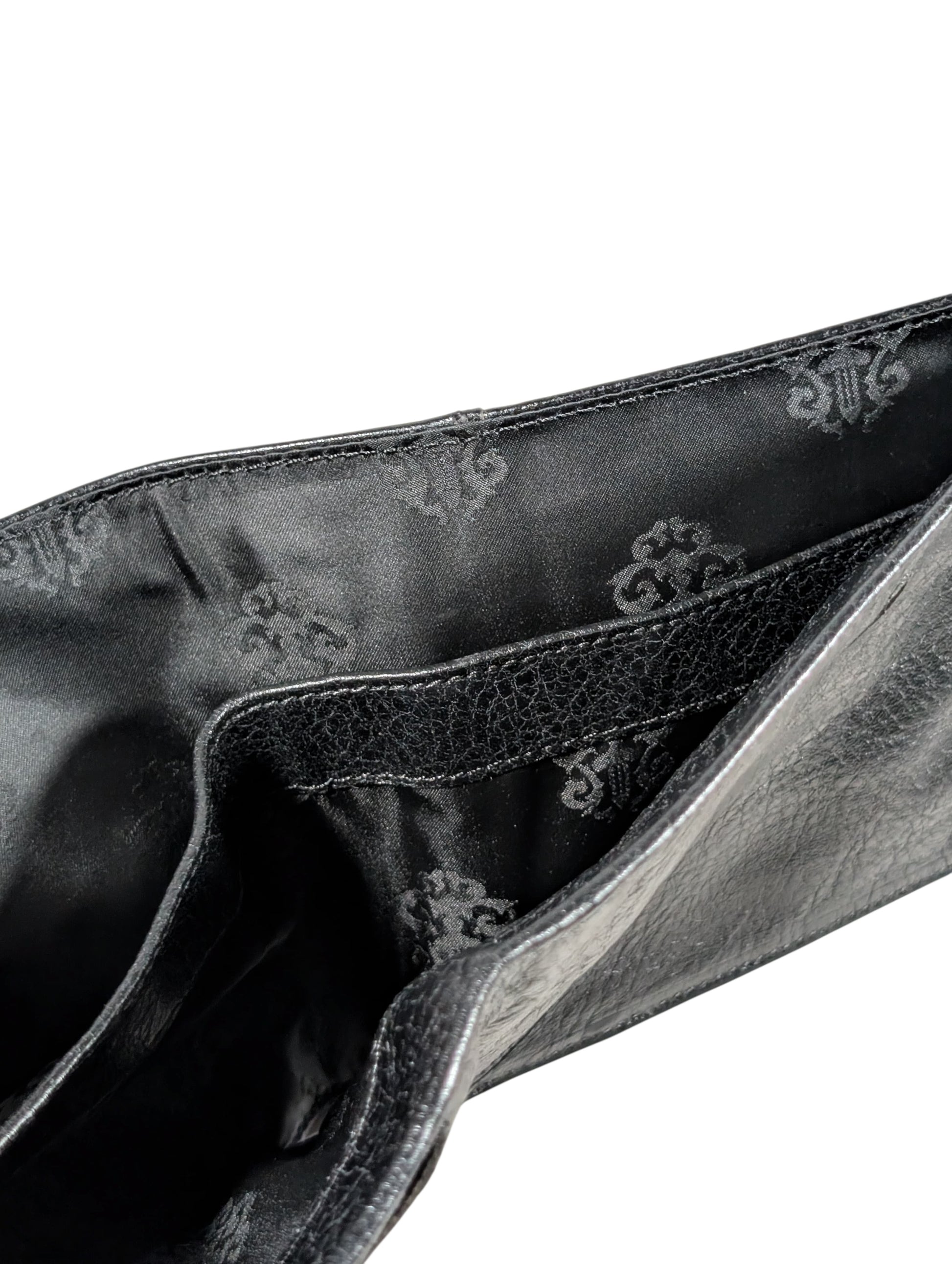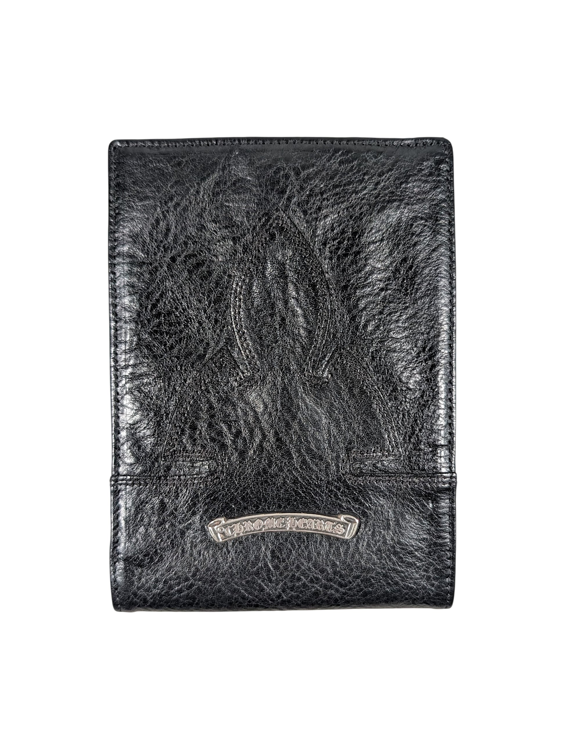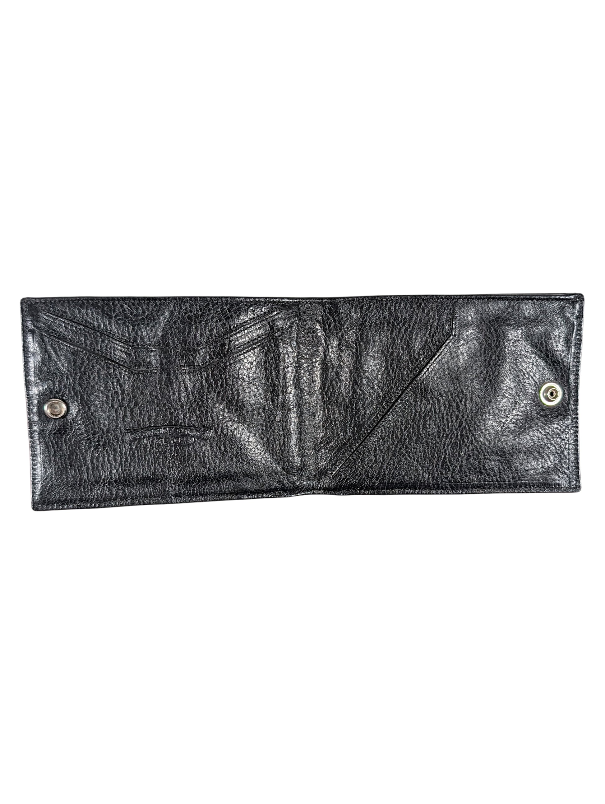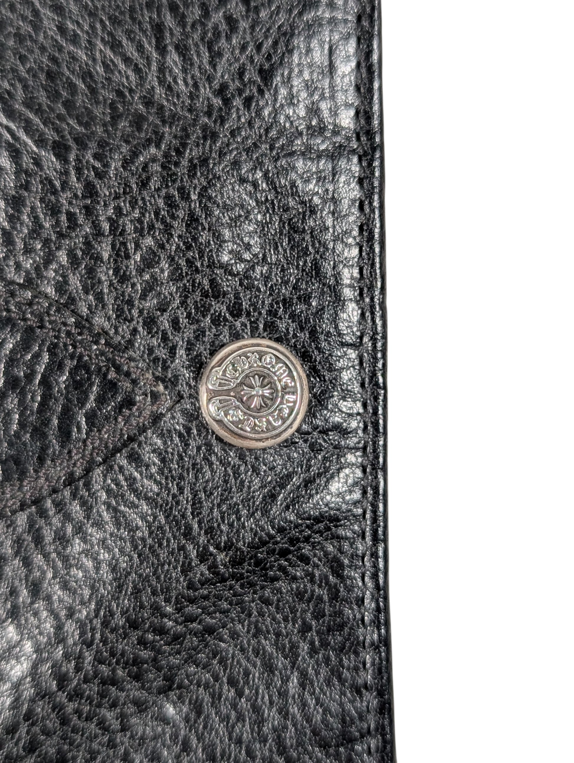 Chrome Hearts Fleur Bi-Fold Snap Wallet in heavy black leather with CH Fleur Motif . Features .925 sterling silver snap closure and sterling silver Chrome Hearts logo plaque. Rare variation of the “Ain’t Nothing 2 Do” wallet.