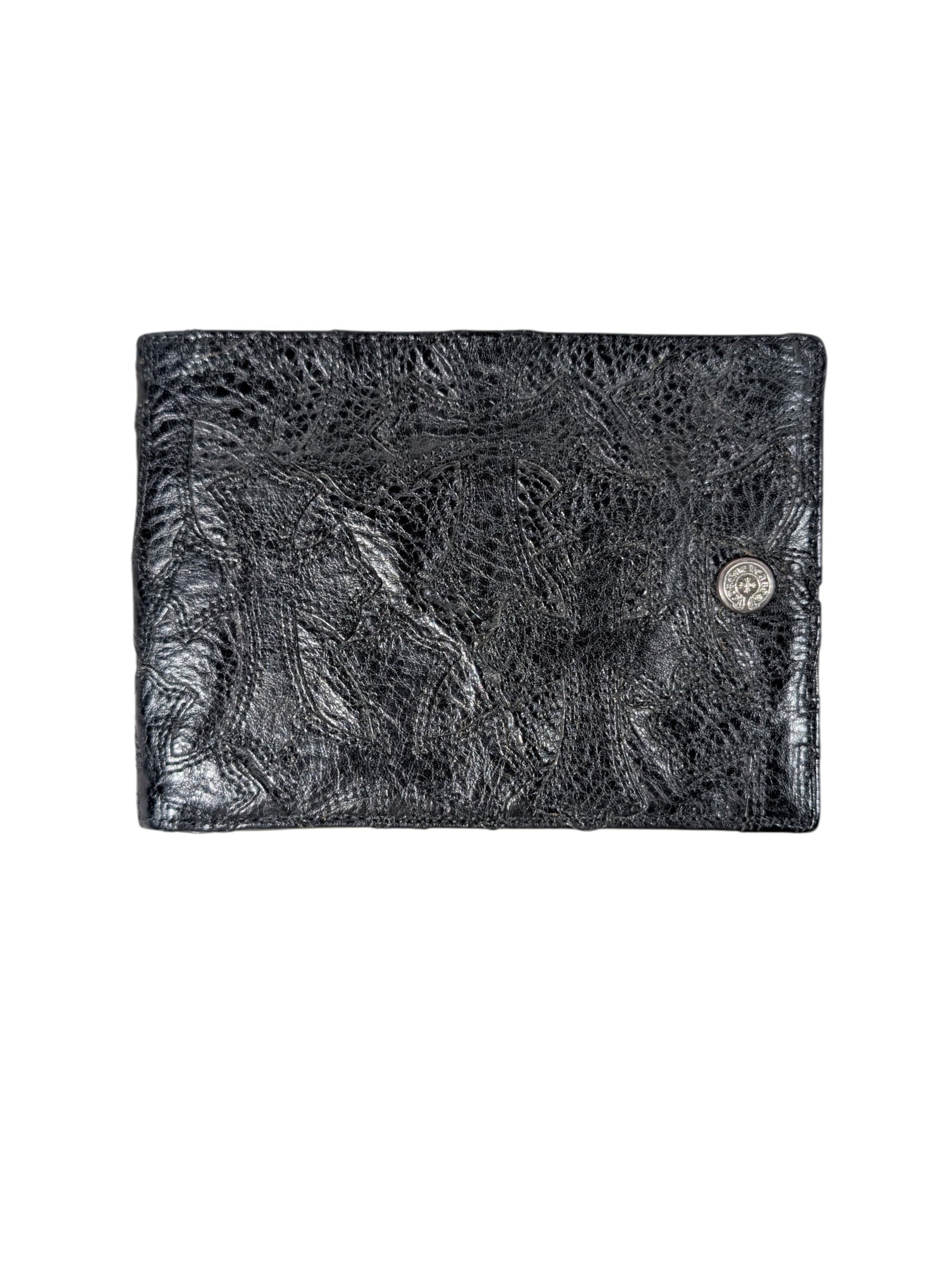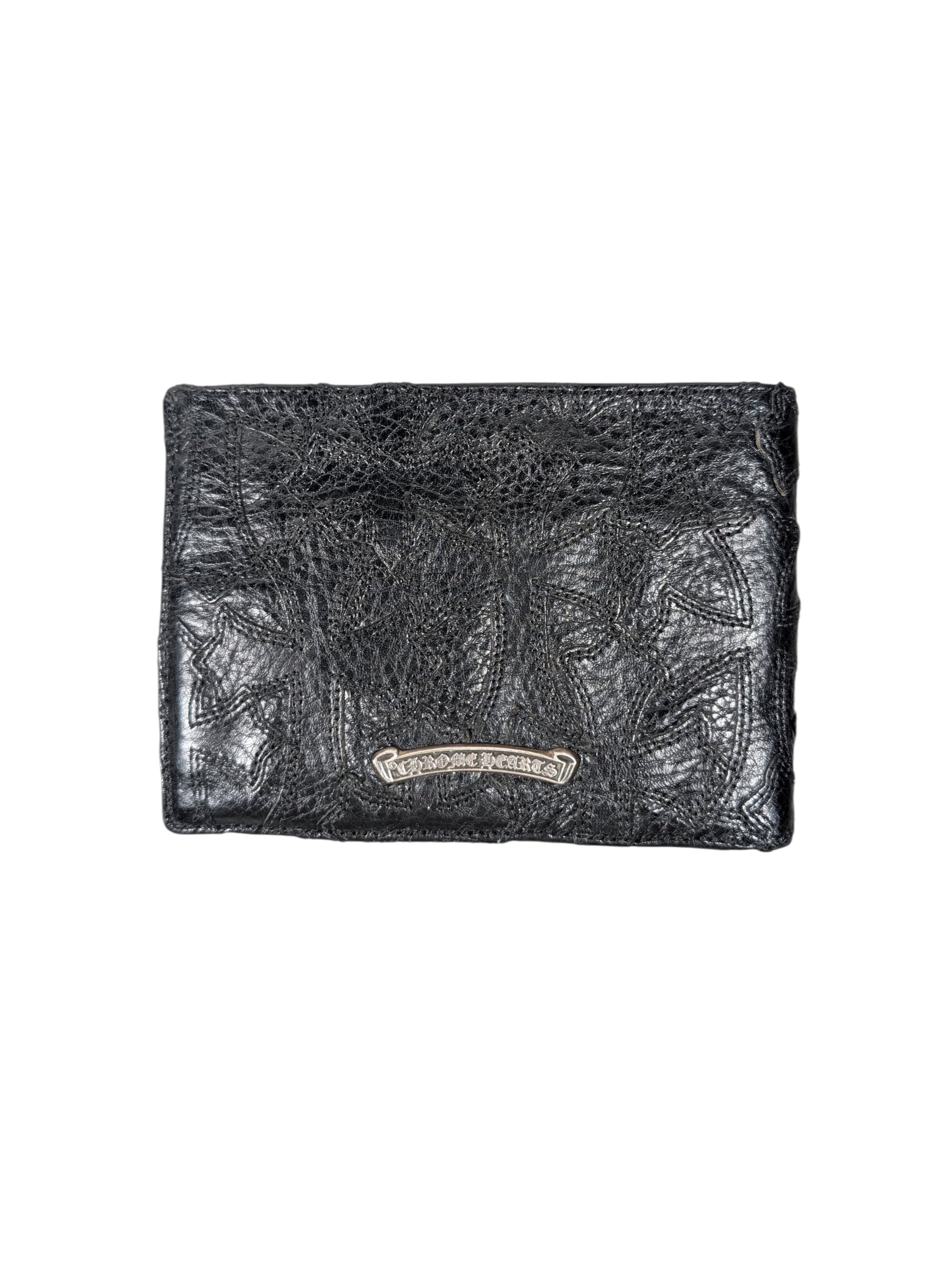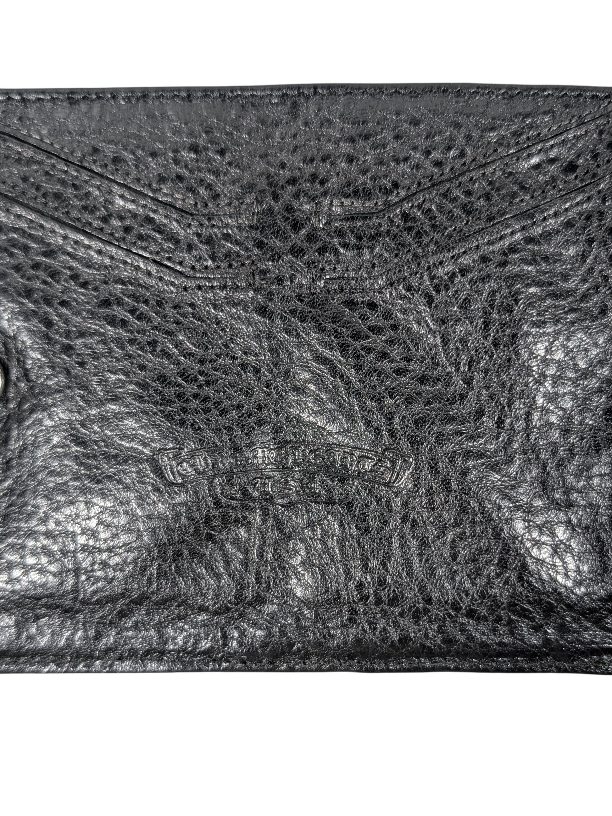 Chrome Hearts "Ain’t Nothing 2 Do" Bi-Fold Wallet in black leather, fully flooded with cemetery cross patches. Features a .925 sterling silver snap closure and multi-pocket interior. A large bifold that can fit large bills, cards and more Rare and highly collectible CH silhouette.