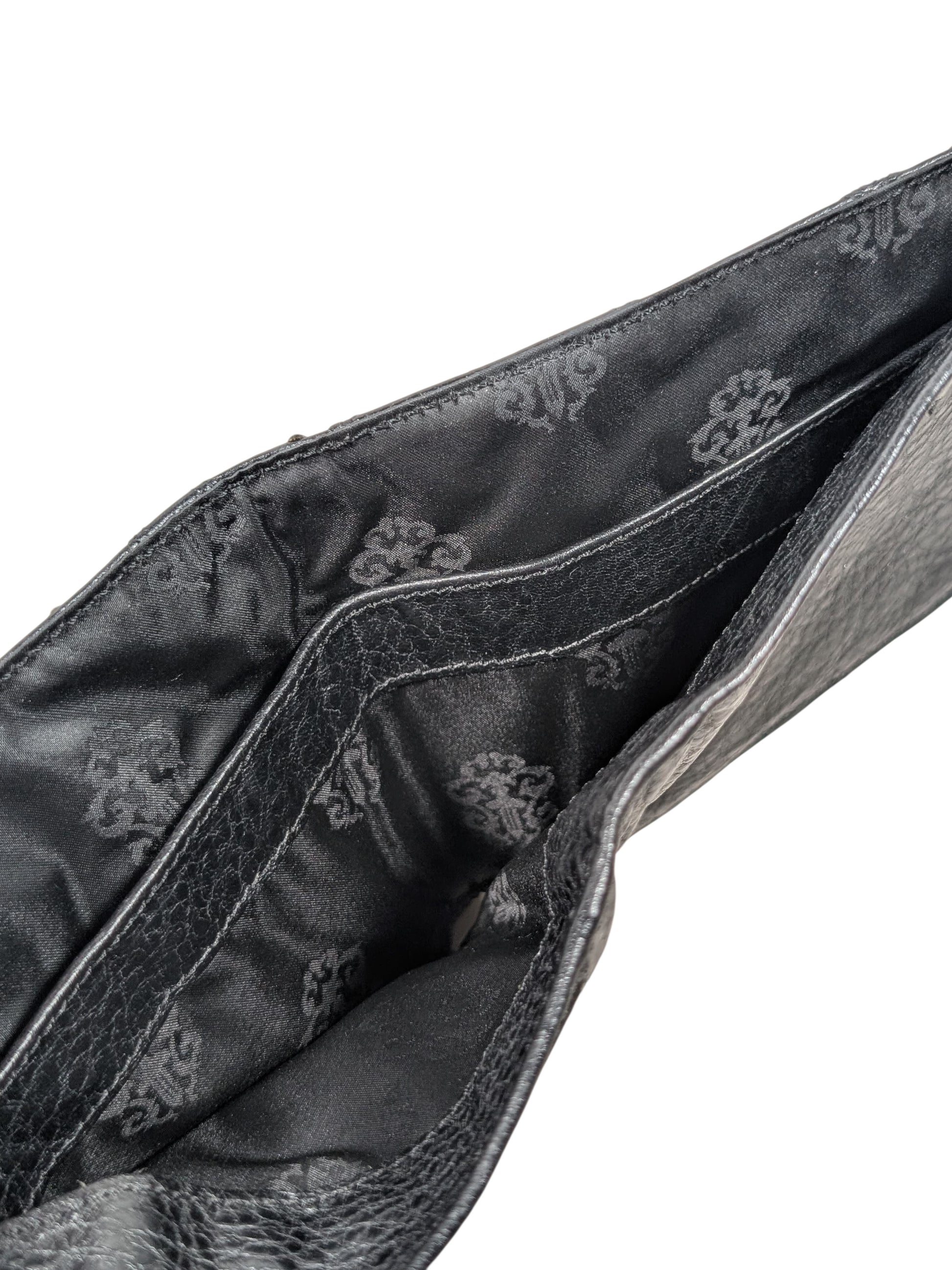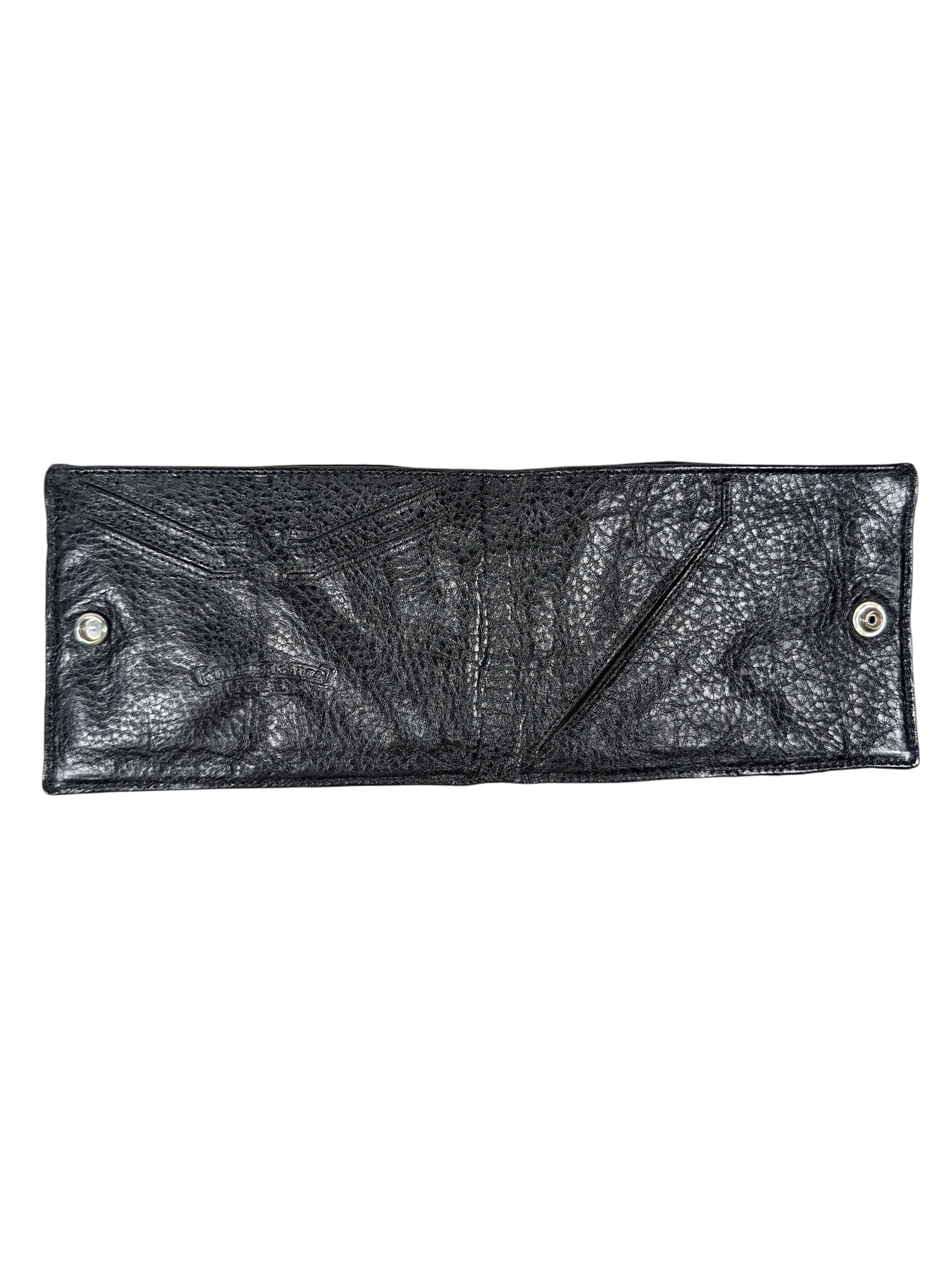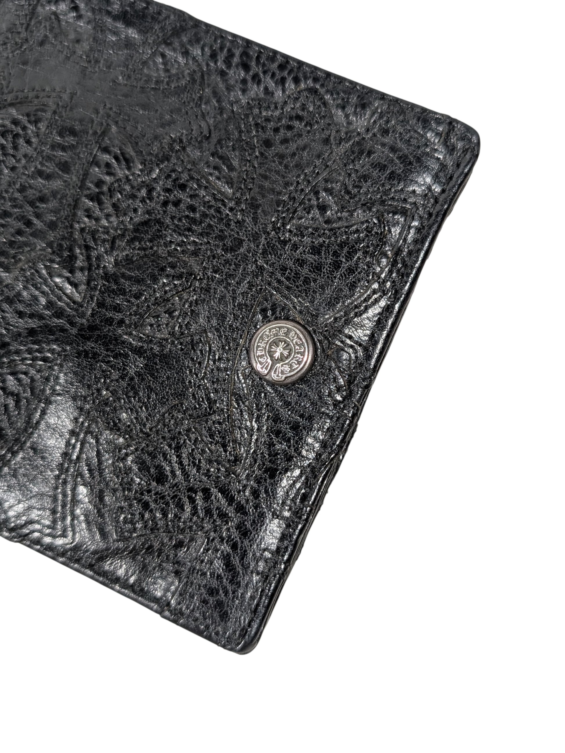 Chrome Hearts "Ain’t Nothing 2 Do" Bi-Fold Wallet in black leather, fully flooded with cemetery cross patches. Features a .925 sterling silver snap closure and multi-pocket interior. A large bifold that can fit large bills, cards and more Rare and highly collectible CH silhouette.