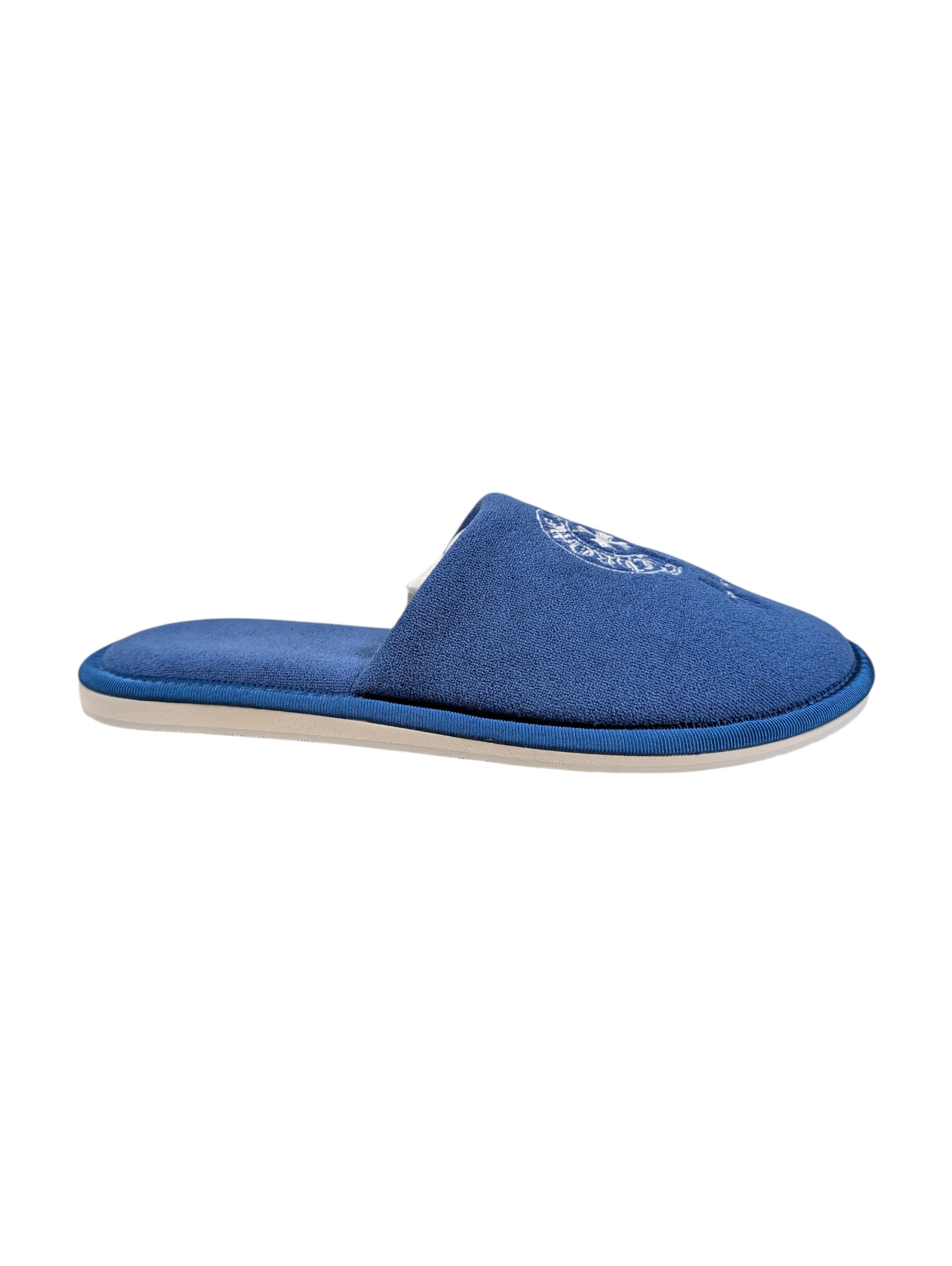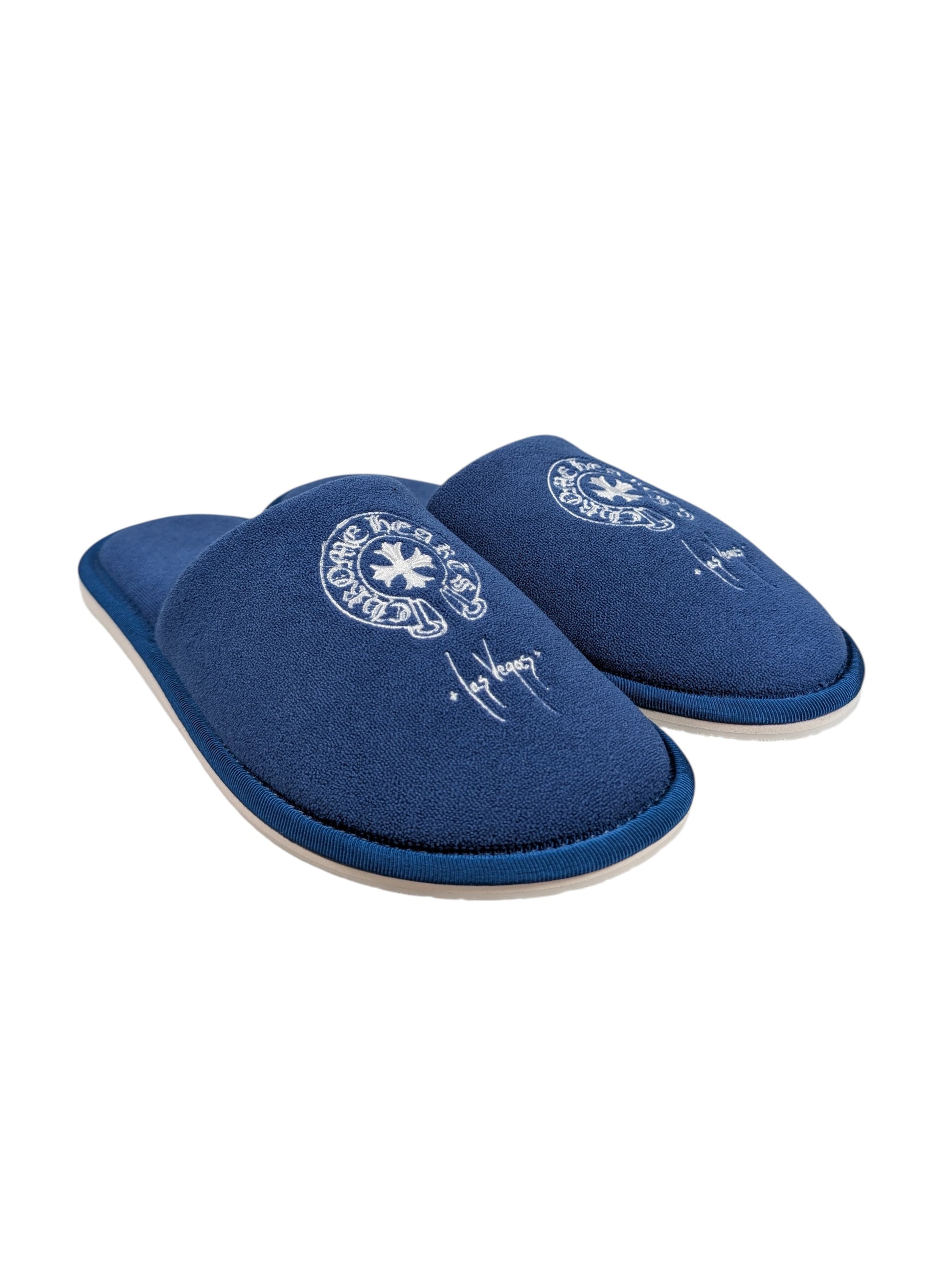 Chrome Hearts Las Vegas Exclusive luxury slippers in blue with embroidered plus cross and logo details with white sole.