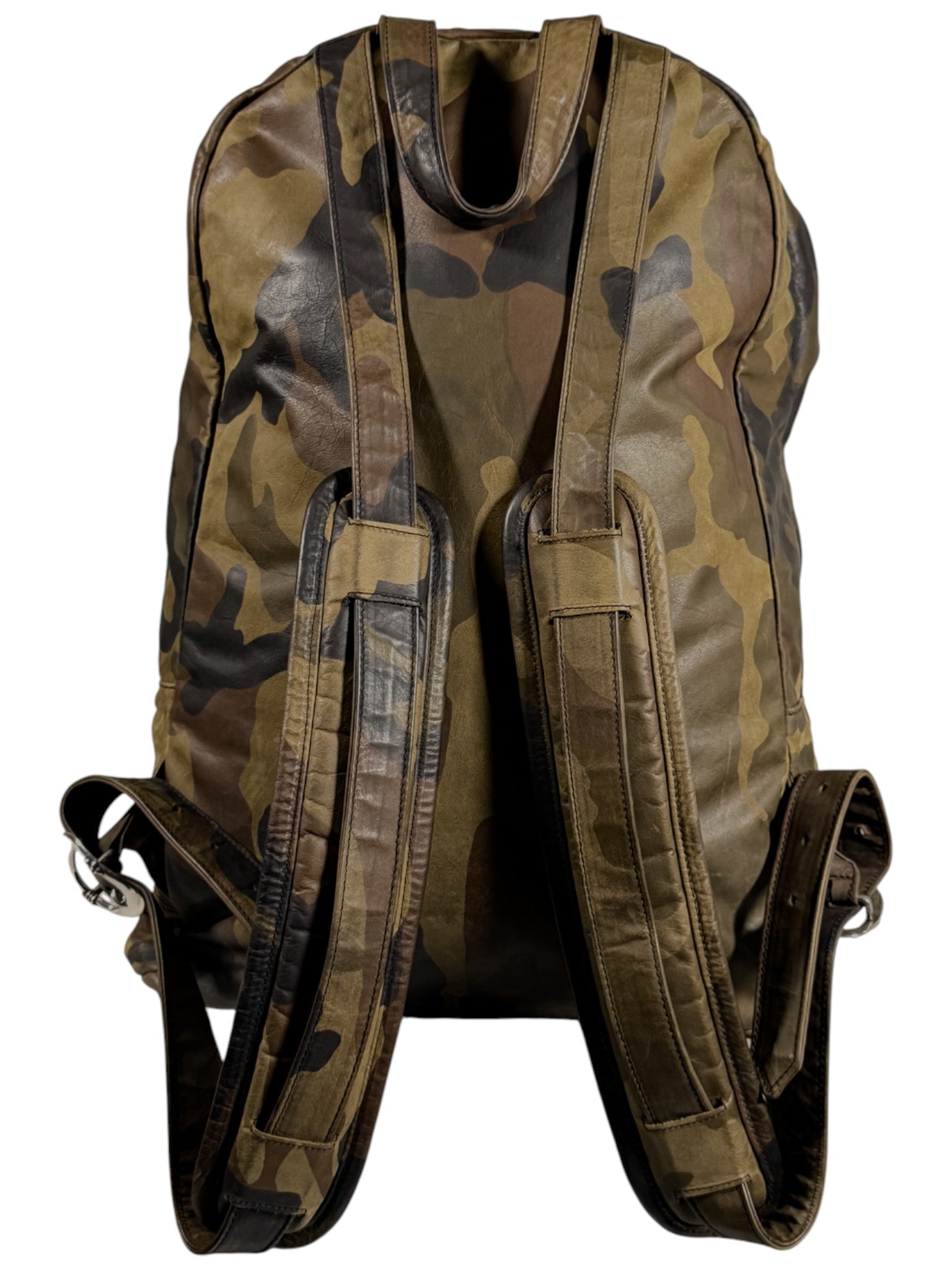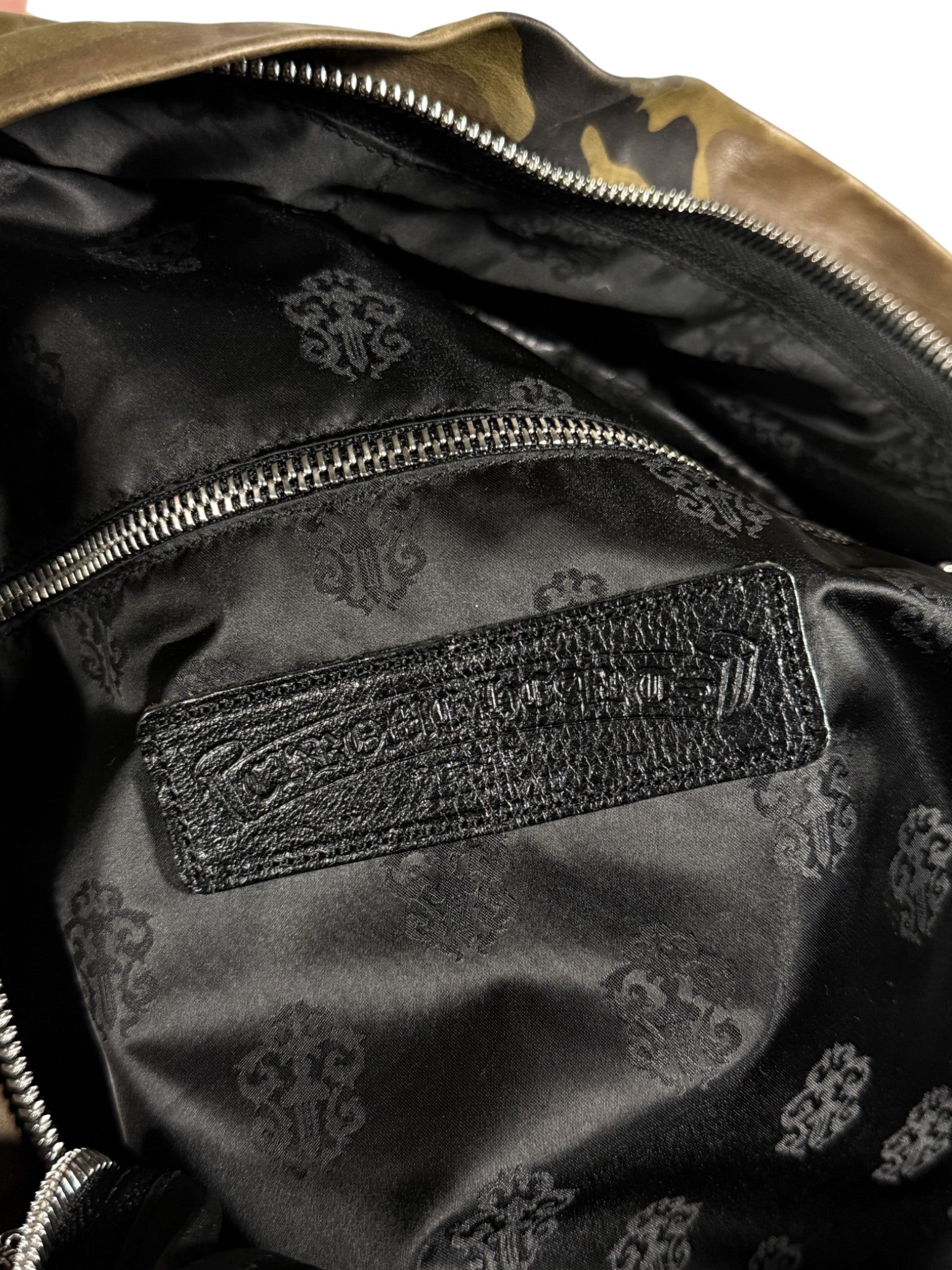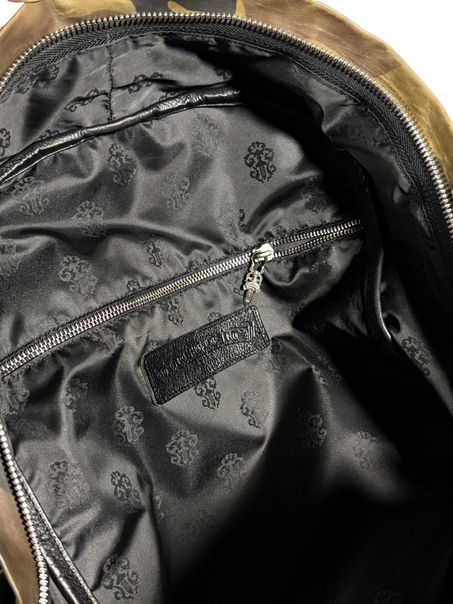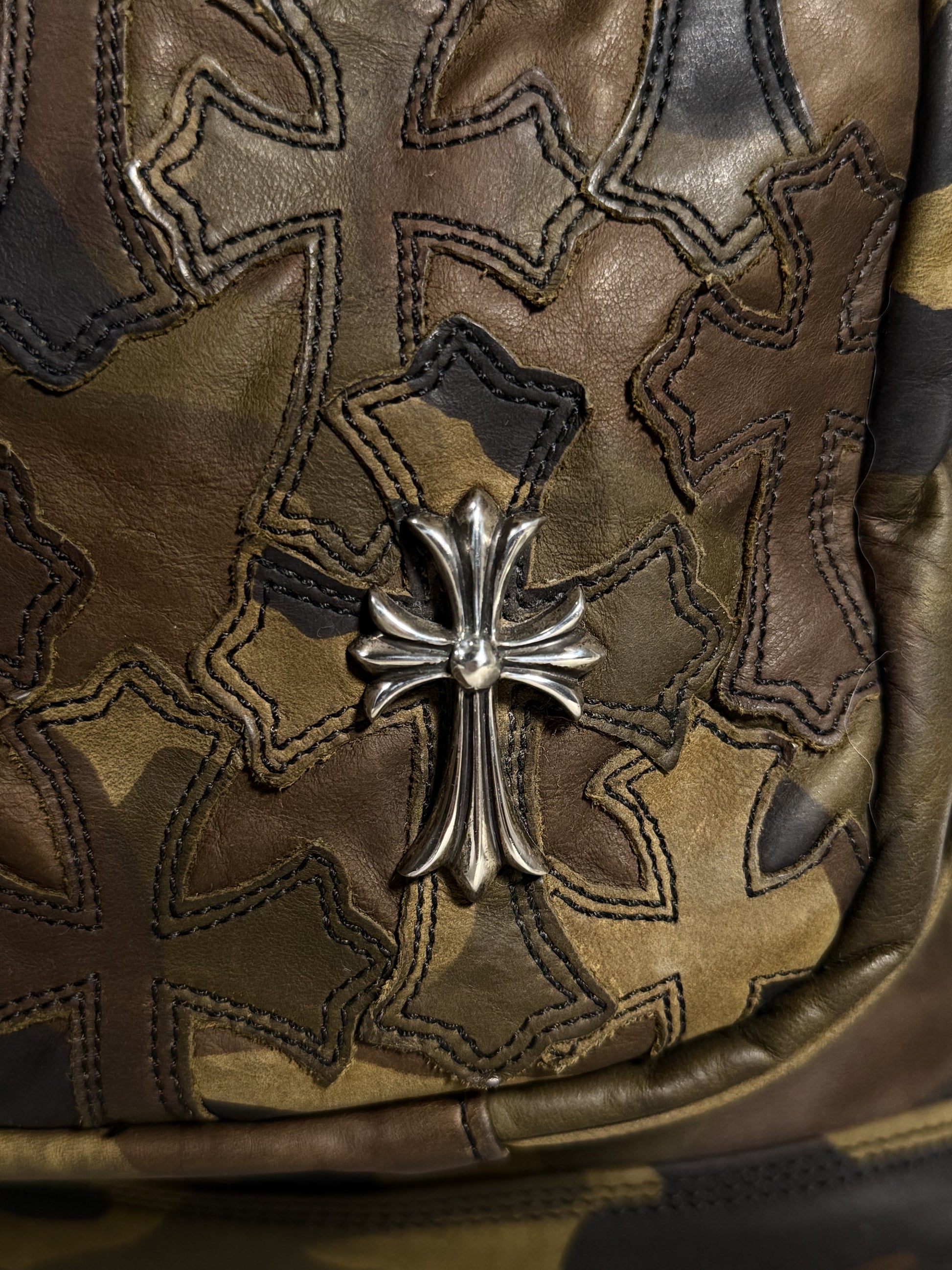 DETAILS: Chrome Hearts "7th Grade" Backpack in an extremely rare green camo colorway. Cemetery Cross Patches all over the front. Currently the only one on the market. This highly functional bag features .925 sterling silver CH hardware throughout. Small cross embellishment on the front, dagger zippers inside and out, and gunslinger buckles on the padded shoulder straps. Finished with an embroidered silk interior and zipper pockets for extra storage. A true gem.