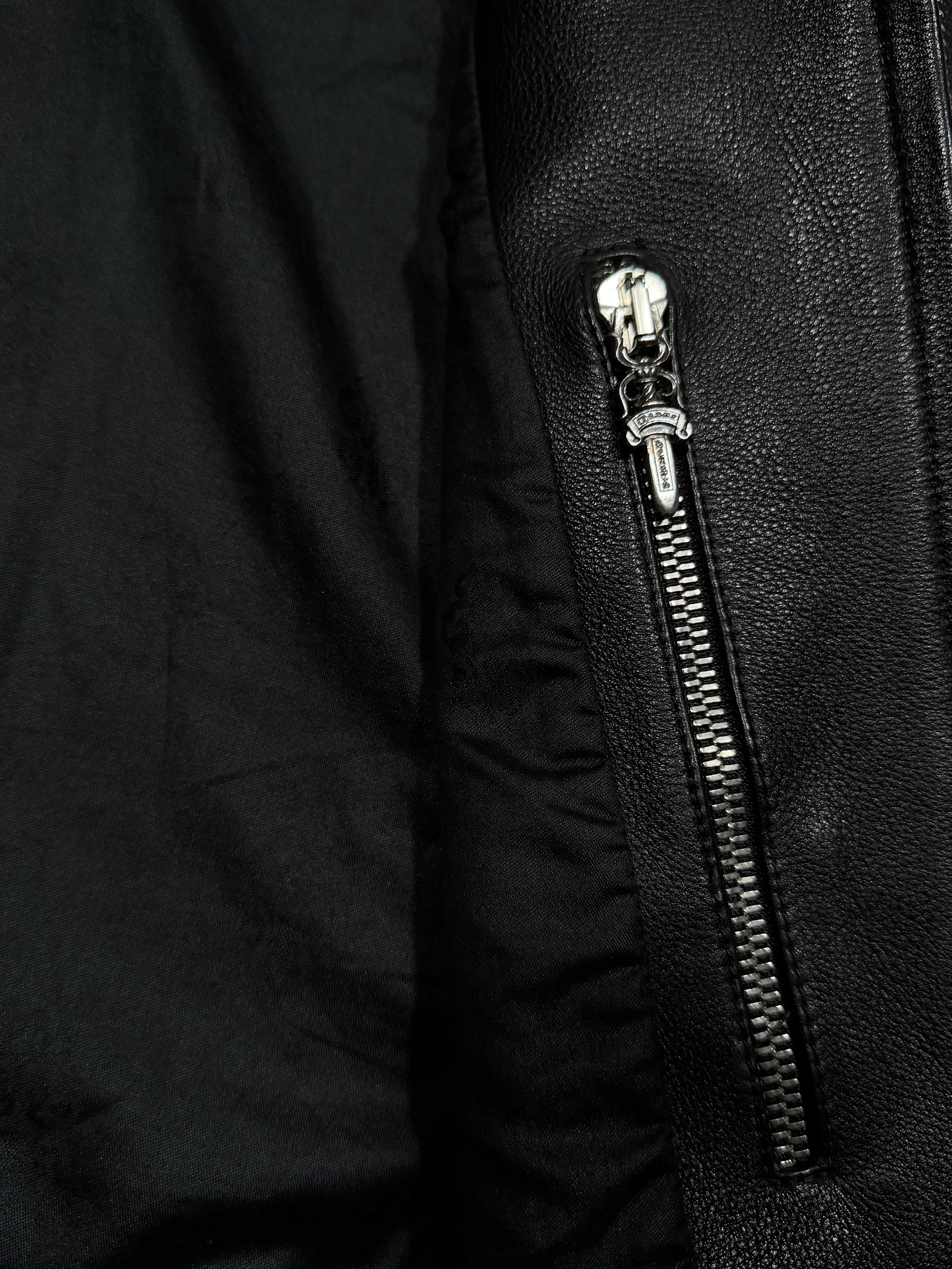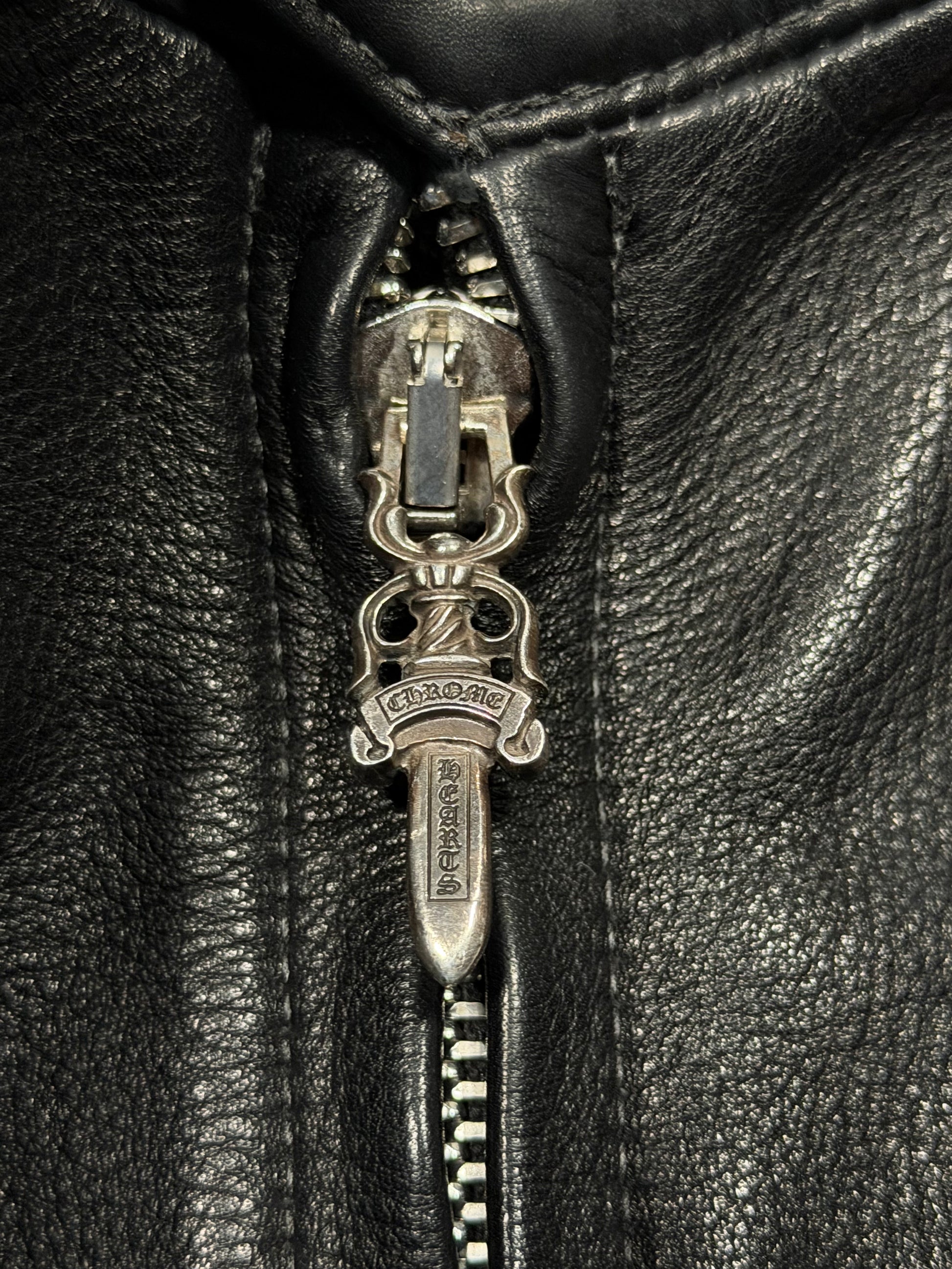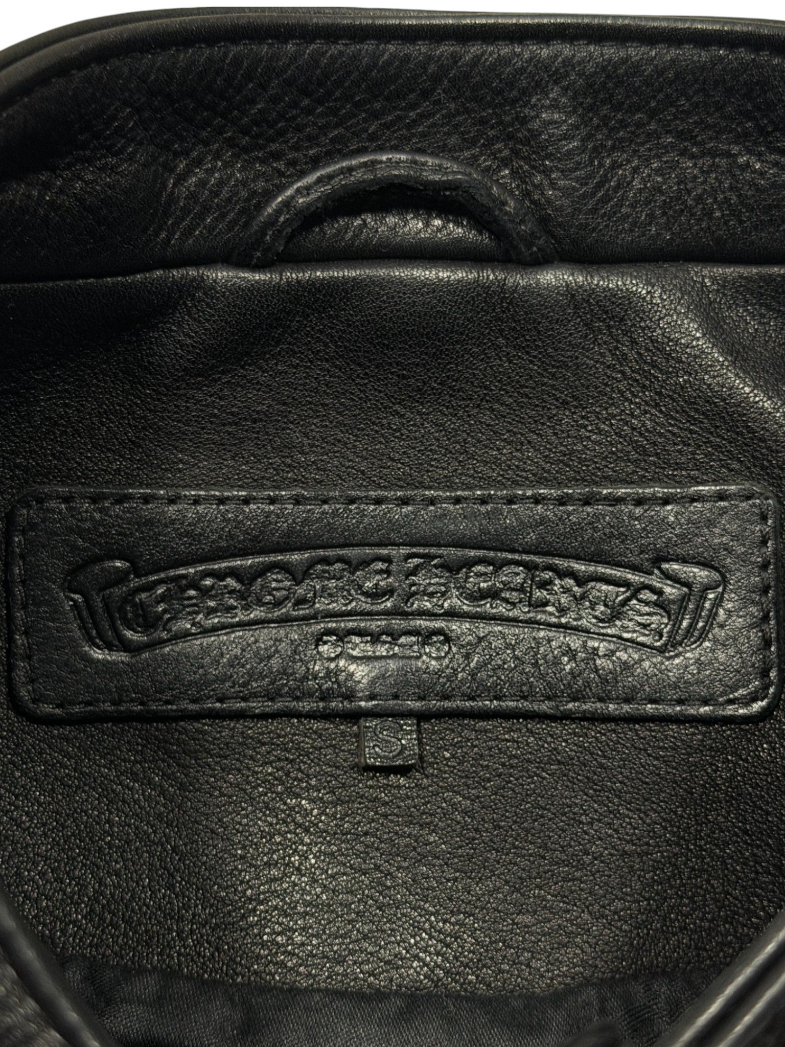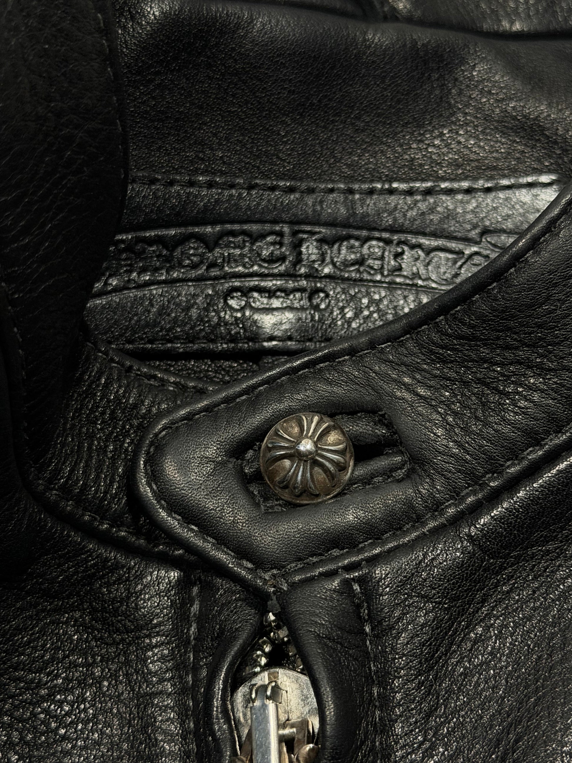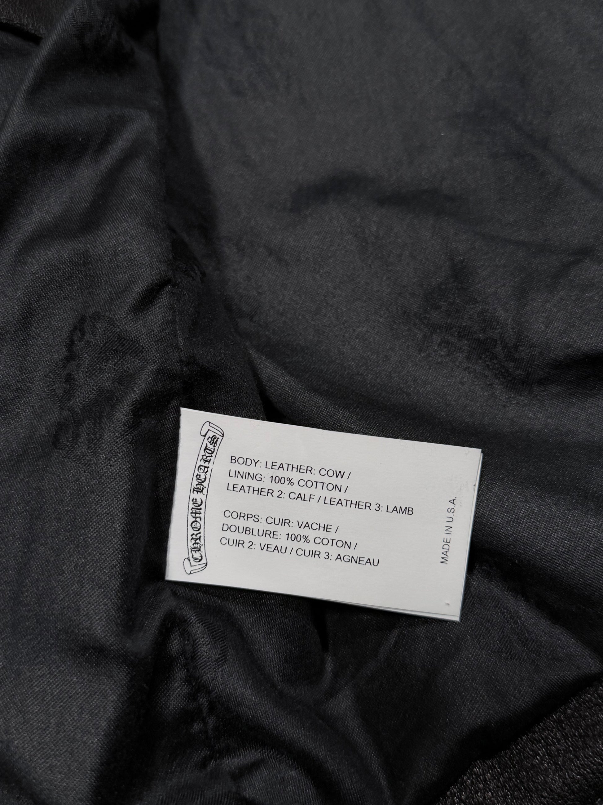 DETAILS: Chrome Hearts Leather Racing Jacket. Features bold red and white leather racing stripes on black leather. Triple red and white cemetery cross patches on the chest. Finished with CH .925 sterling silver hardware, dagger zippers and a crossball button neck closure. A true gem of a collectionpiece.