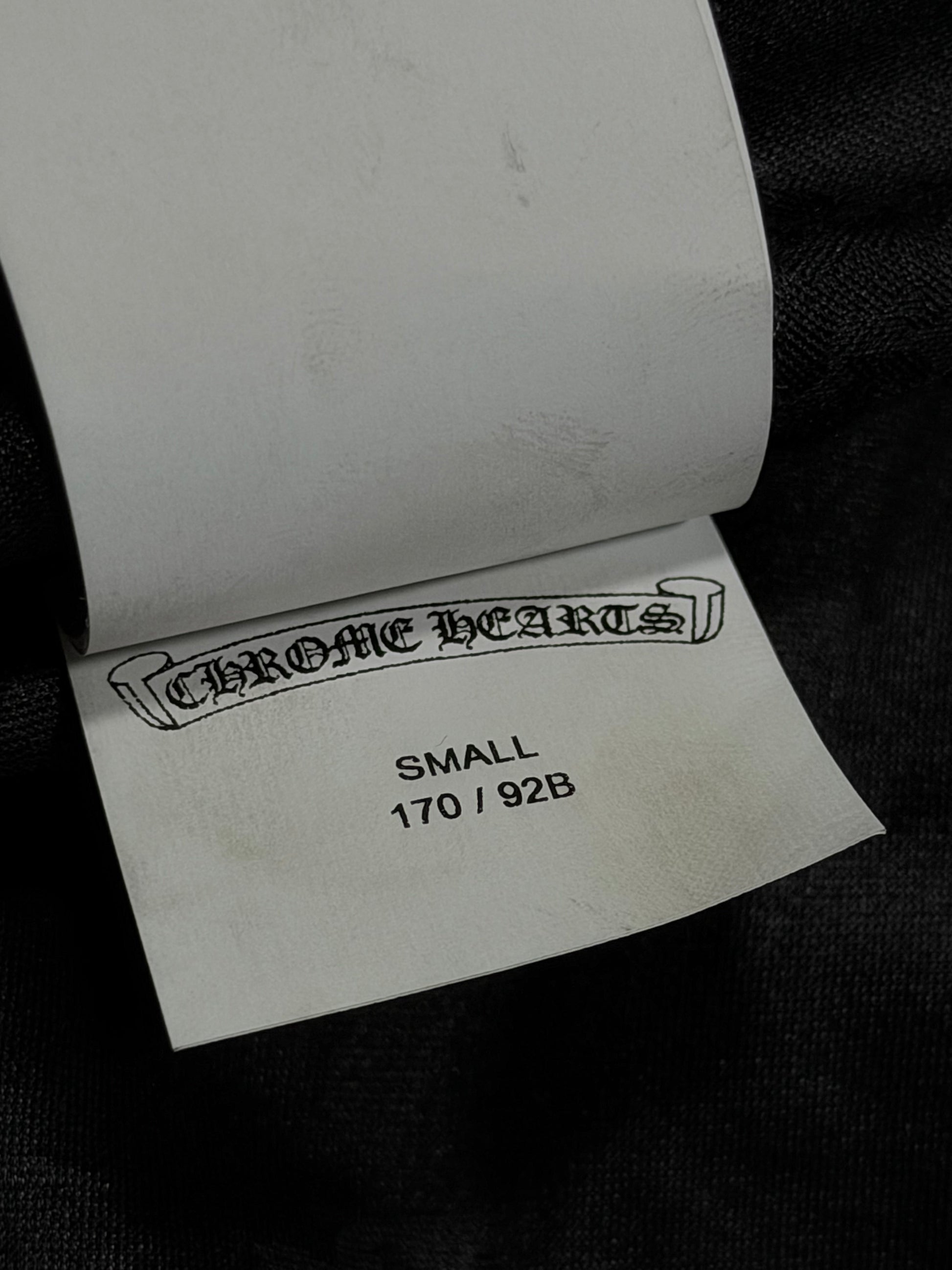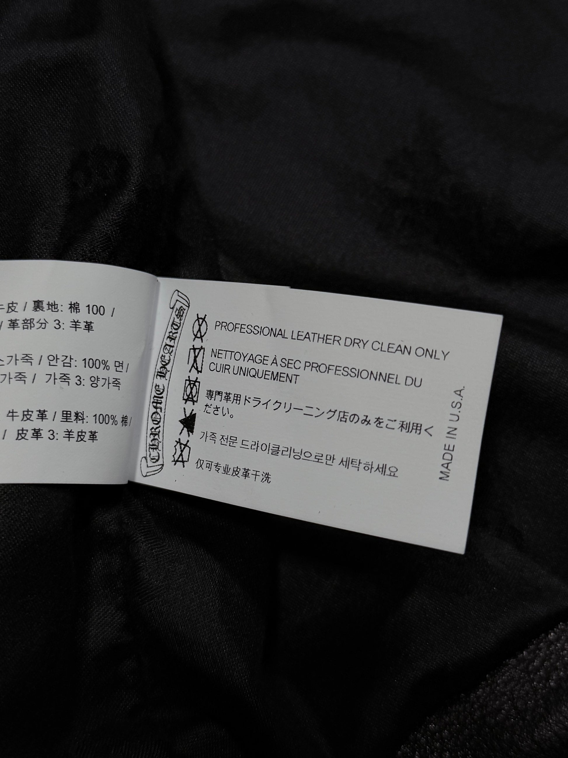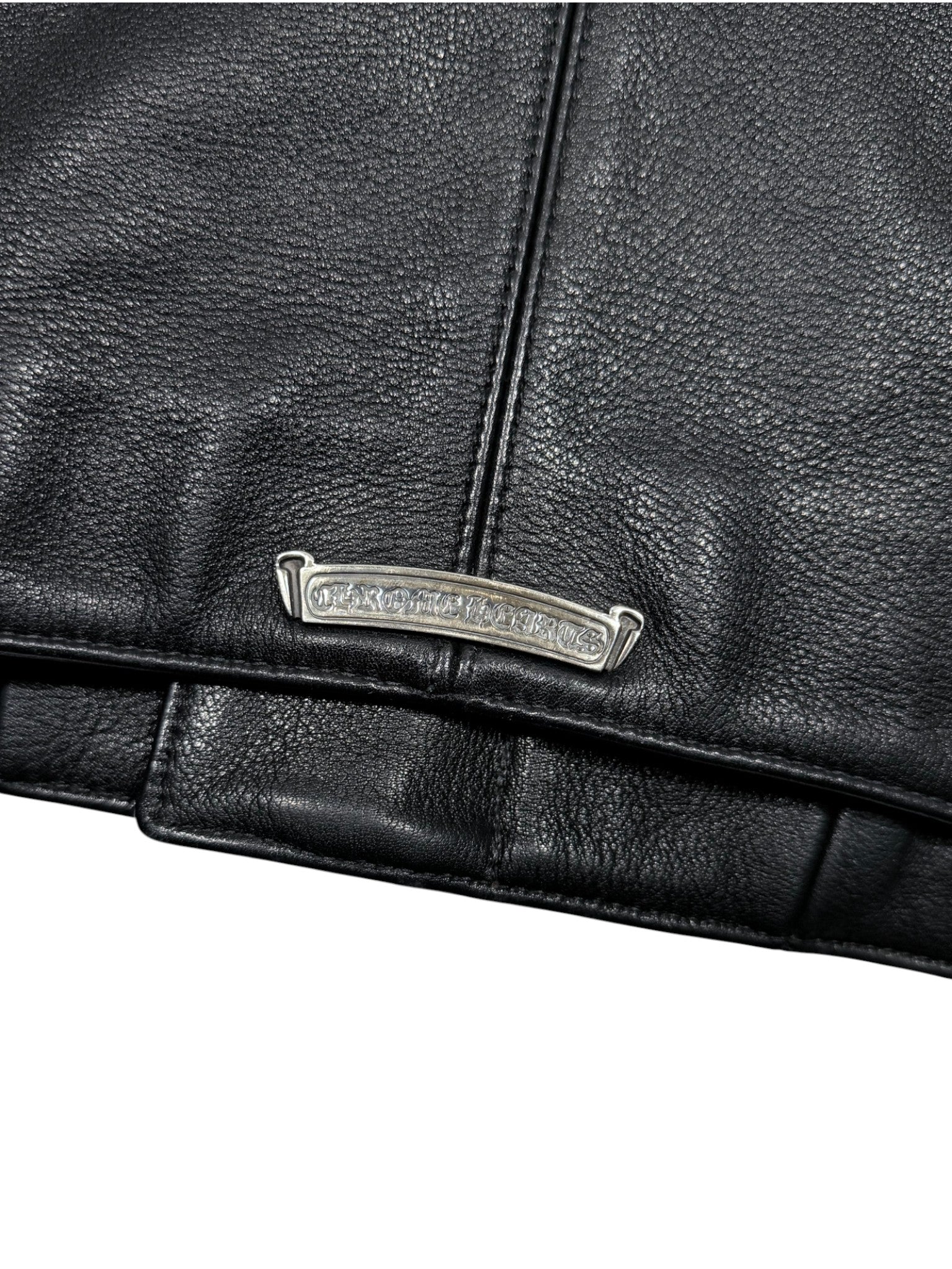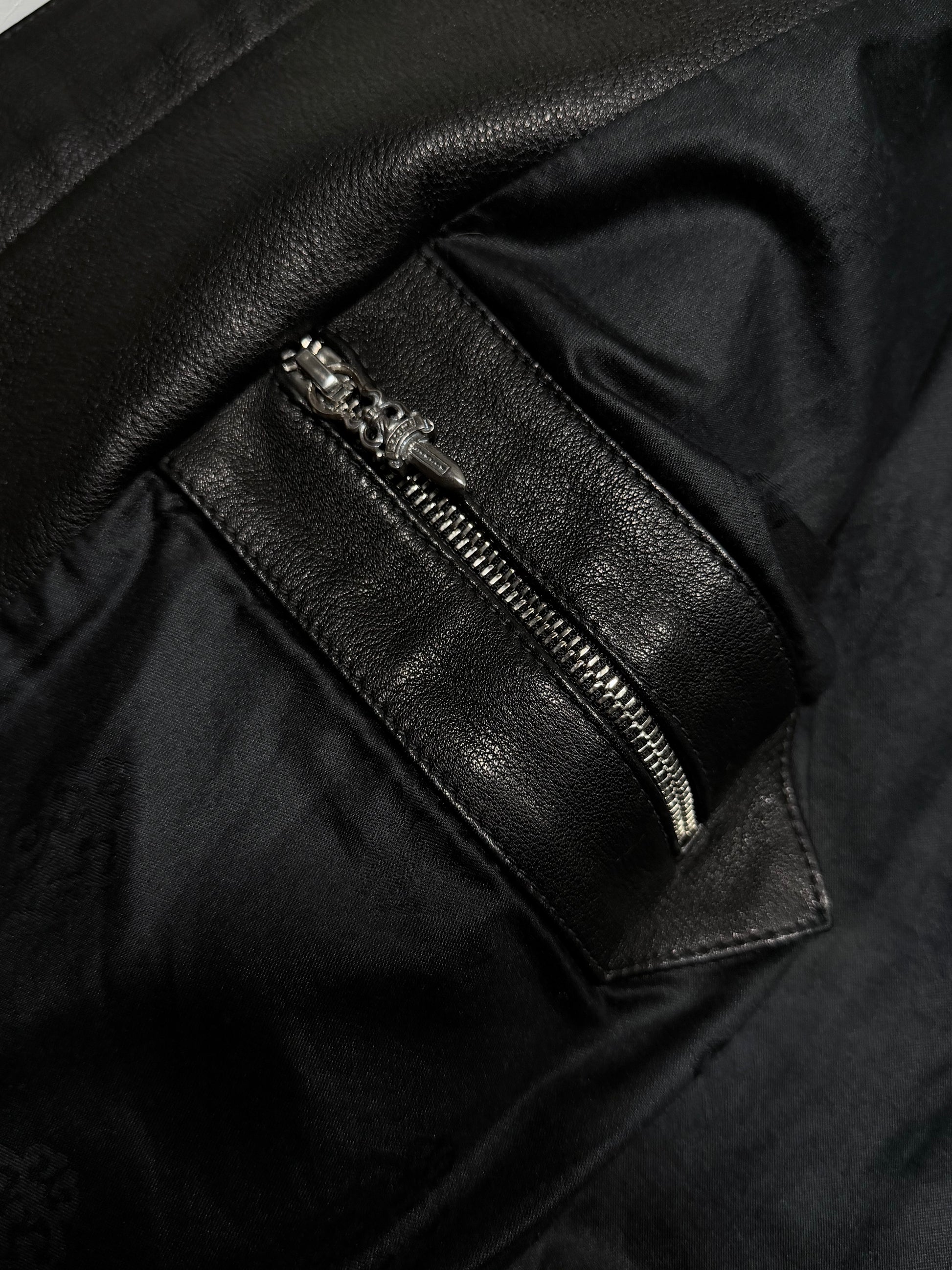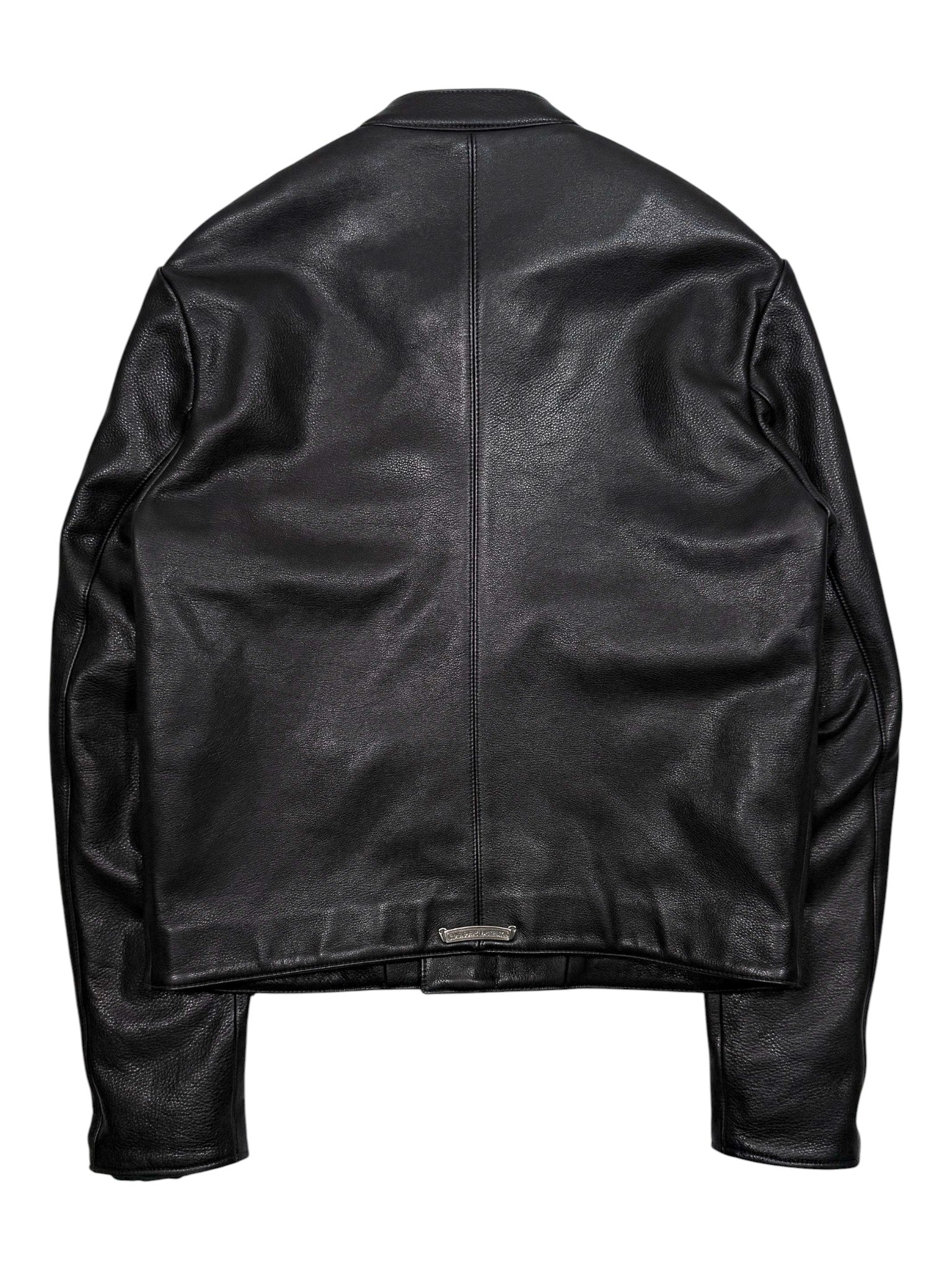DETAILS: Chrome Hearts Leather Racing Jacket. Features bold red and white leather racing stripes on black leather. Triple red and white cemetery cross patches on the chest. Finished with CH .925 sterling silver hardware, dagger zippers and a crossball button neck closure. A true gem of a collectionpiece.
