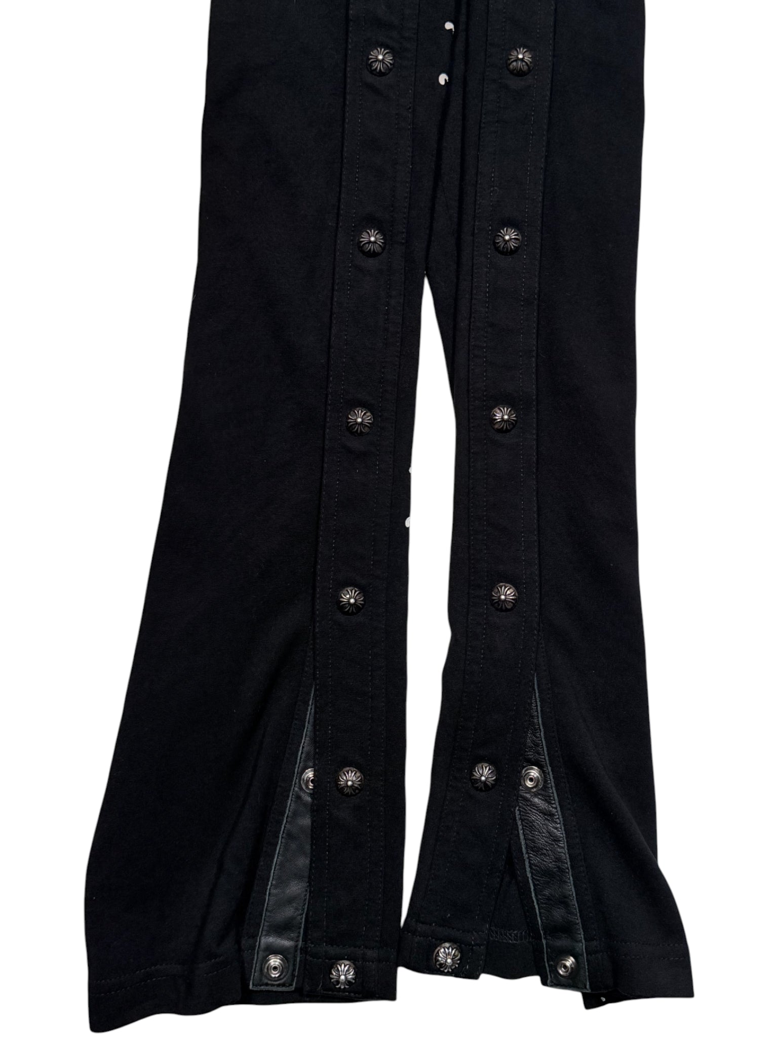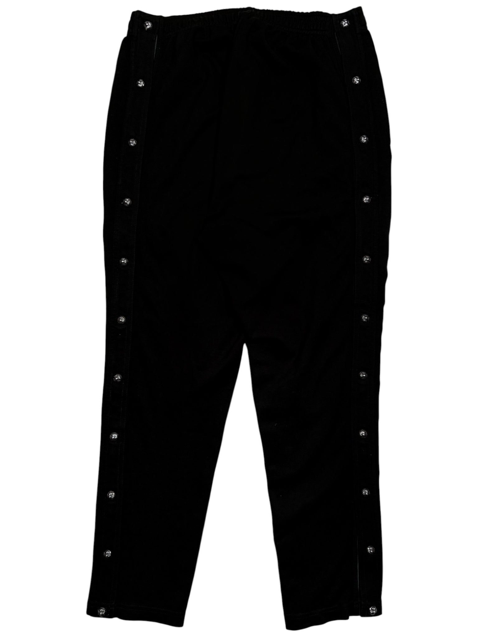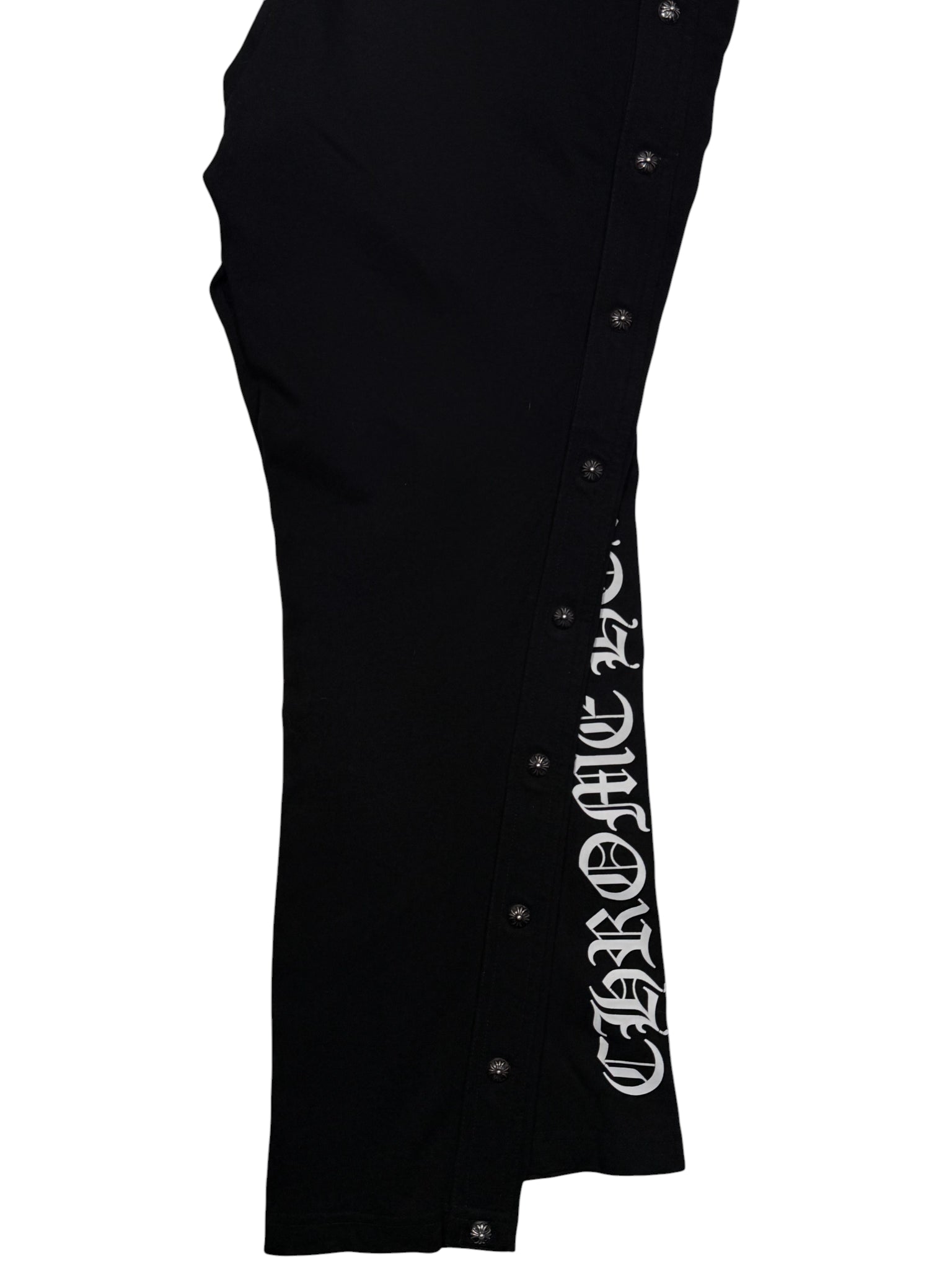 DETAILS: Chrome Hearts "Tear-Away" style button up track pants. A high-utility luxury staple featuring a full-length side-snap construction with 11 signature .925 sterling silver crossball buttons on each side (22 buttons total). The button snaps are reinforced with premium black leather trim for durability and a nice structured fit that can be adjusted with the buttons. Finished with iconic "Chrome Hearts" script logo graphics on both legs. Crafted from high quality cotton, leather and silver. Insane piece with a lot of silver. Great condition as seen in photos. Made in the USA.