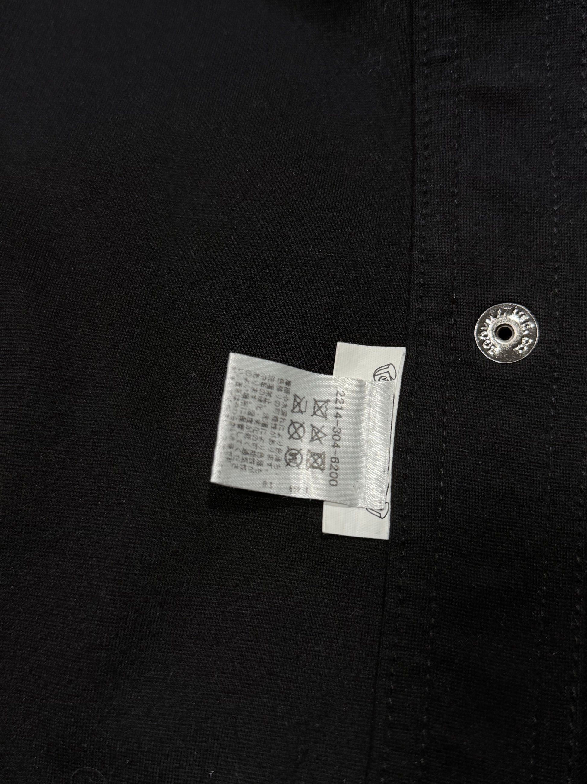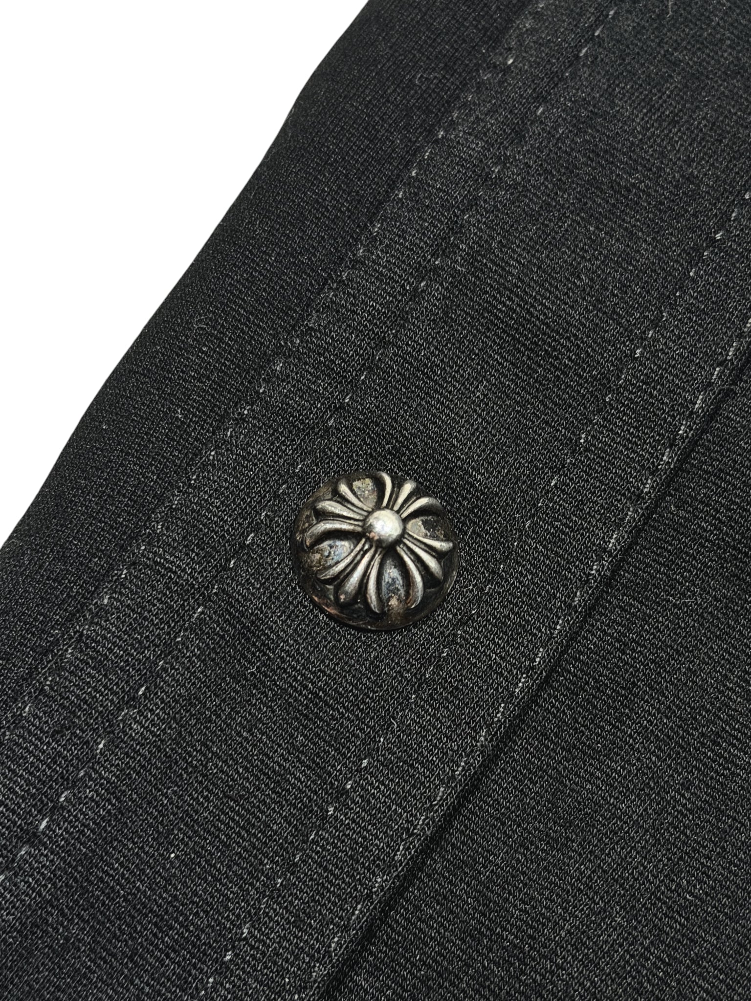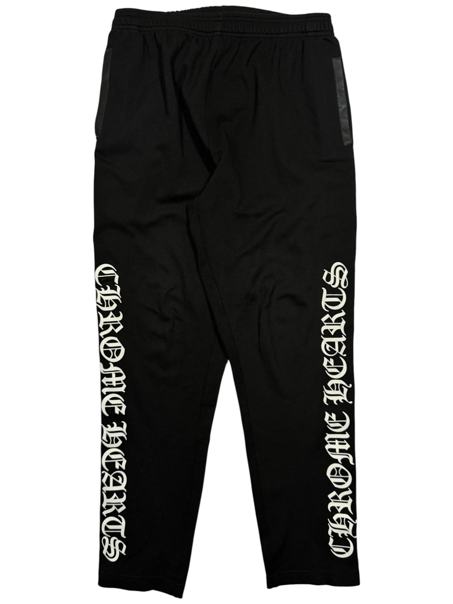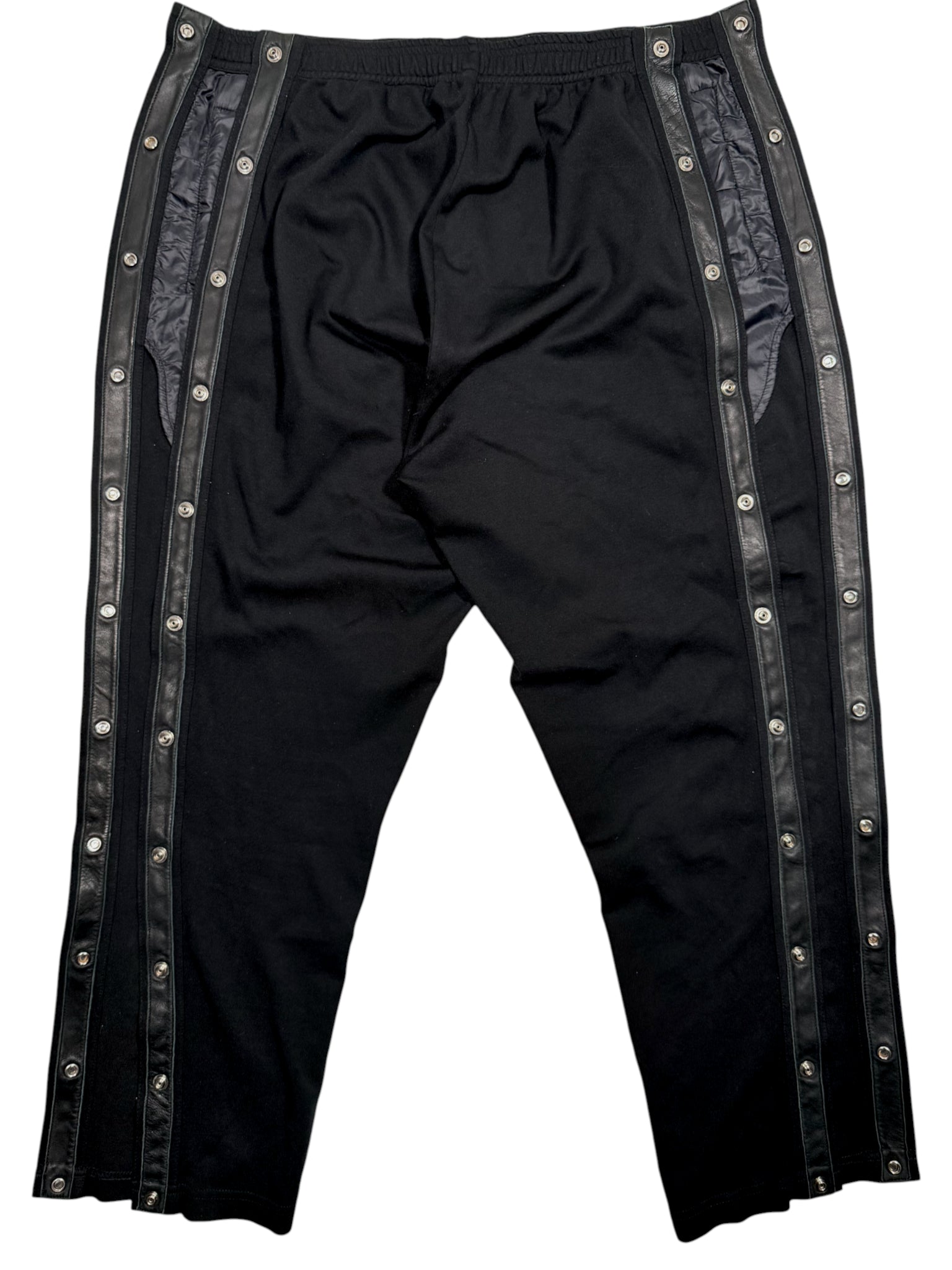 DETAILS: Chrome Hearts "Tear-Away" style button up track pants. A high-utility luxury staple featuring a full-length side-snap construction with 11 signature .925 sterling silver crossball buttons on each side (22 buttons total). The button snaps are reinforced with premium black leather trim for durability and a nice structured fit that can be adjusted with the buttons. Finished with iconic "Chrome Hearts" script logo graphics on both legs. Crafted from high quality cotton, leather and silver. Insane piece with a lot of silver. Great condition as seen in photos. Made in the USA.