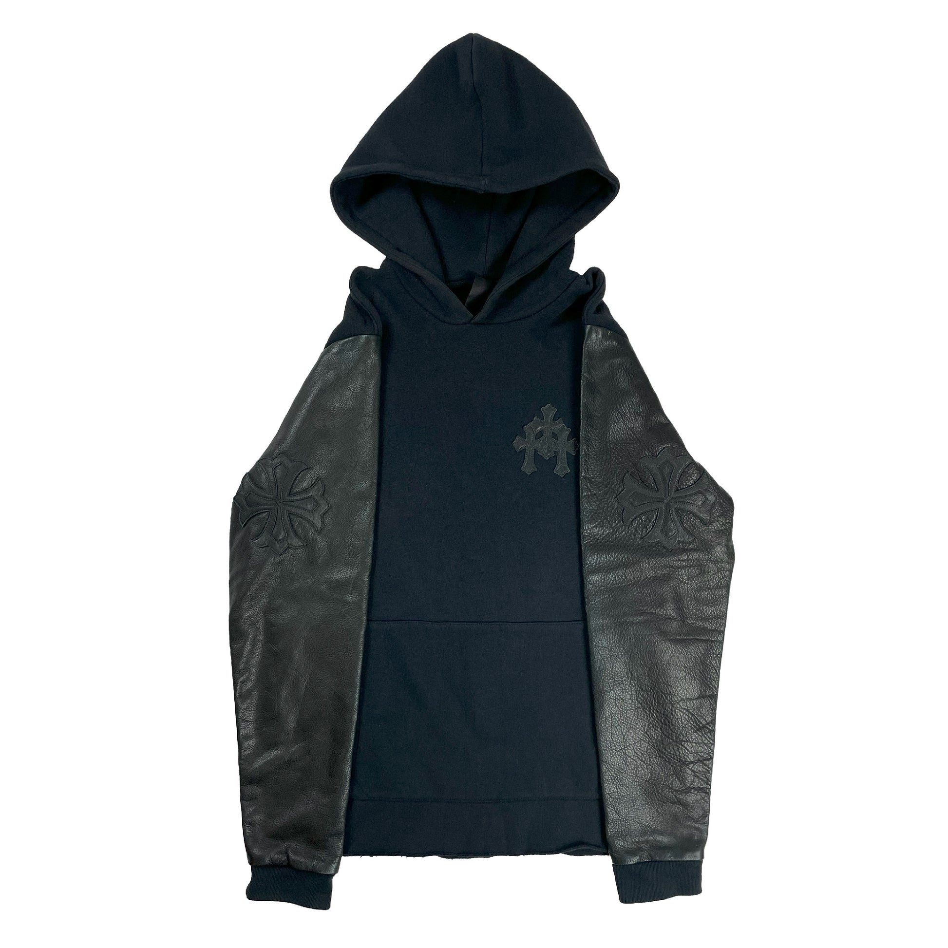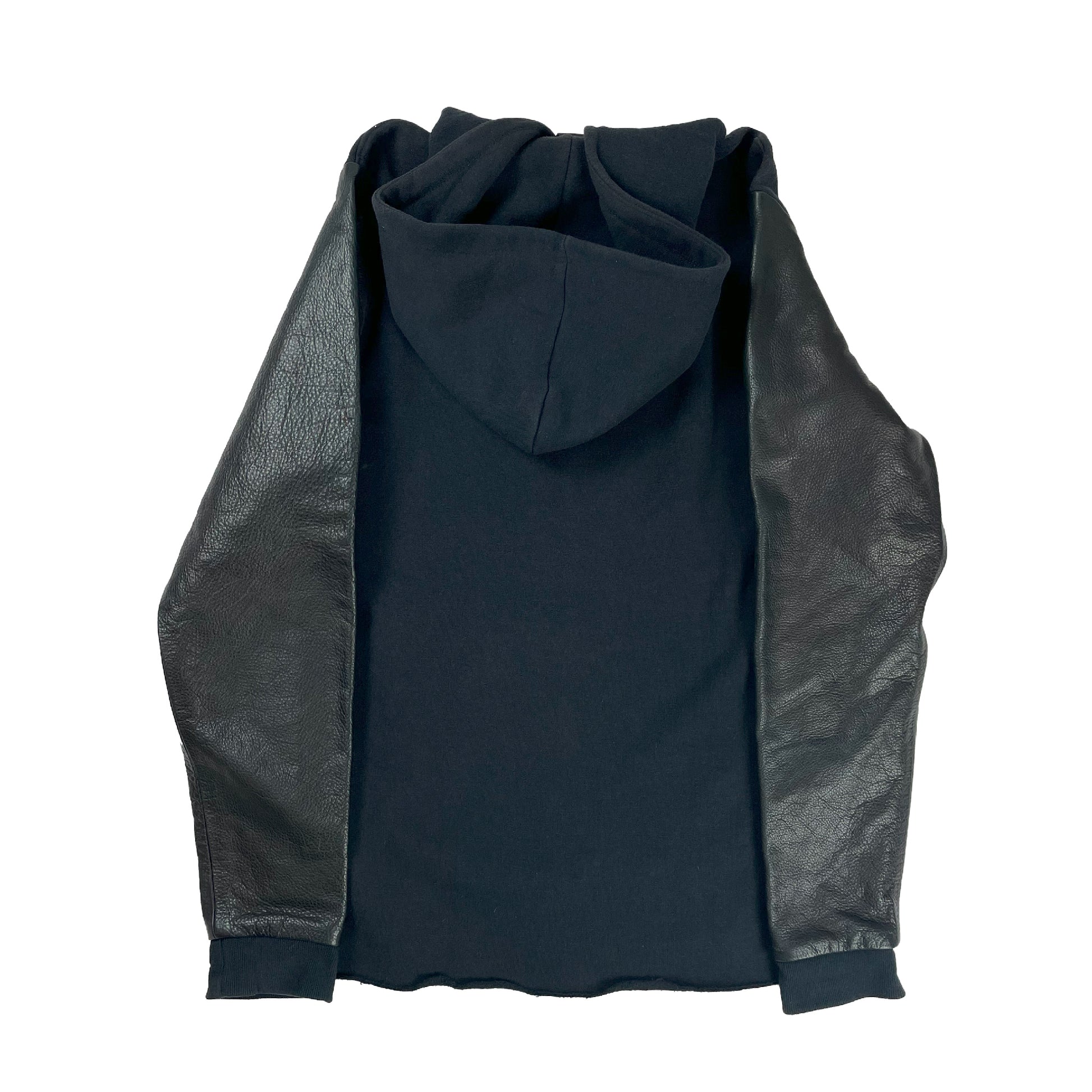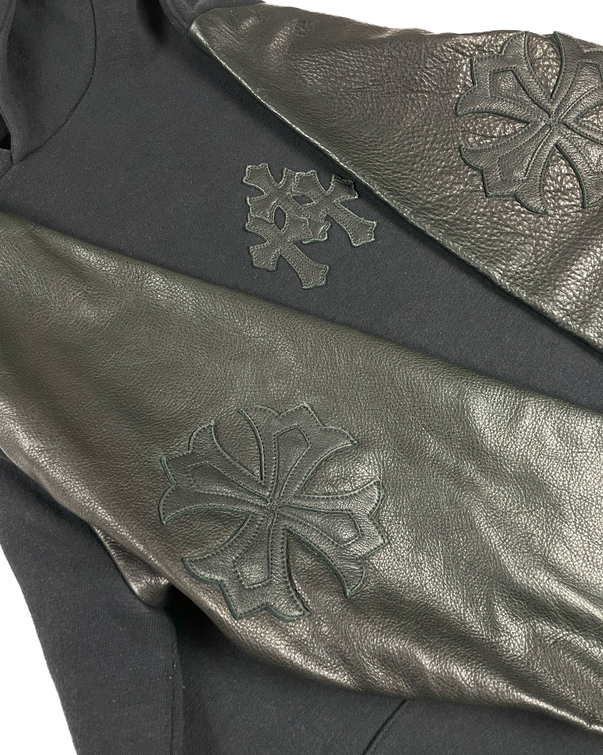 Black Leather Sleeve Cross Patch / Plus Patch Slit Hoodie