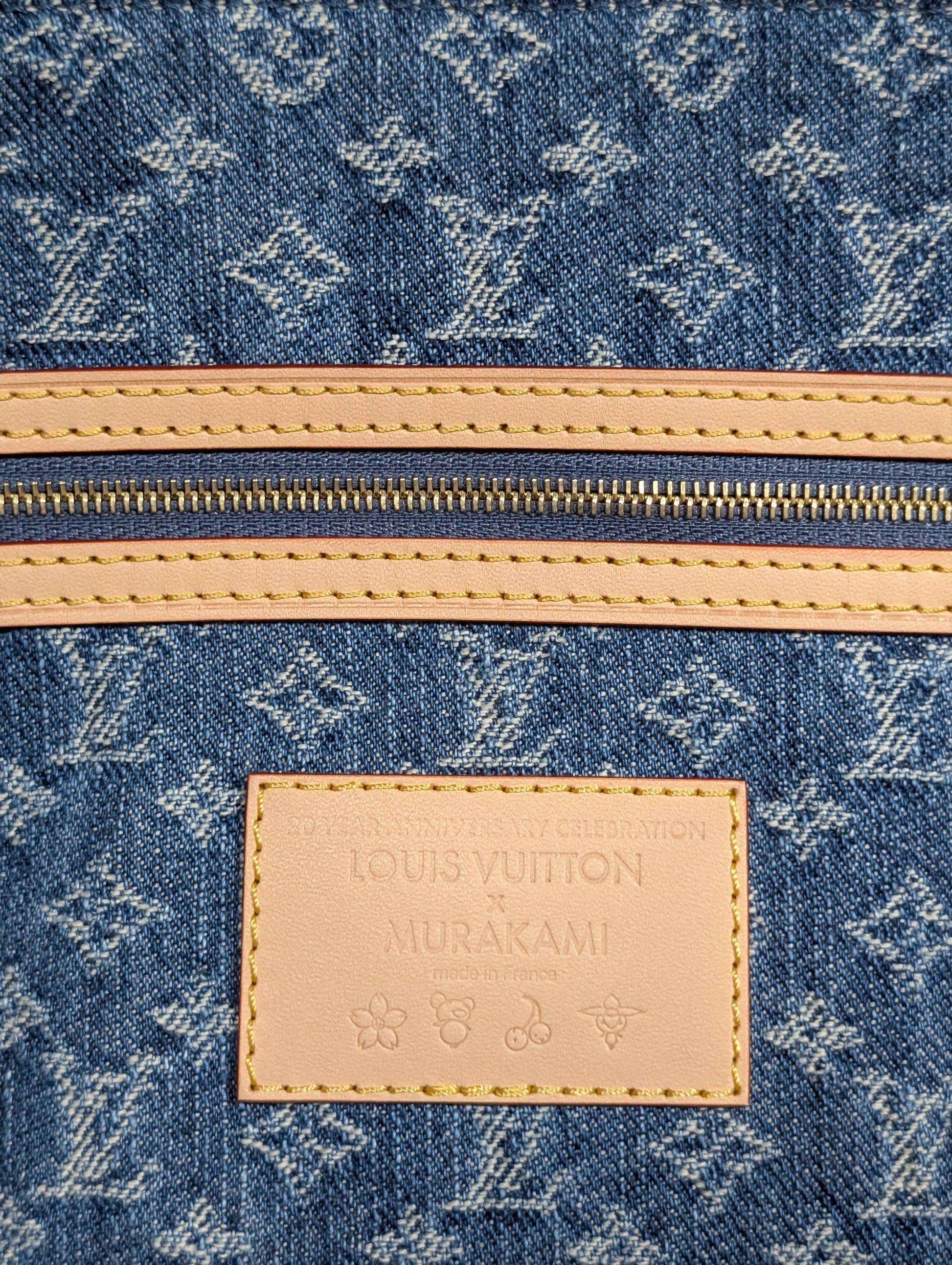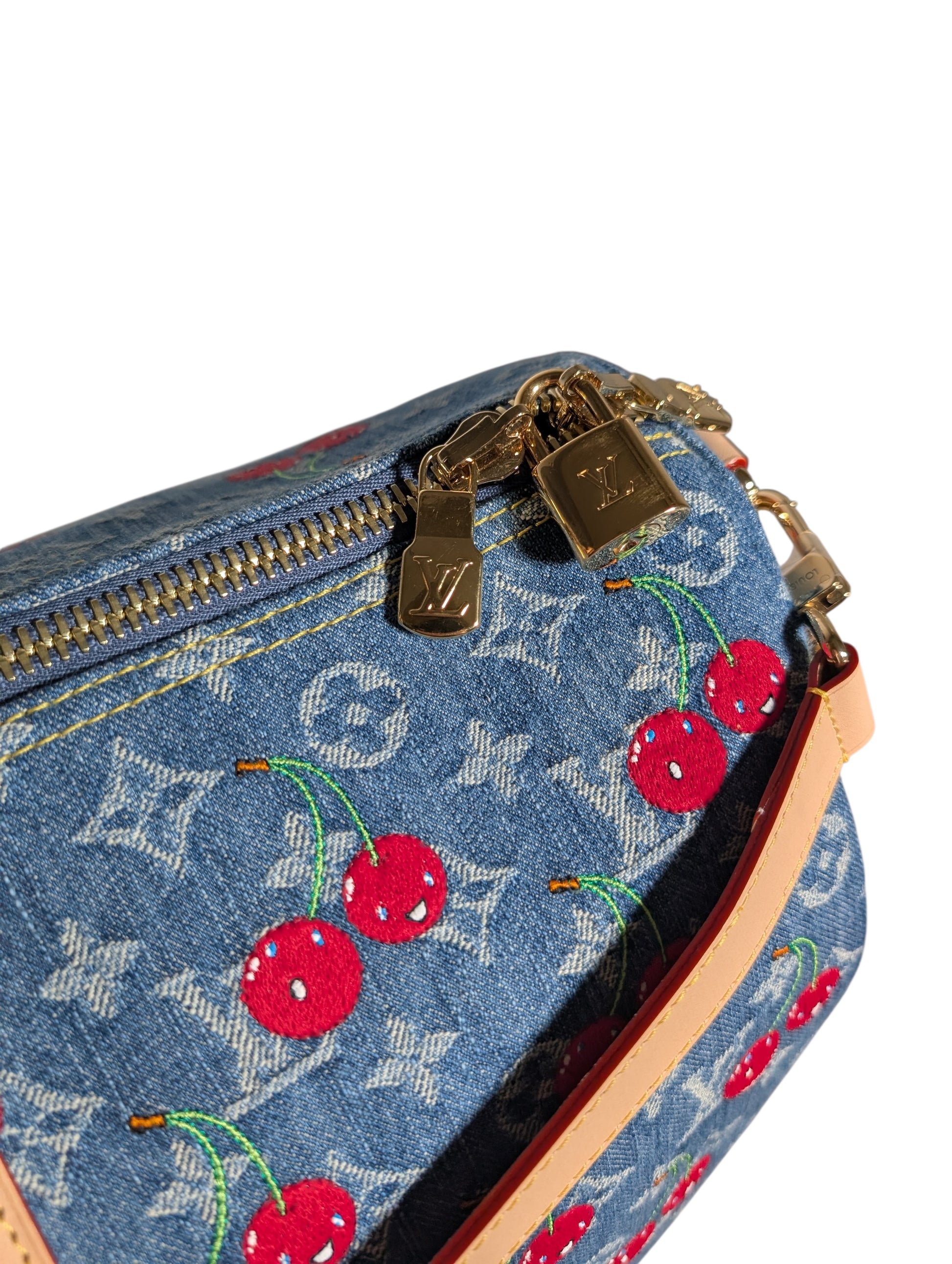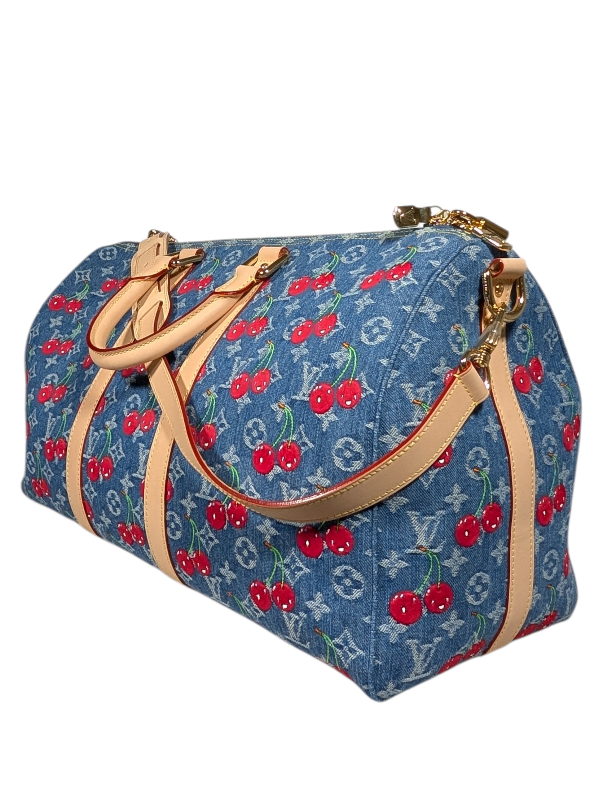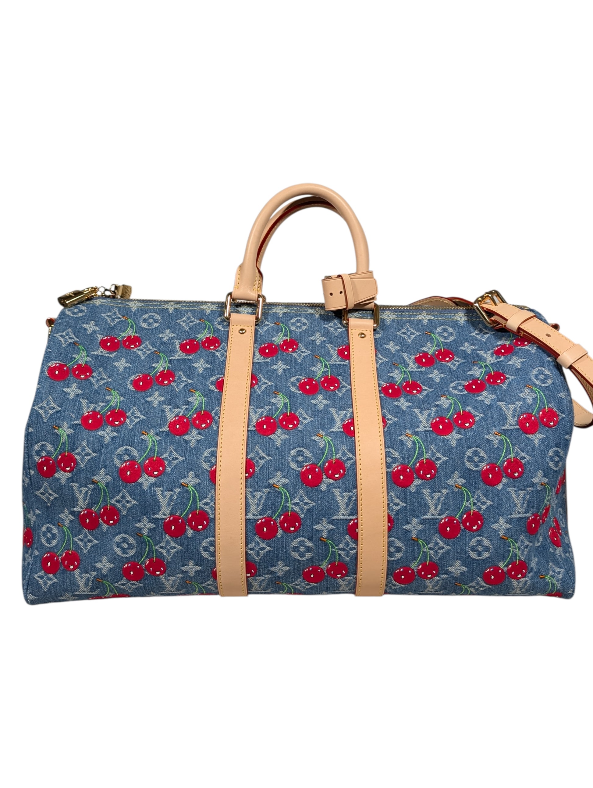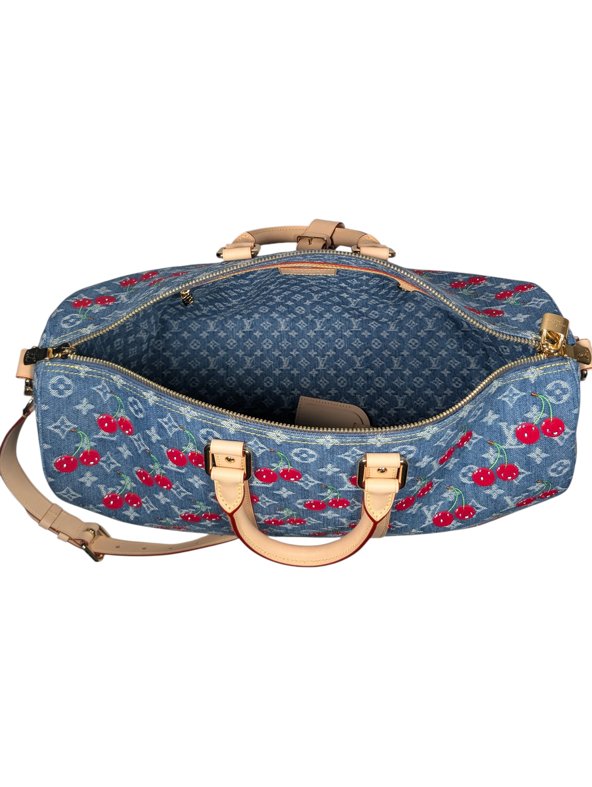 Louis Vuitton × Takashi Murakami Denim Cherry Keepall Bandoulière 45 from the 2025 collection, fully handmade, released May 2025. Features cherry embroidered Monogram denim, gold-tone hardware, and natural leather accents throughout. Dual zip closure, lockable top, and spacious denim-lined interior. Includes removable shoulder strap and luggage tag. Collectible VIP edition with over 14 hours of hand-made craftsmanship.