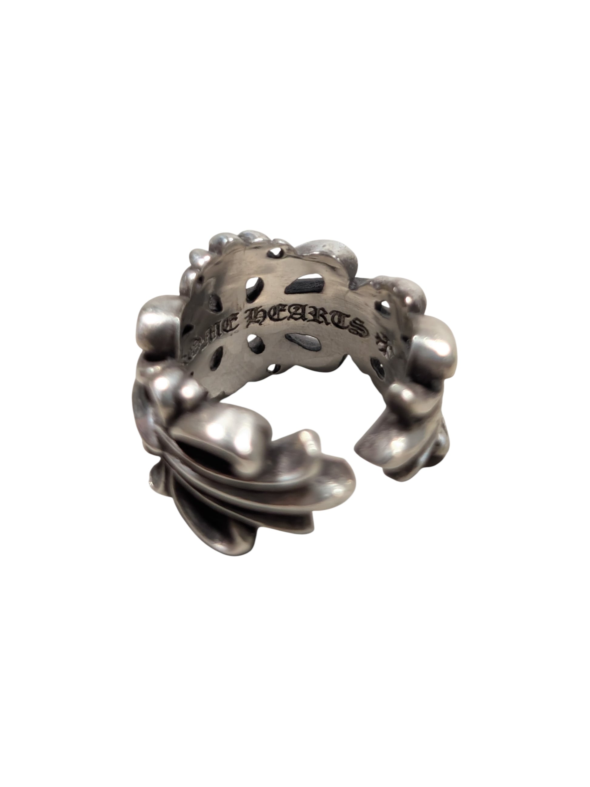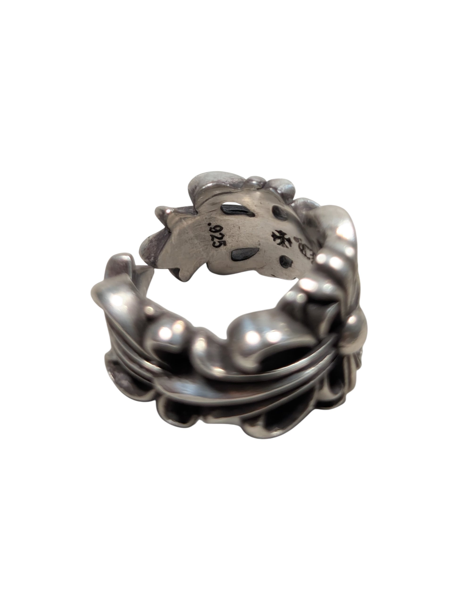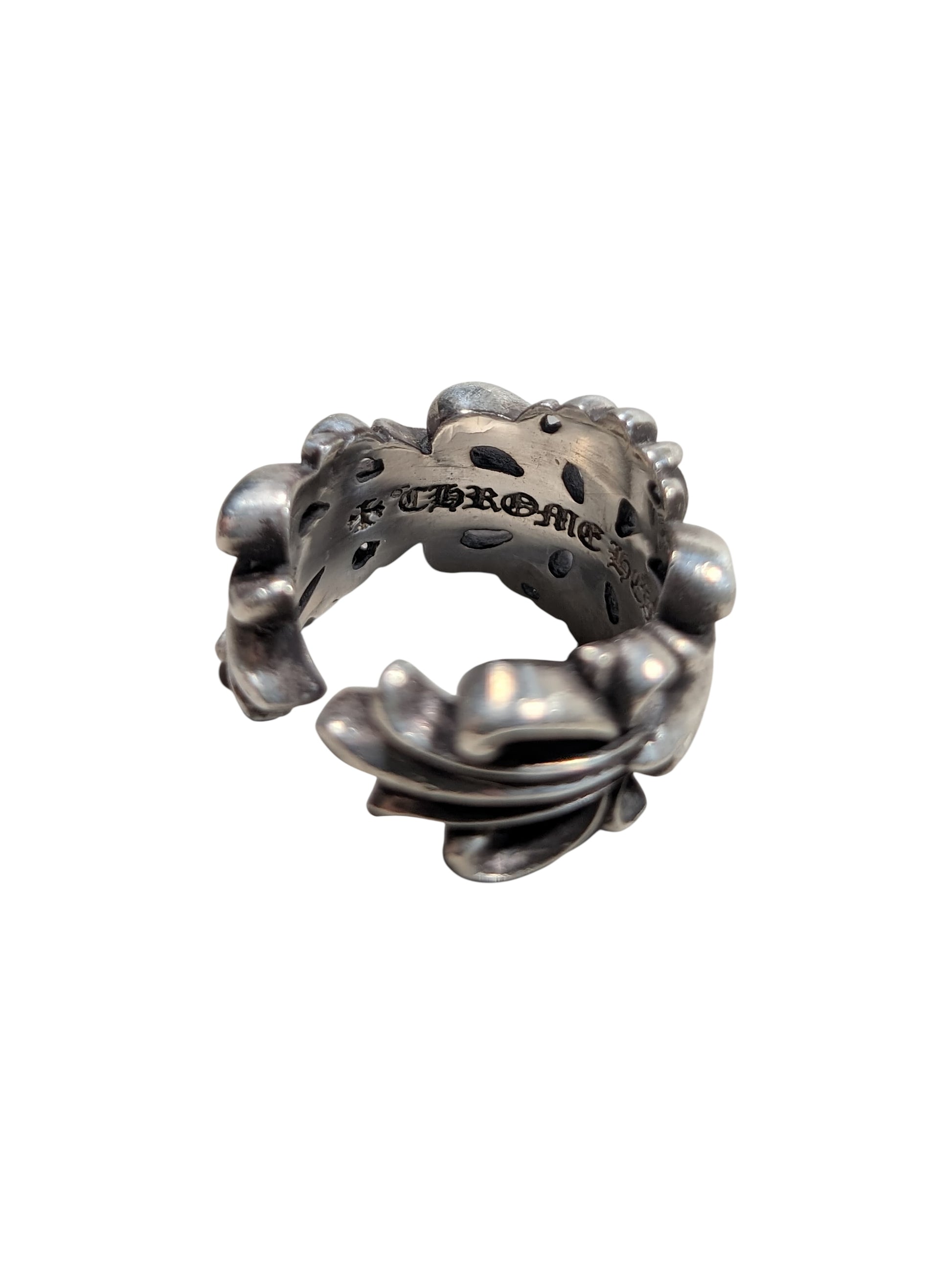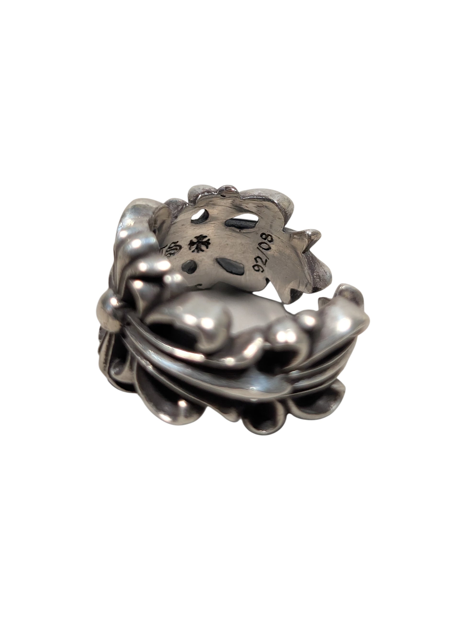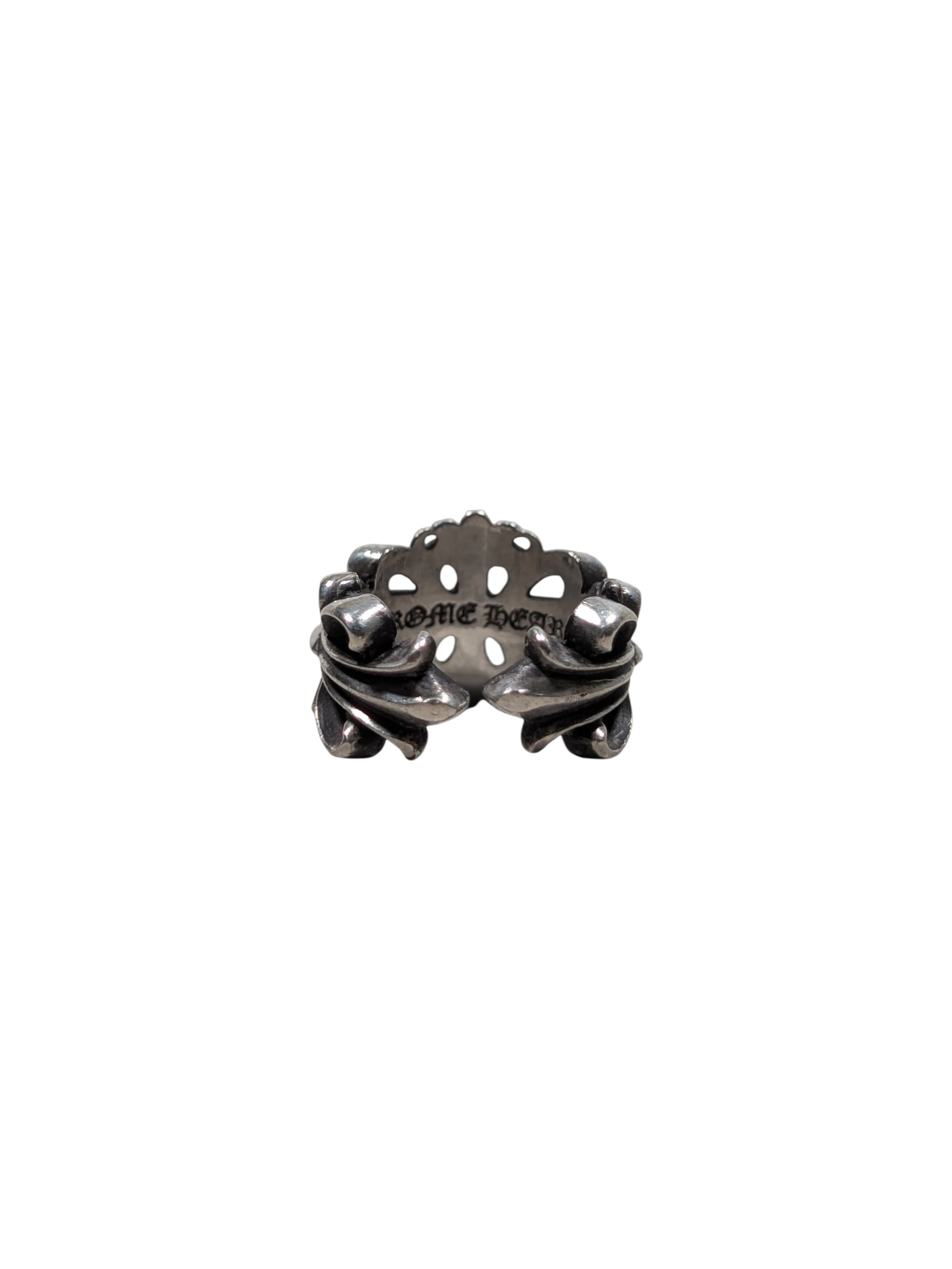 Chrome Hearts Double Floral Cross Ring in .925 sterling silver. Features layered double floral cross motif with engraved floral scroll detailing. Made in USA. Pre‑owned, good condition.