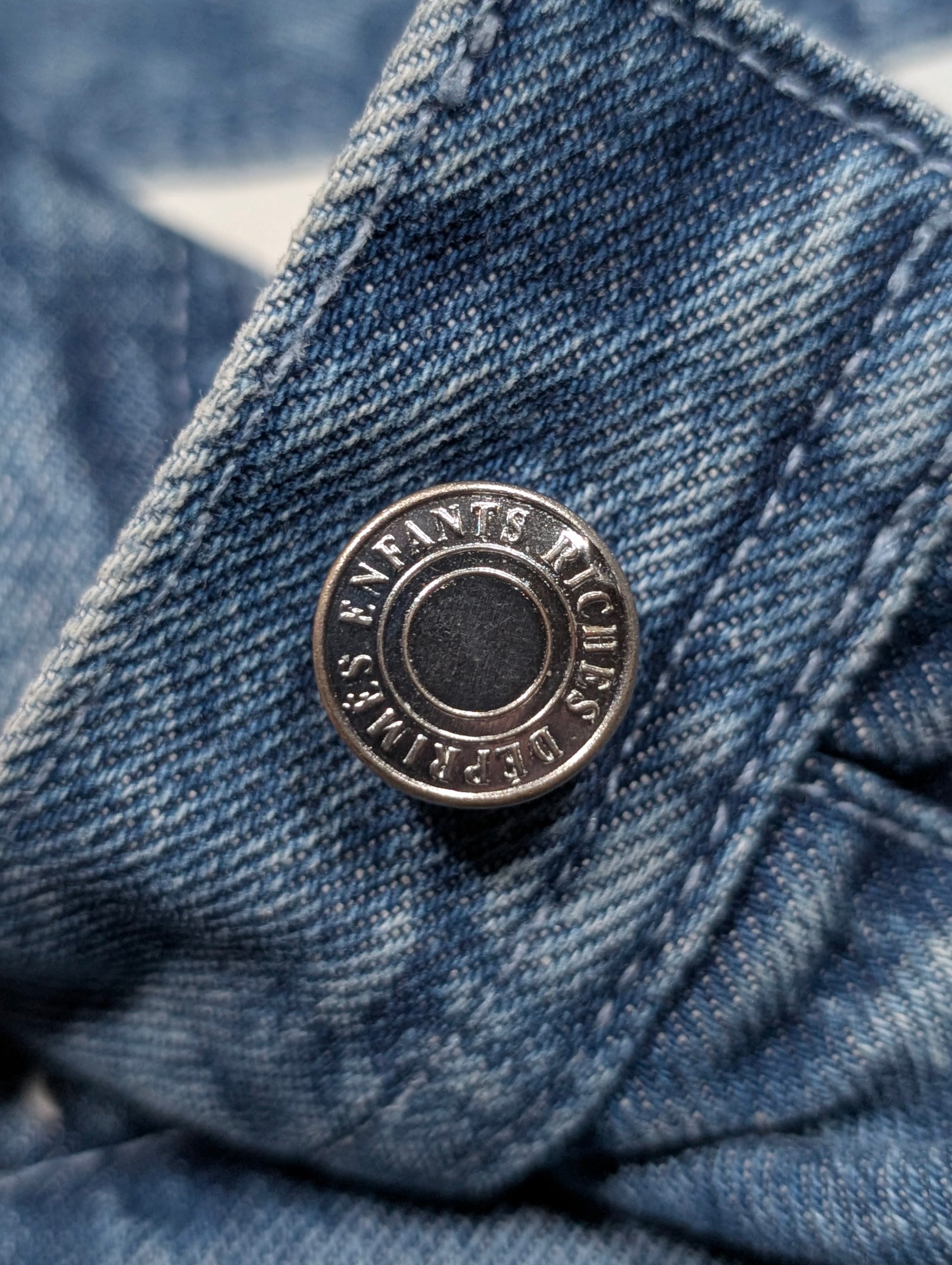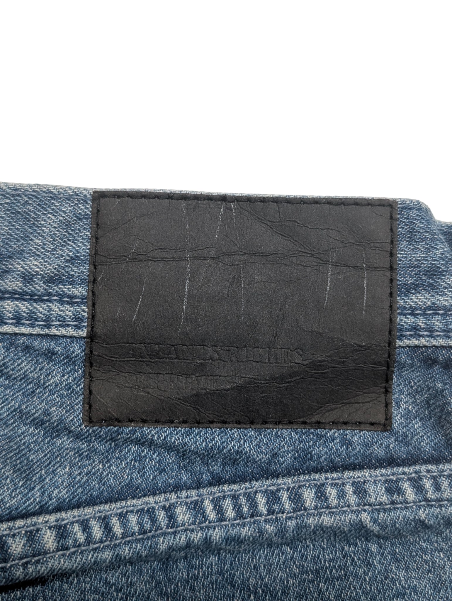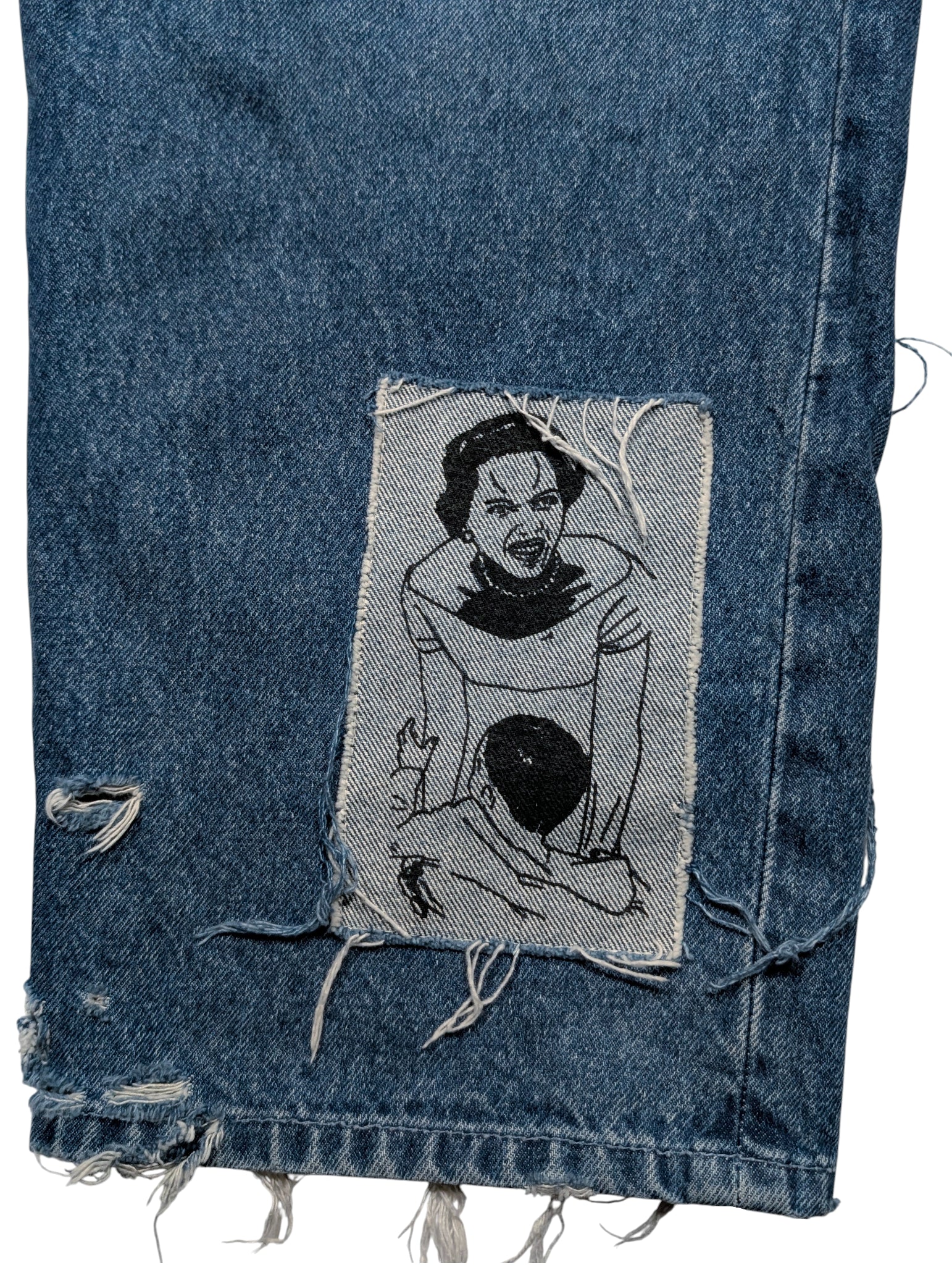 Enfants Riches Déprimés FW22 distressed patchwork graphic jeans featuring blue denim with multiple printed artwork patches, heavy distressing, ripped hems, and signature ERD wash process. Rare ERD patchwork denim with mixed graphic motifs with deep references and destroyed detailing.