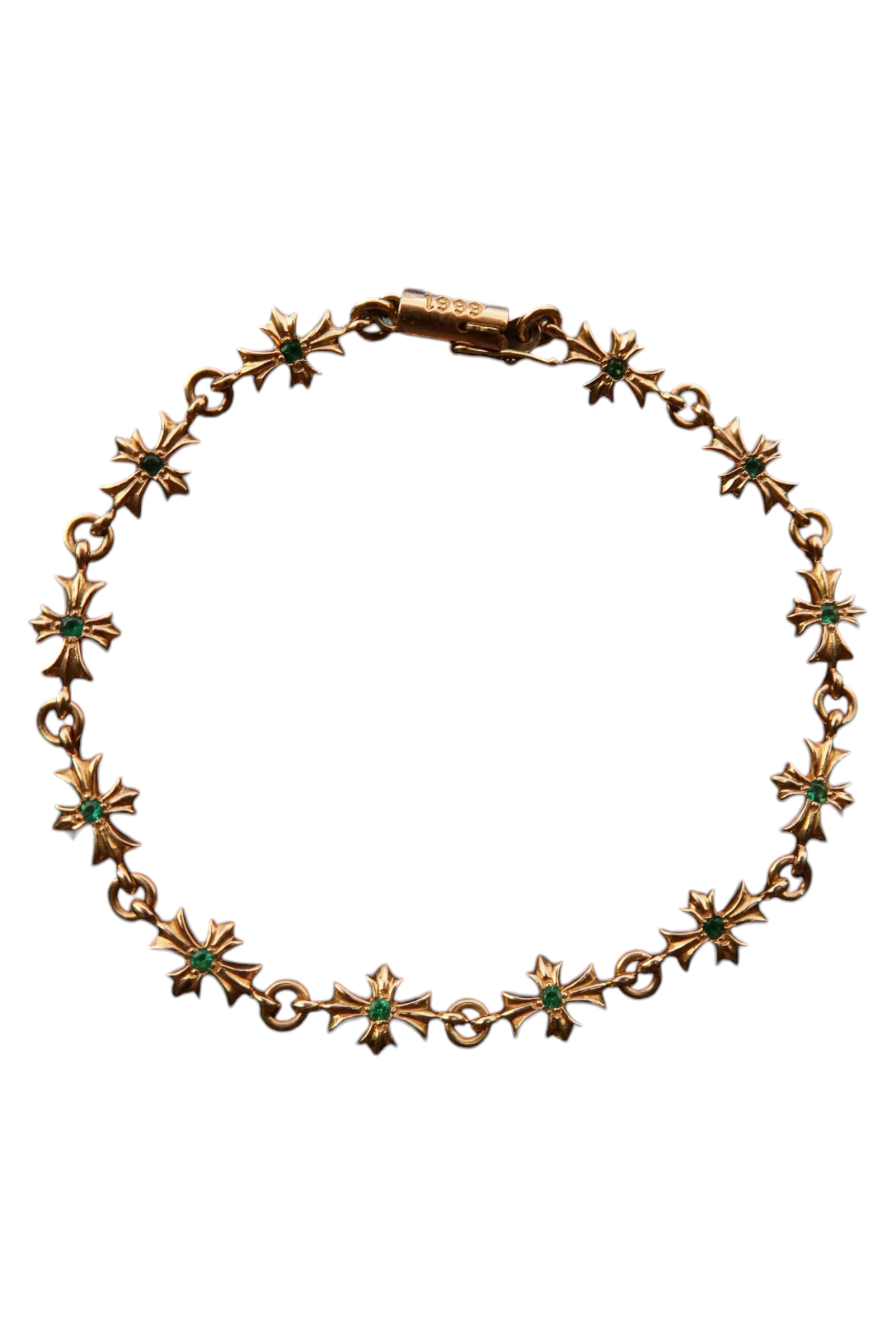 Chrome Hearts Tiny E Bracelet in 22k Gold with factory set green emeralds on both sides. This bracelet is extremely rare as much as it is beautiful. With emeralds on each gold link, this Tiny E bracelet is a top collectors piece, and a perfect addition to any bracelet stack.