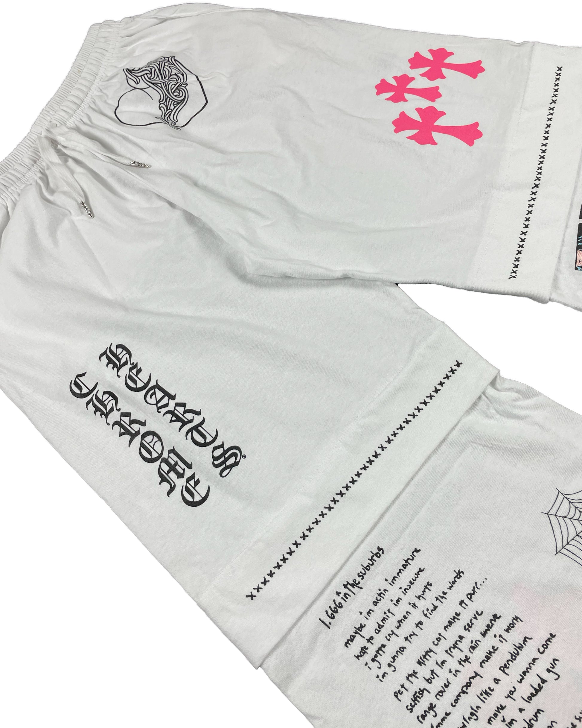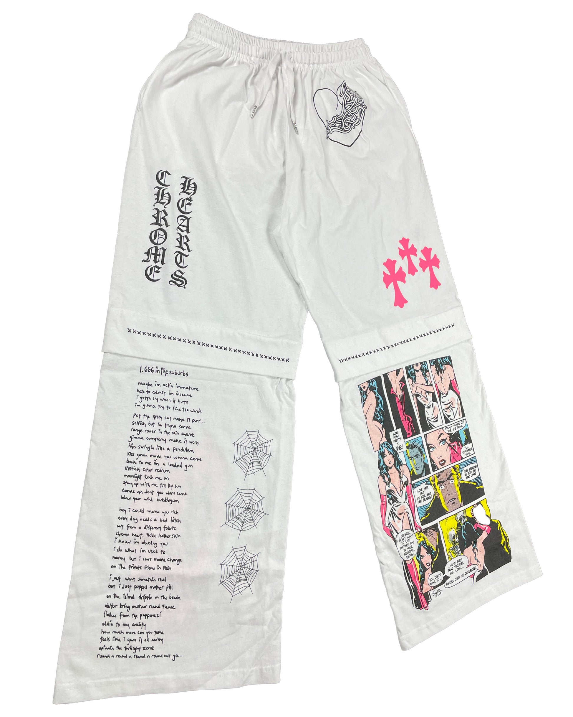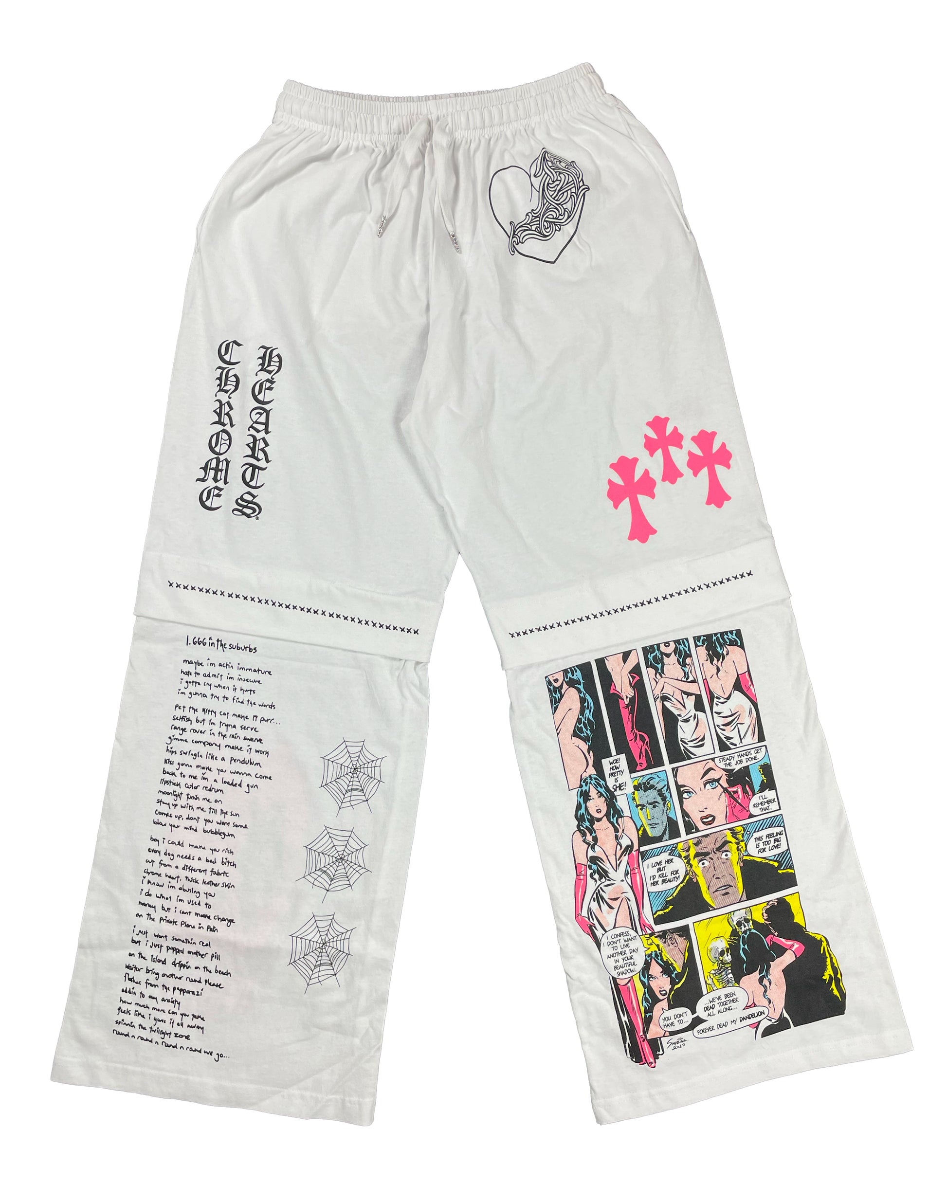 These unisex sweatpants feature a unique and trendy flared cut with a bold pop graphic comic design, pink crosses, with added sterling silver details for a touch of luxury. Made with thin cotton, these flared sweatpants will keep you looking fashionable and feeling comfortable all day long.