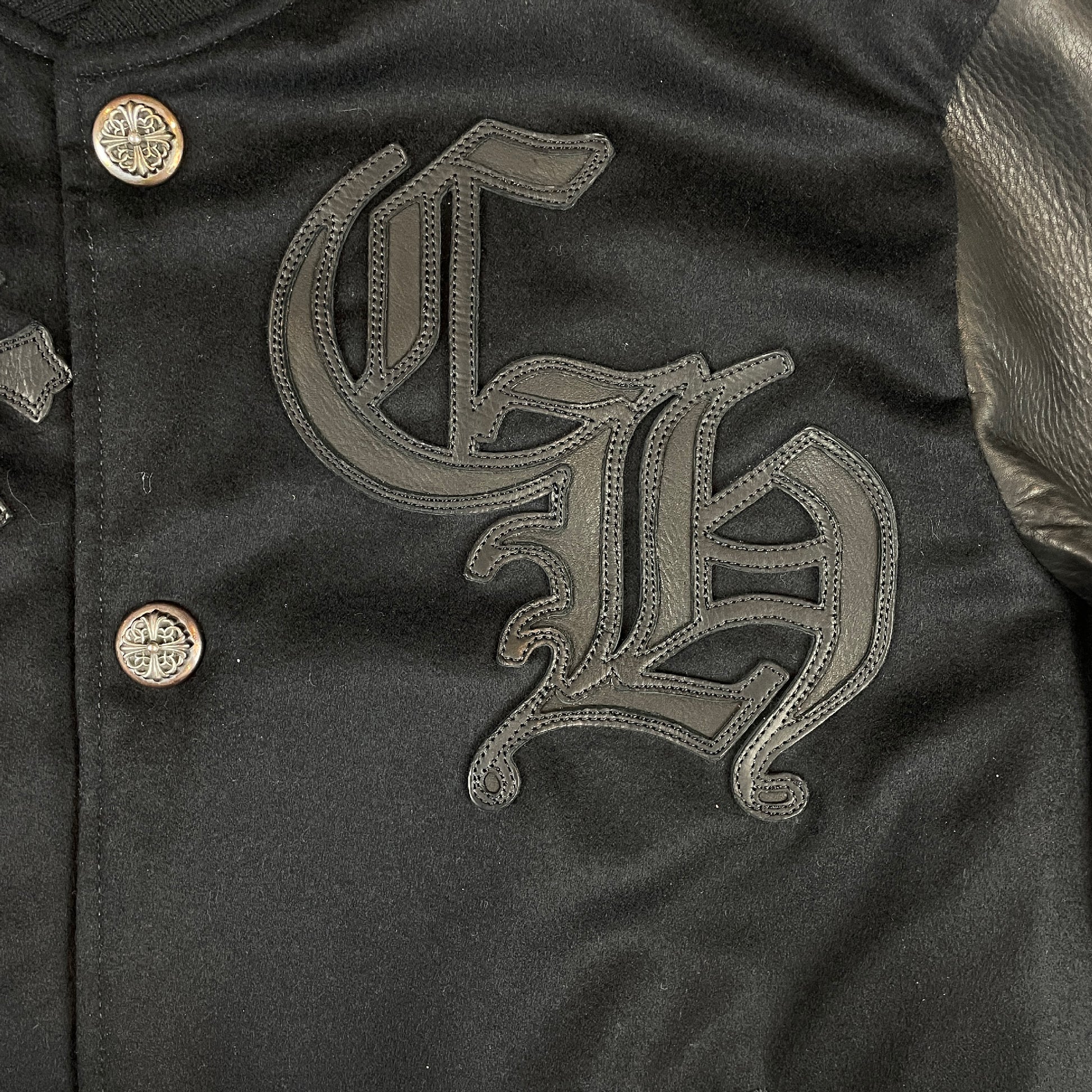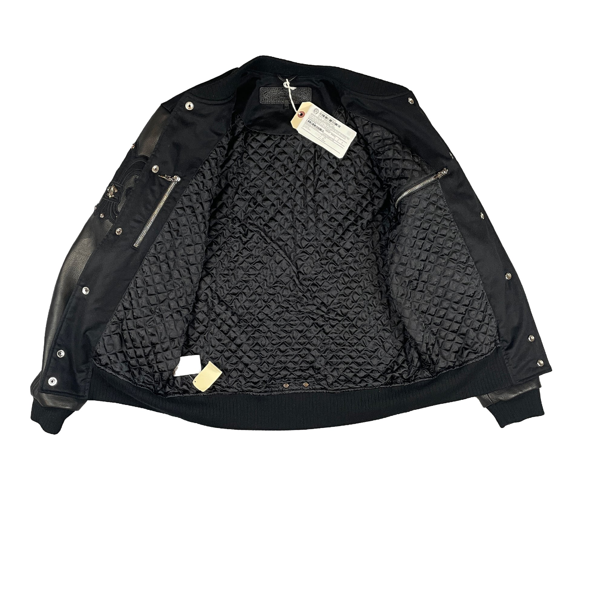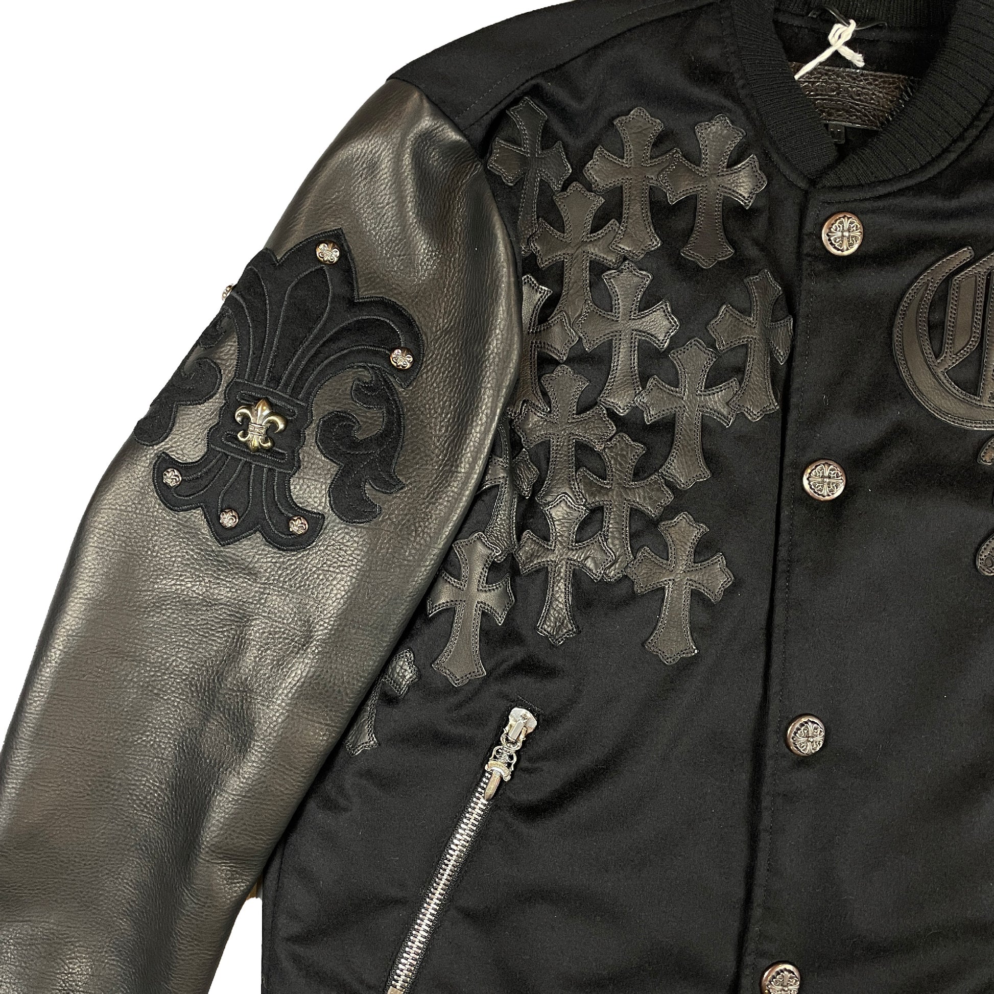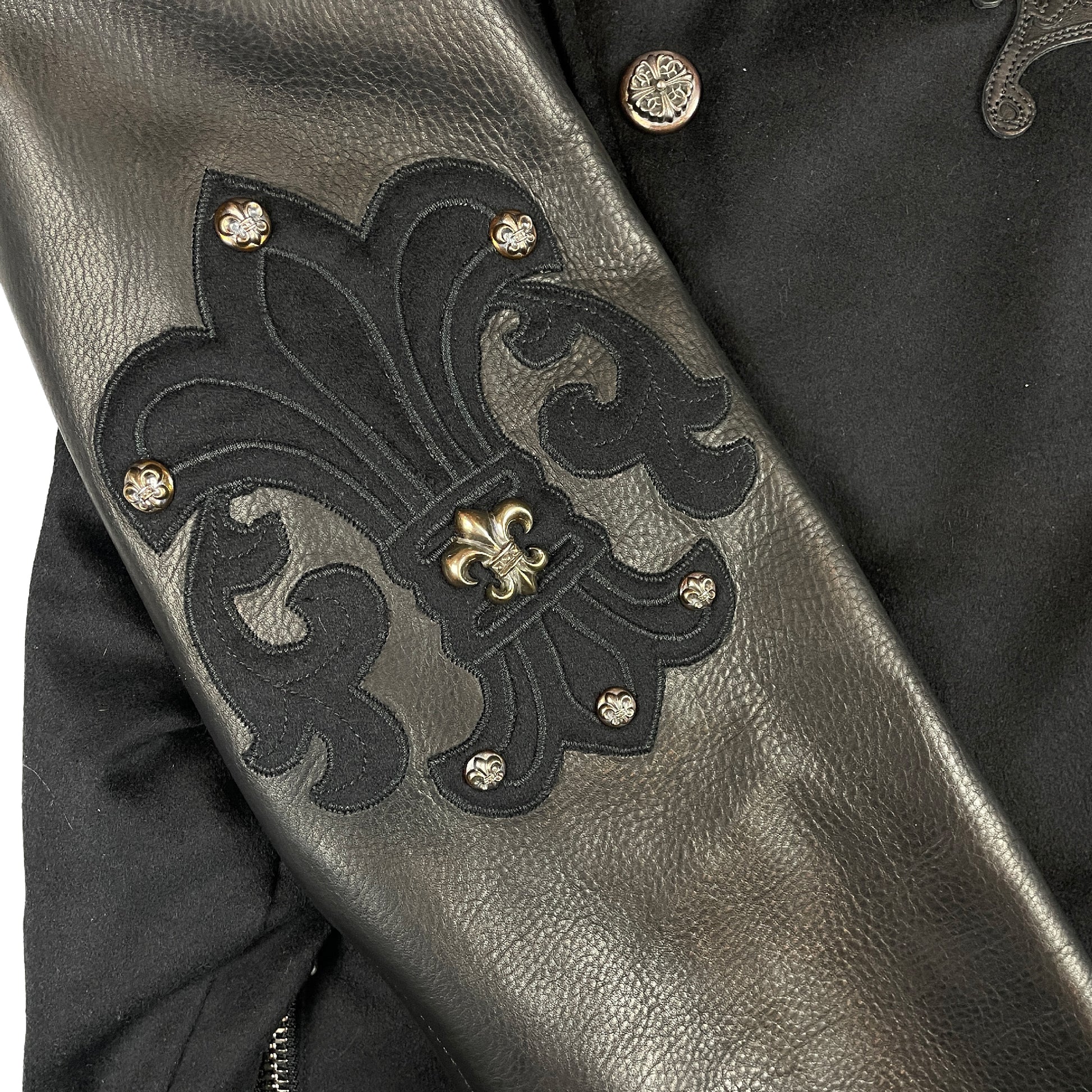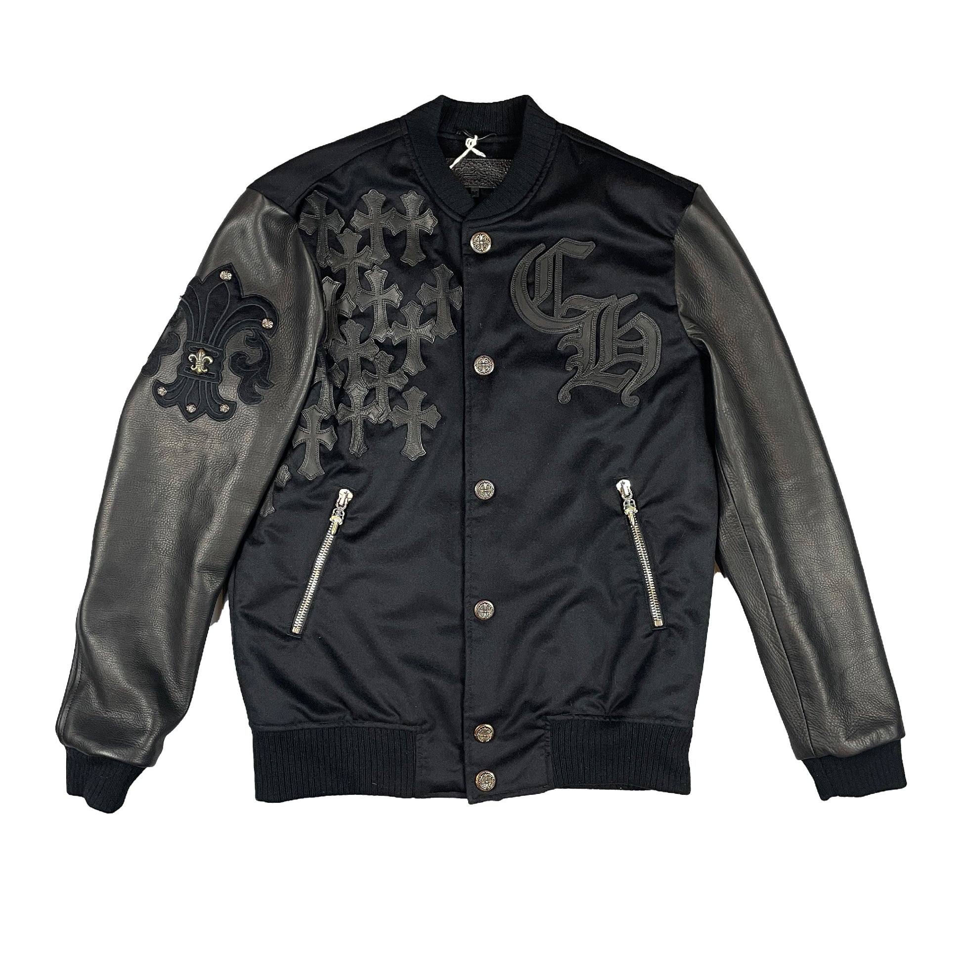 The Chrome Hearts Letterman Jacket is an iconic and highly desirable piece. It features .925 silver hardware, loaded with leather patches, a quilted silk interior, a large "CH" logo, and a "Fleur De Lis" patch with intricate CH silver detailing on nearly every part of the jacket.