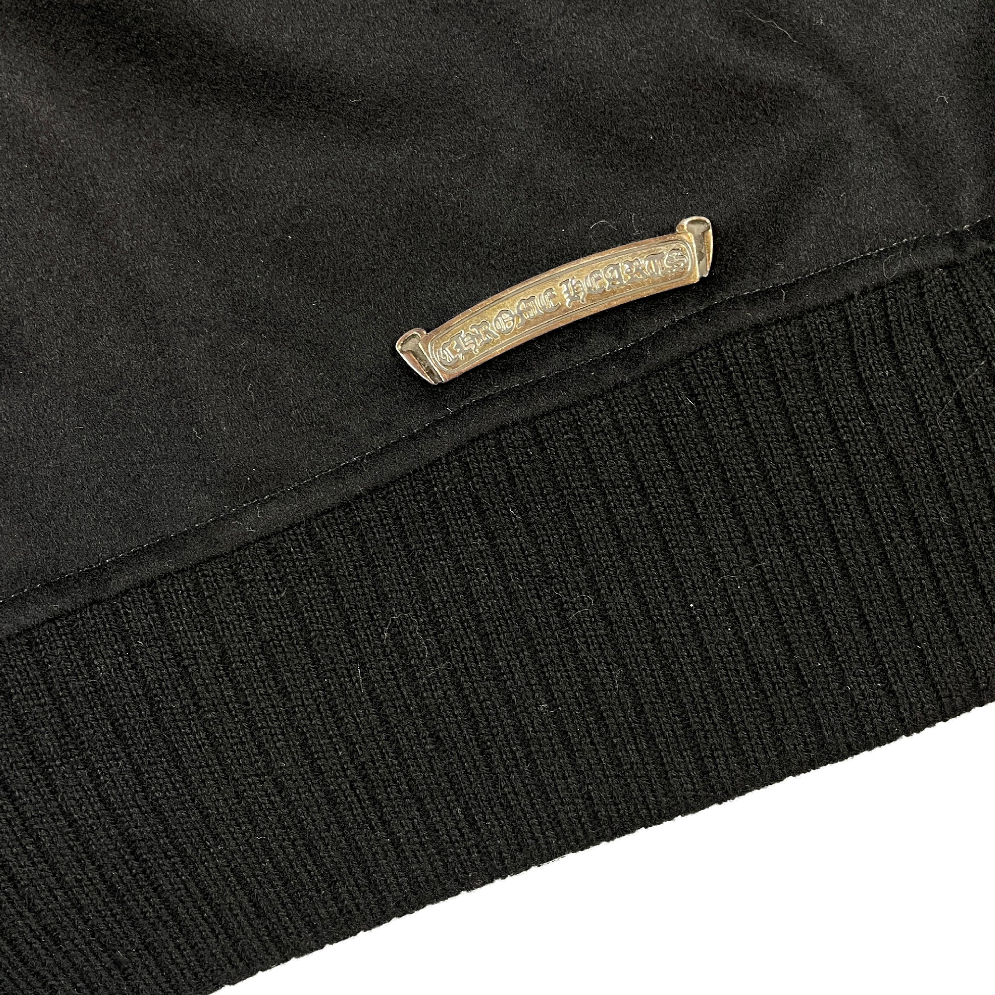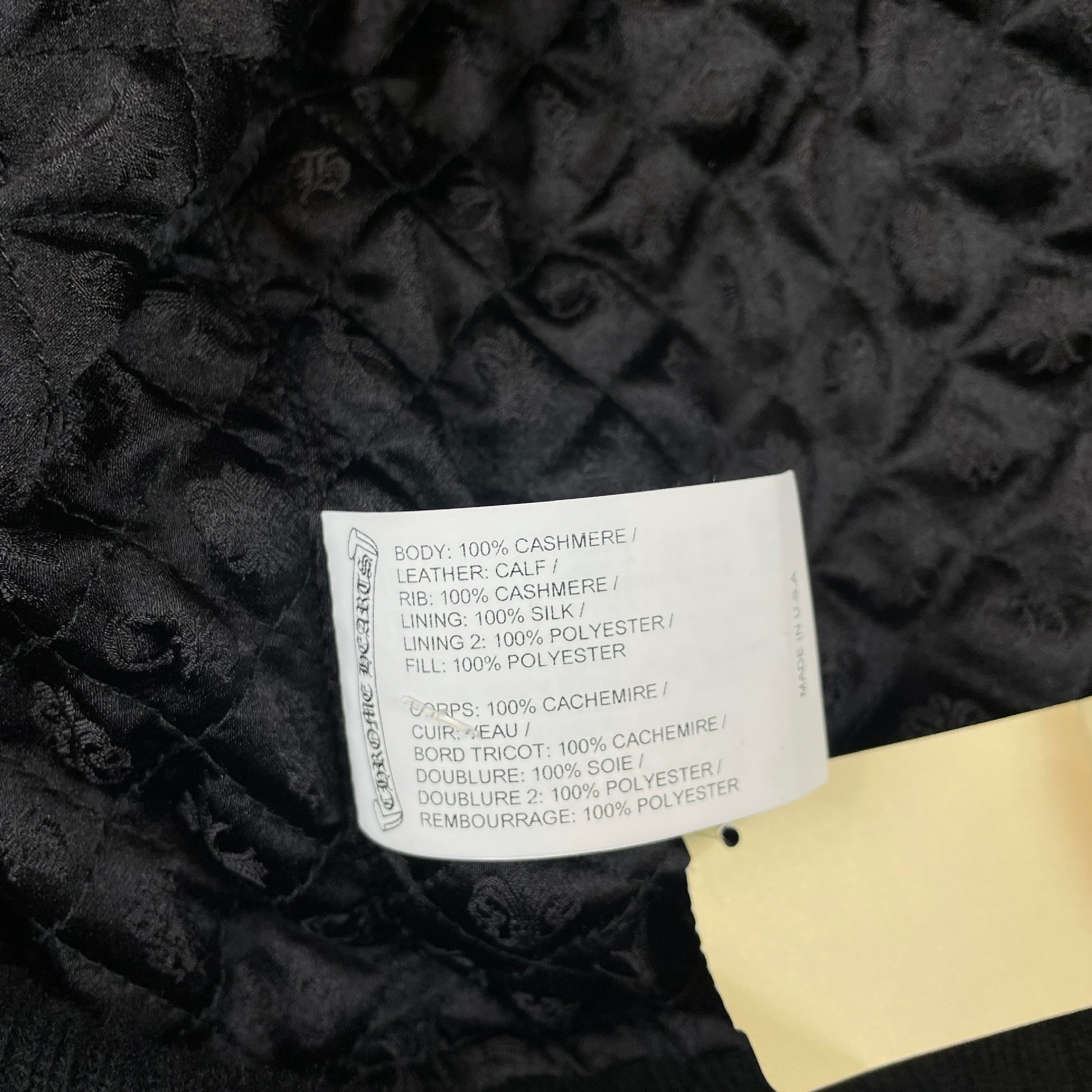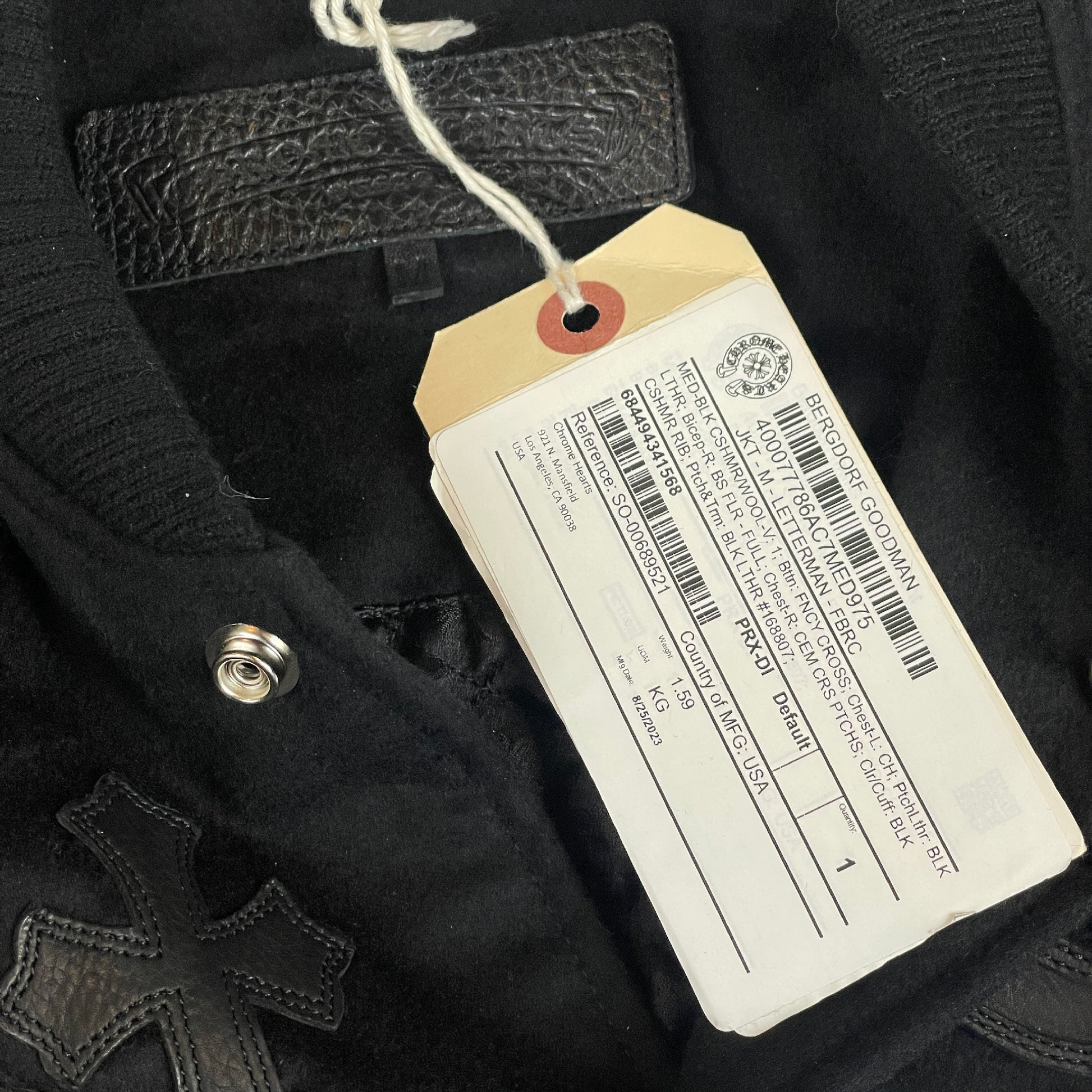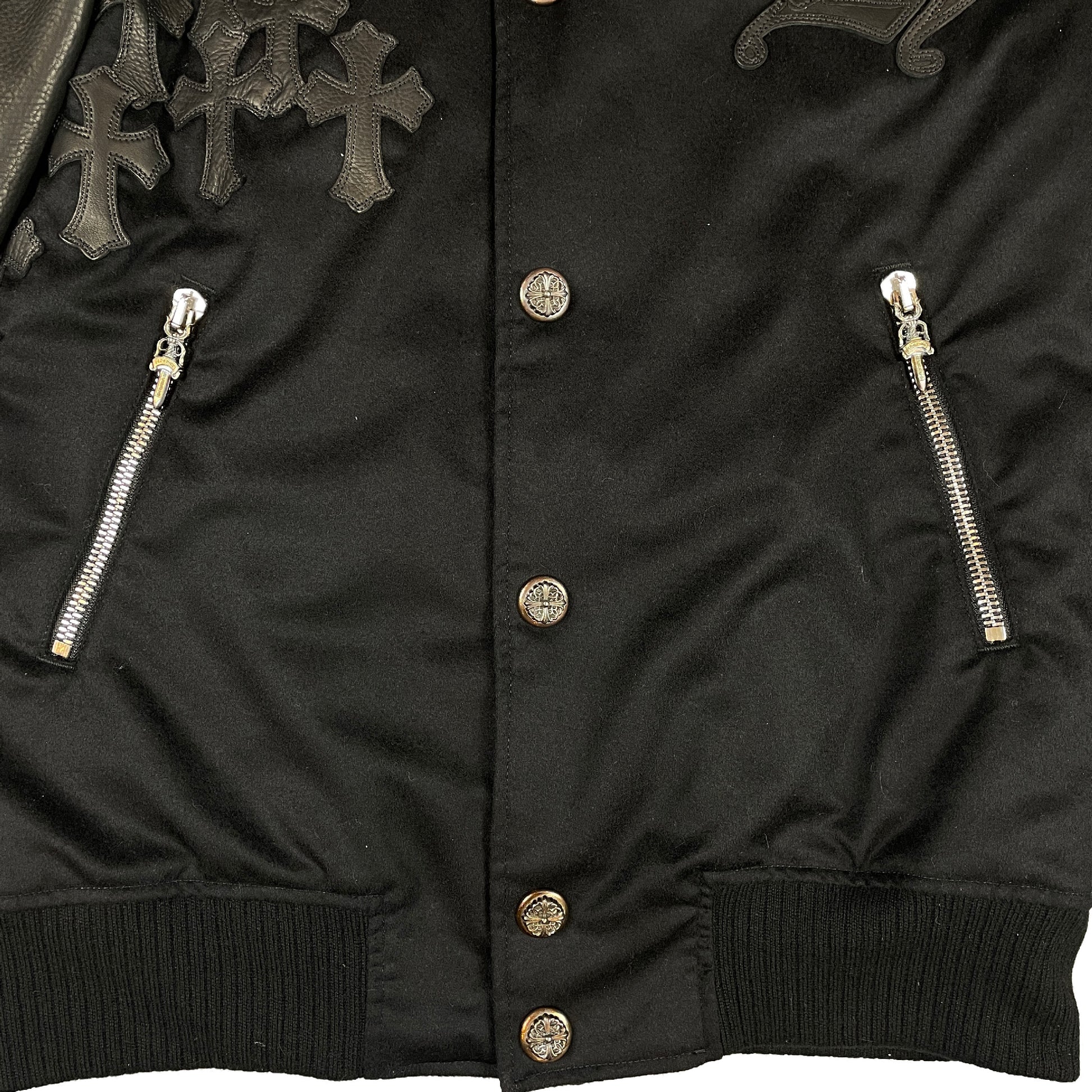 The Chrome Hearts Letterman Jacket is an iconic and highly desirable piece. It features .925 silver hardware, loaded with leather patches, a quilted silk interior, a large "CH" logo, and a "Fleur De Lis" patch with intricate CH silver detailing on nearly every part of the jacket.