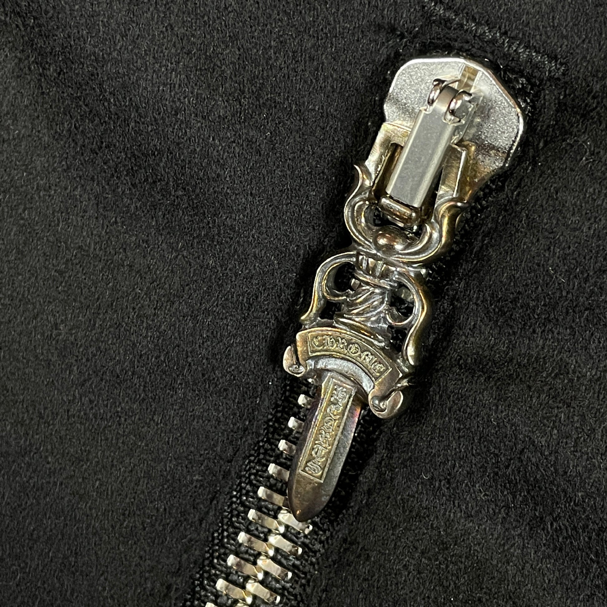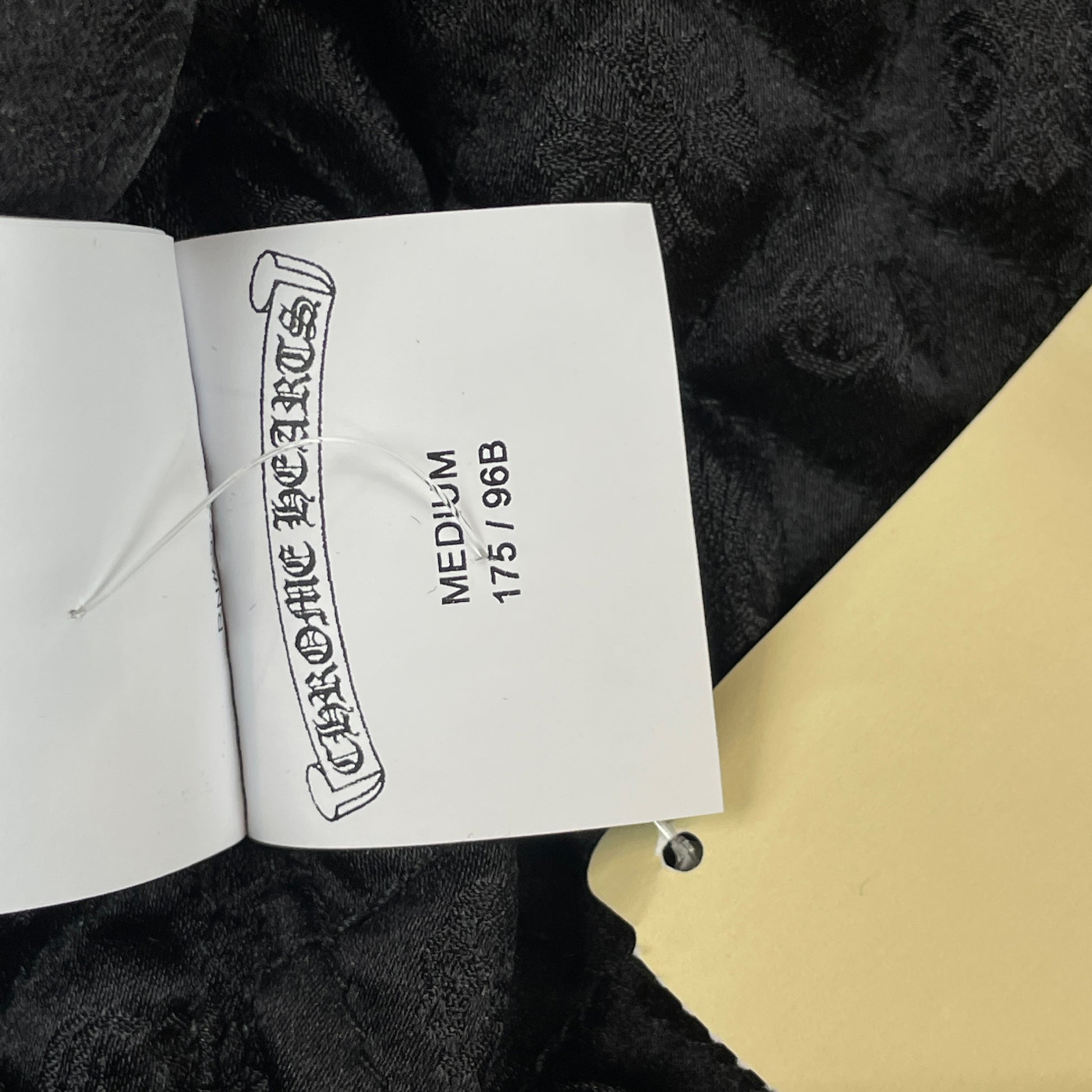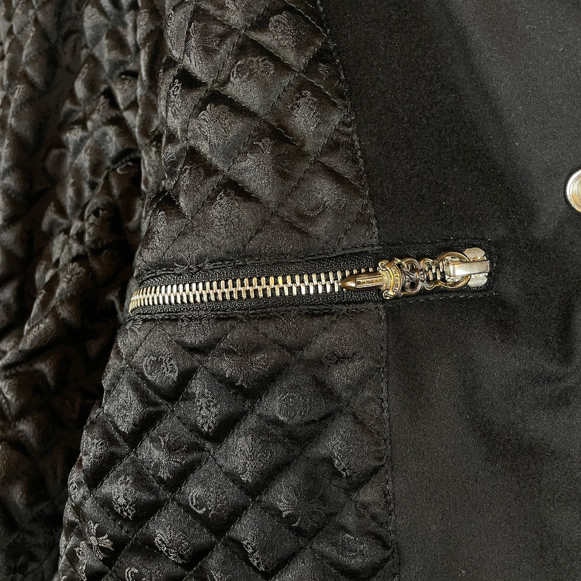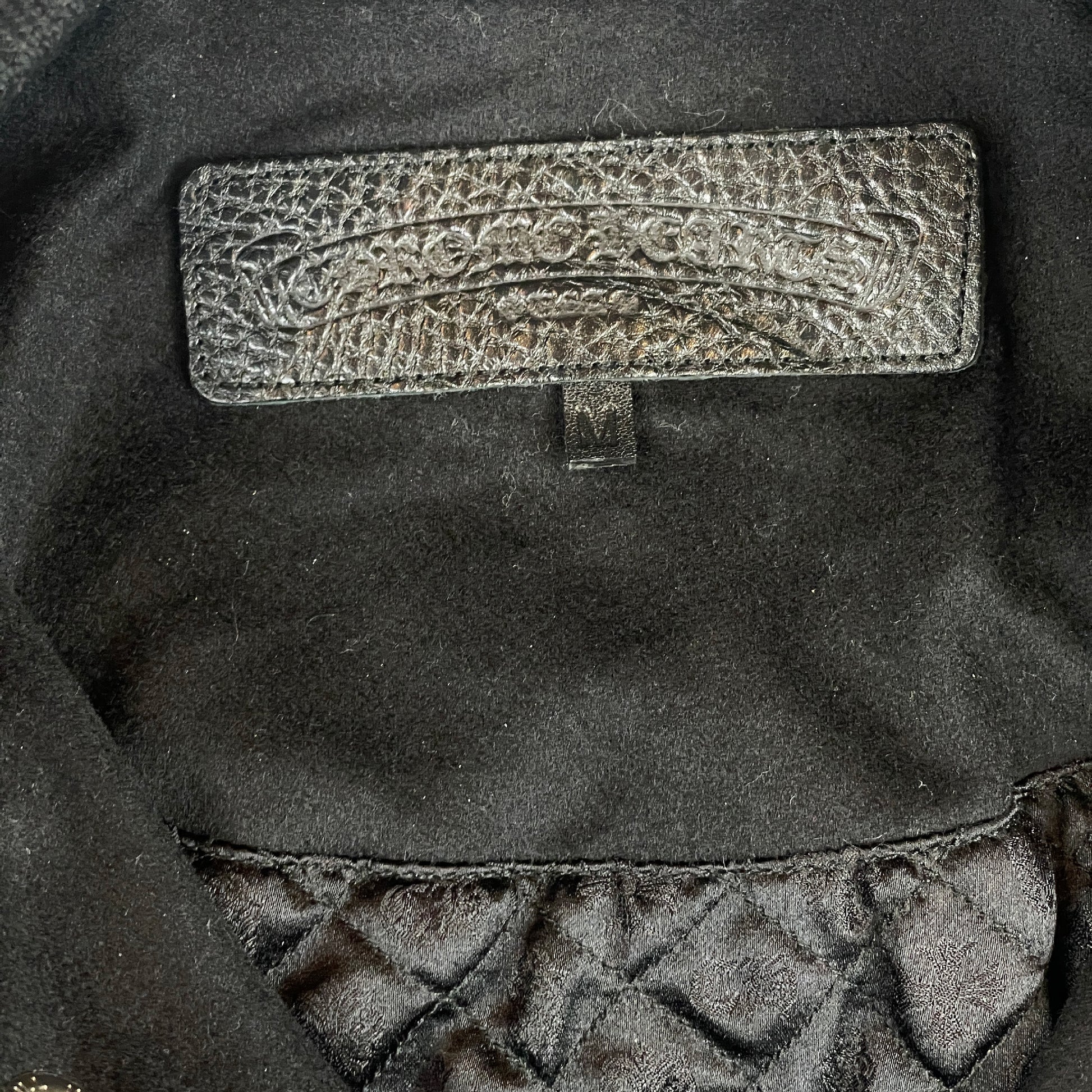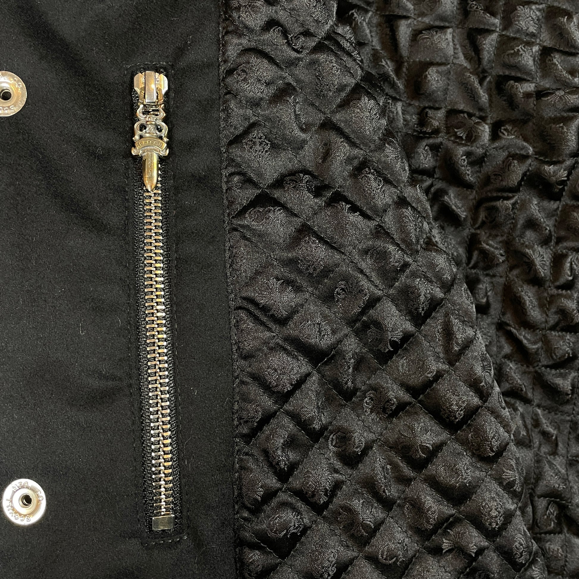 The Chrome Hearts Letterman Jacket is an iconic and highly desirable piece. It features .925 silver hardware, loaded with leather patches, a quilted silk interior, a large "CH" logo, and a "Fleur De Lis" patch with intricate CH silver detailing on nearly every part of the jacket.