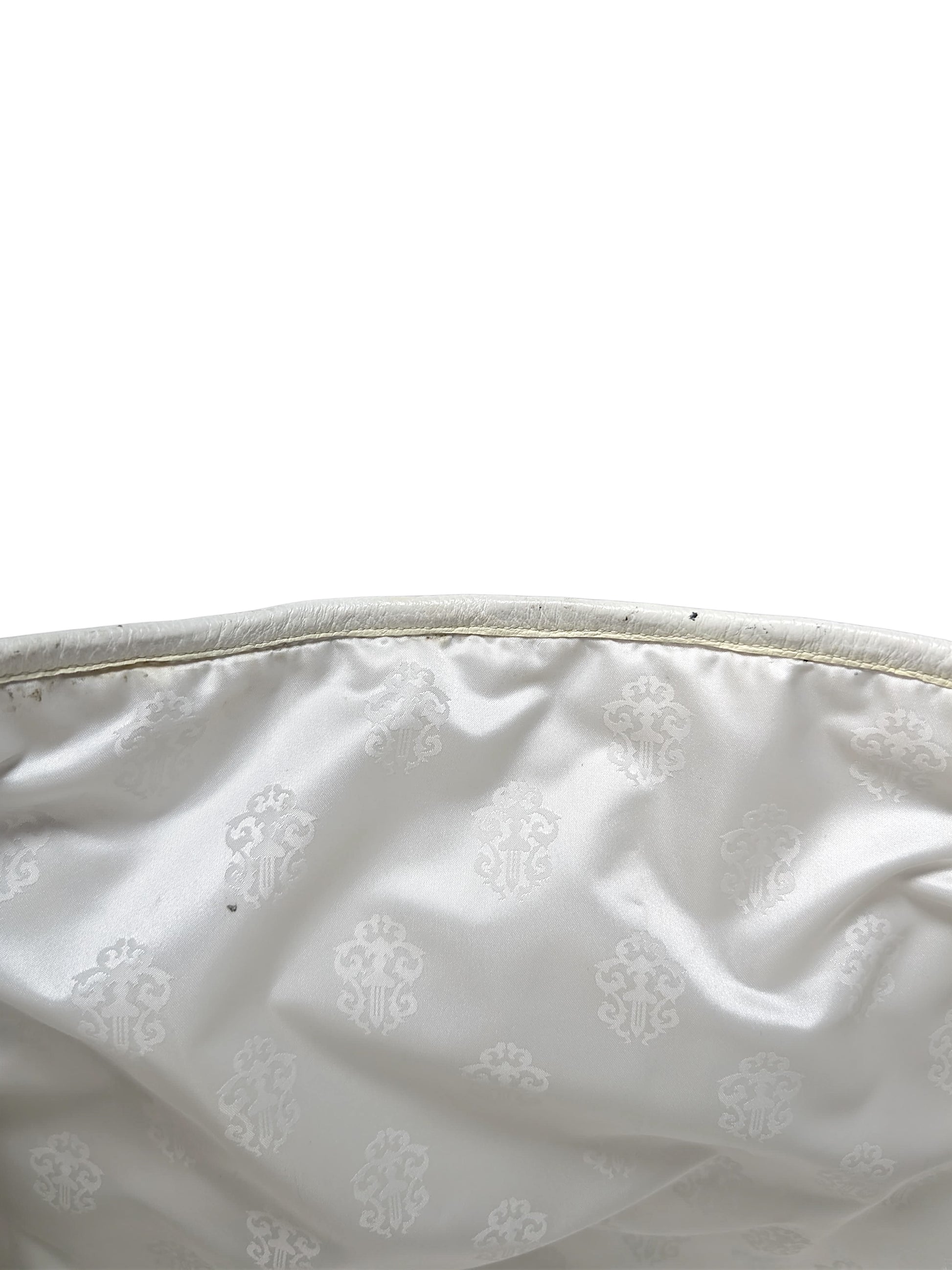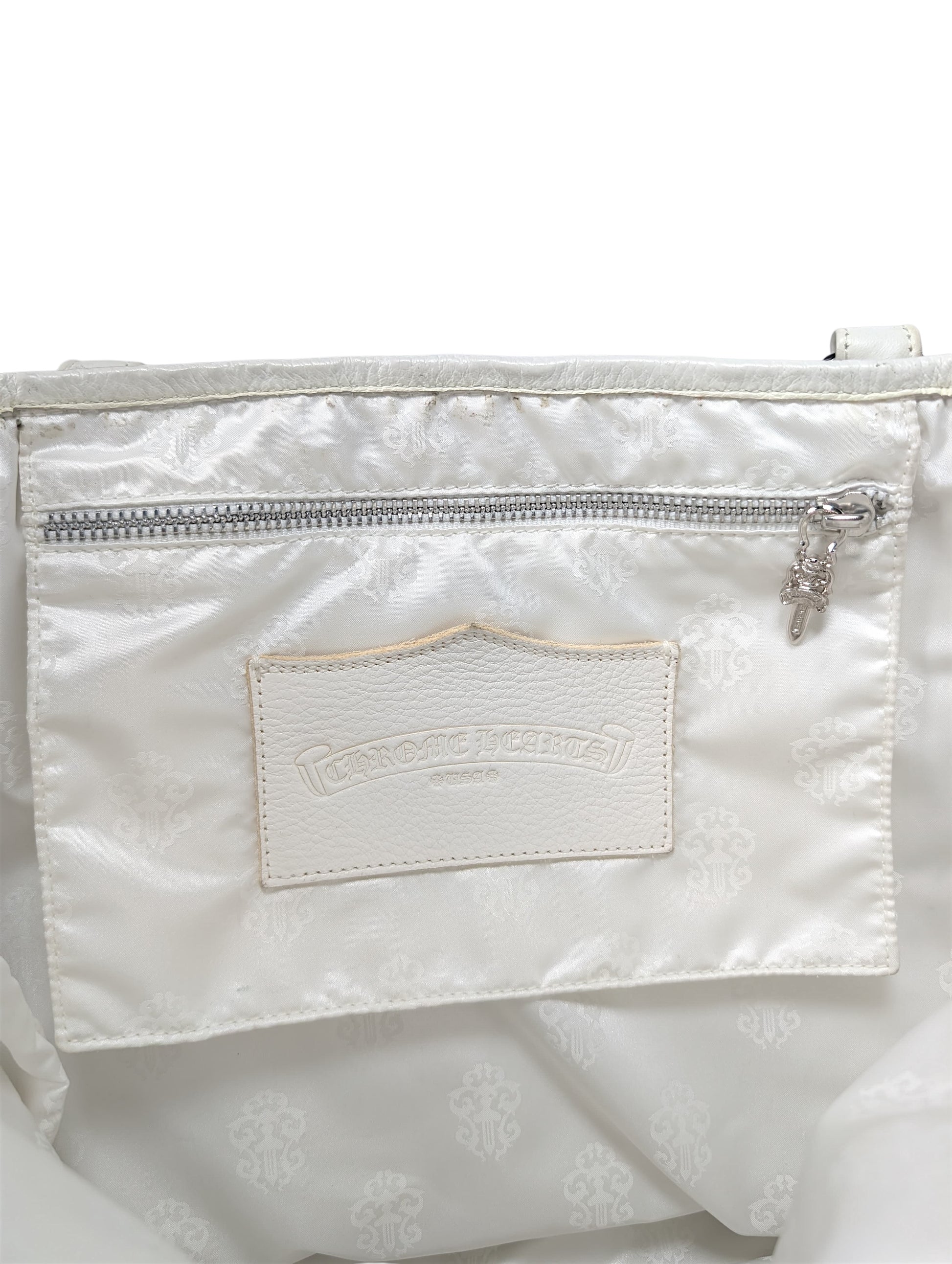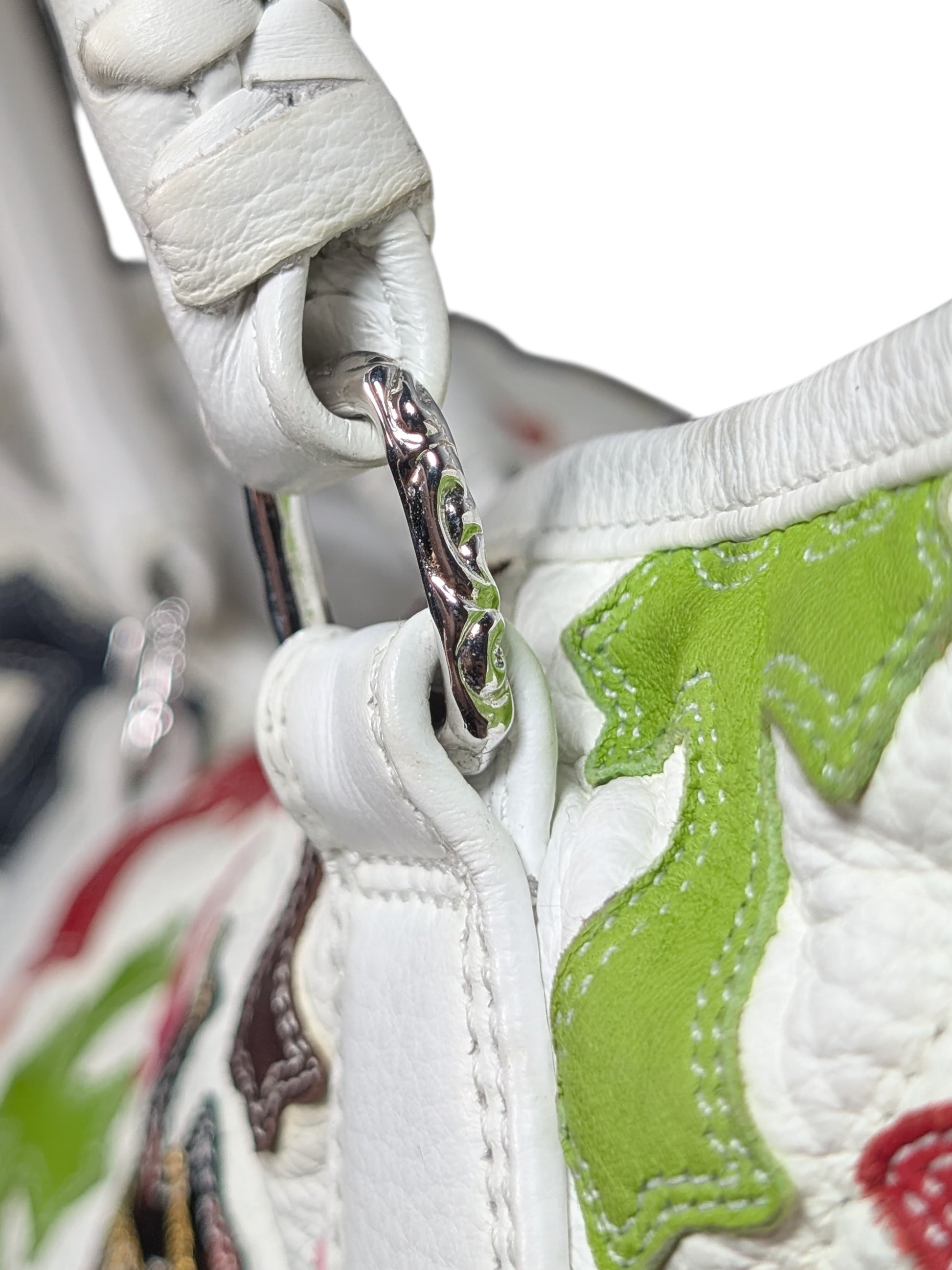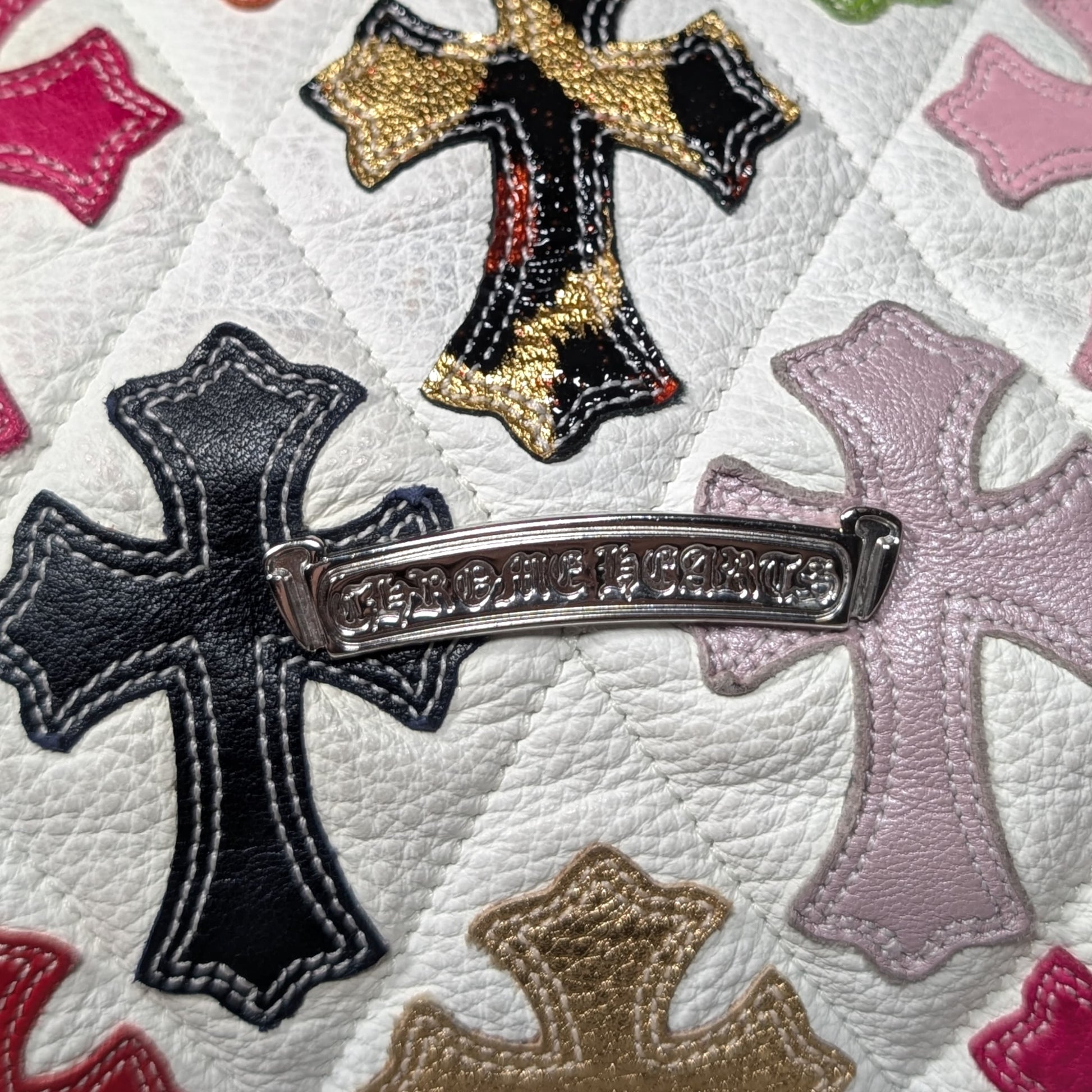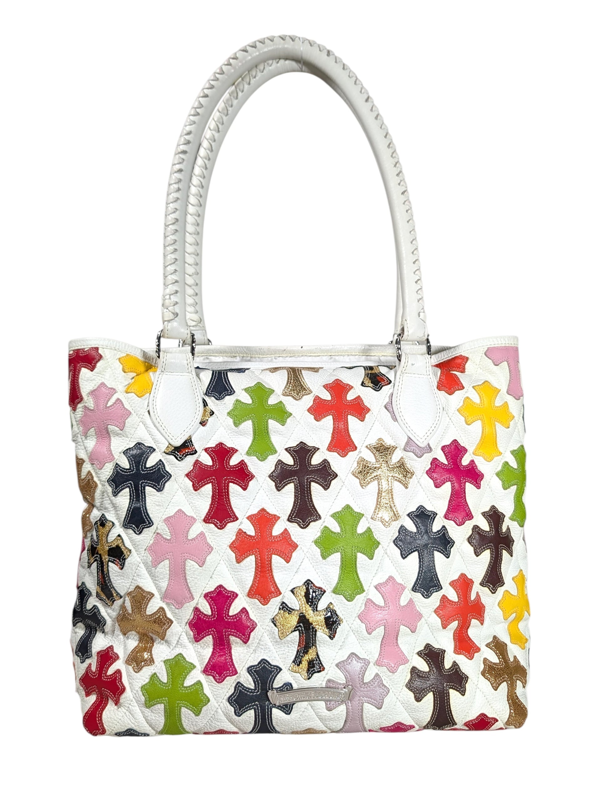 Chrome Hearts FS Tote Bag in quilted white leather with multicolor leather cross patches. Braided leather handles with rhodium plated .925 sterling silver hardware. The Chrome Hearts FS Tote in quilted leather with multi color cross patches is one of Chrome Hearts’ most collectible tote designs, especially with this white base.