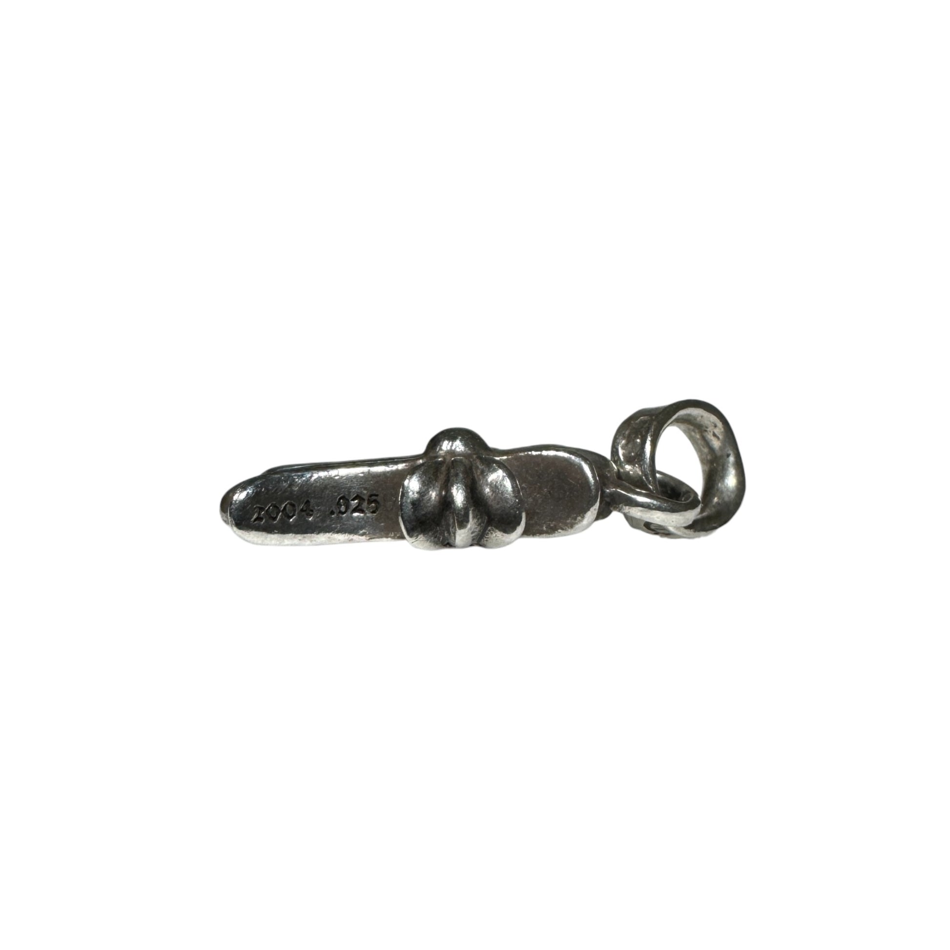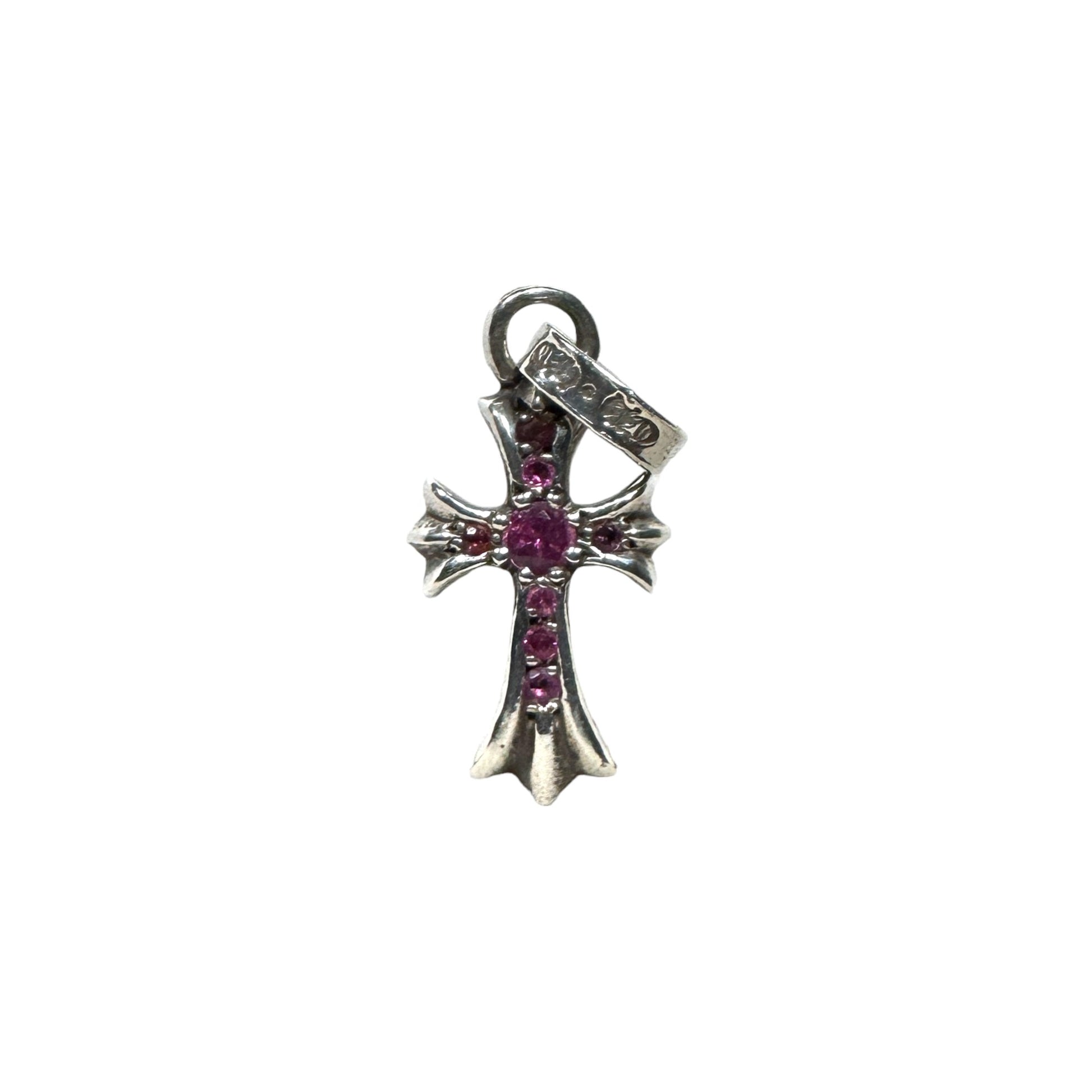 The Chrome Hearts Baby fat Cross Pendant Charm sports pavé pink sapphires on .925 silver, with classic high quality craftsmanship throughout the CH detailing. This is a classic and iconic design from the brand. An elegant piece of fine jewelry that adds a subtle pop to any outfit.