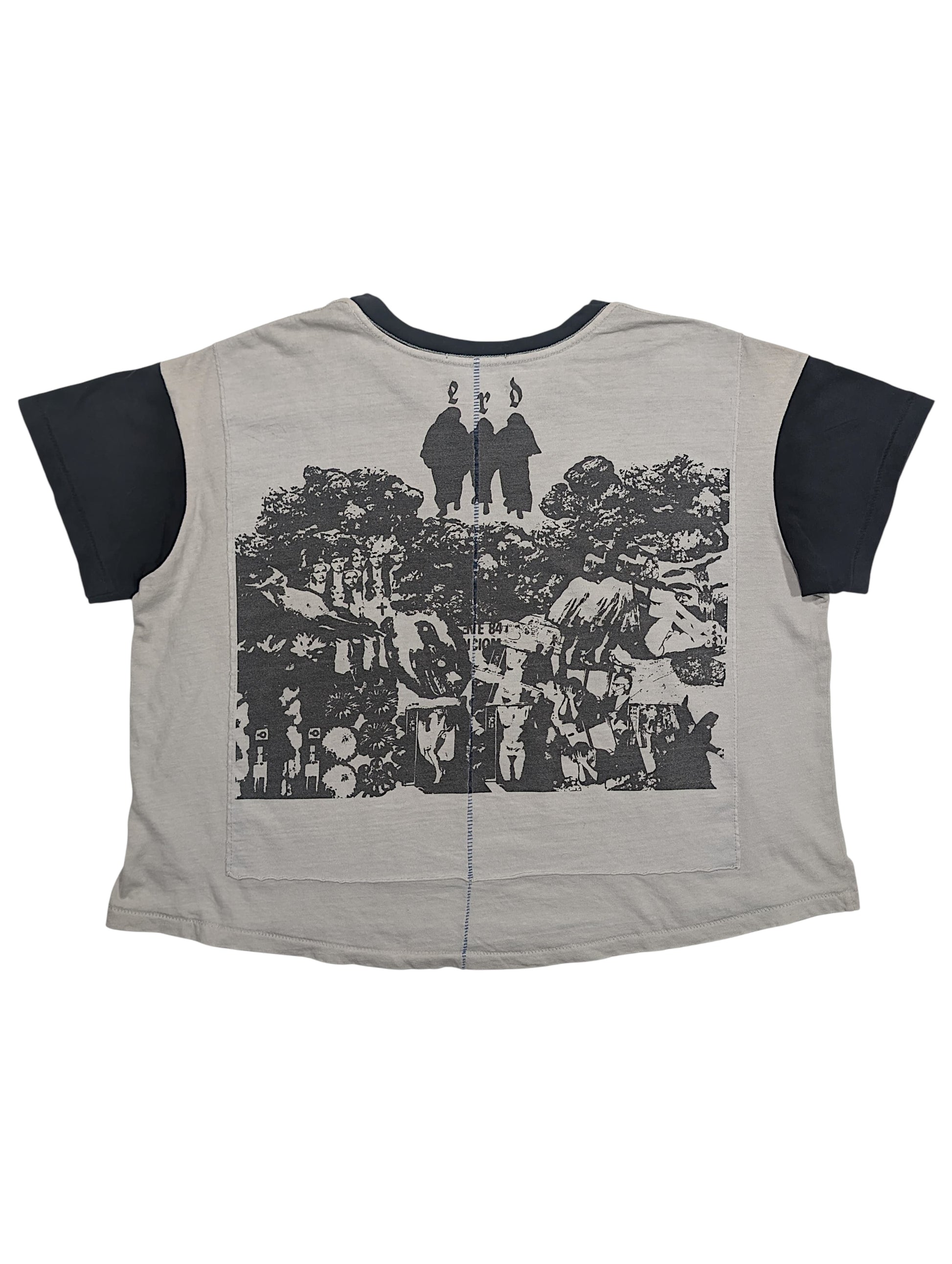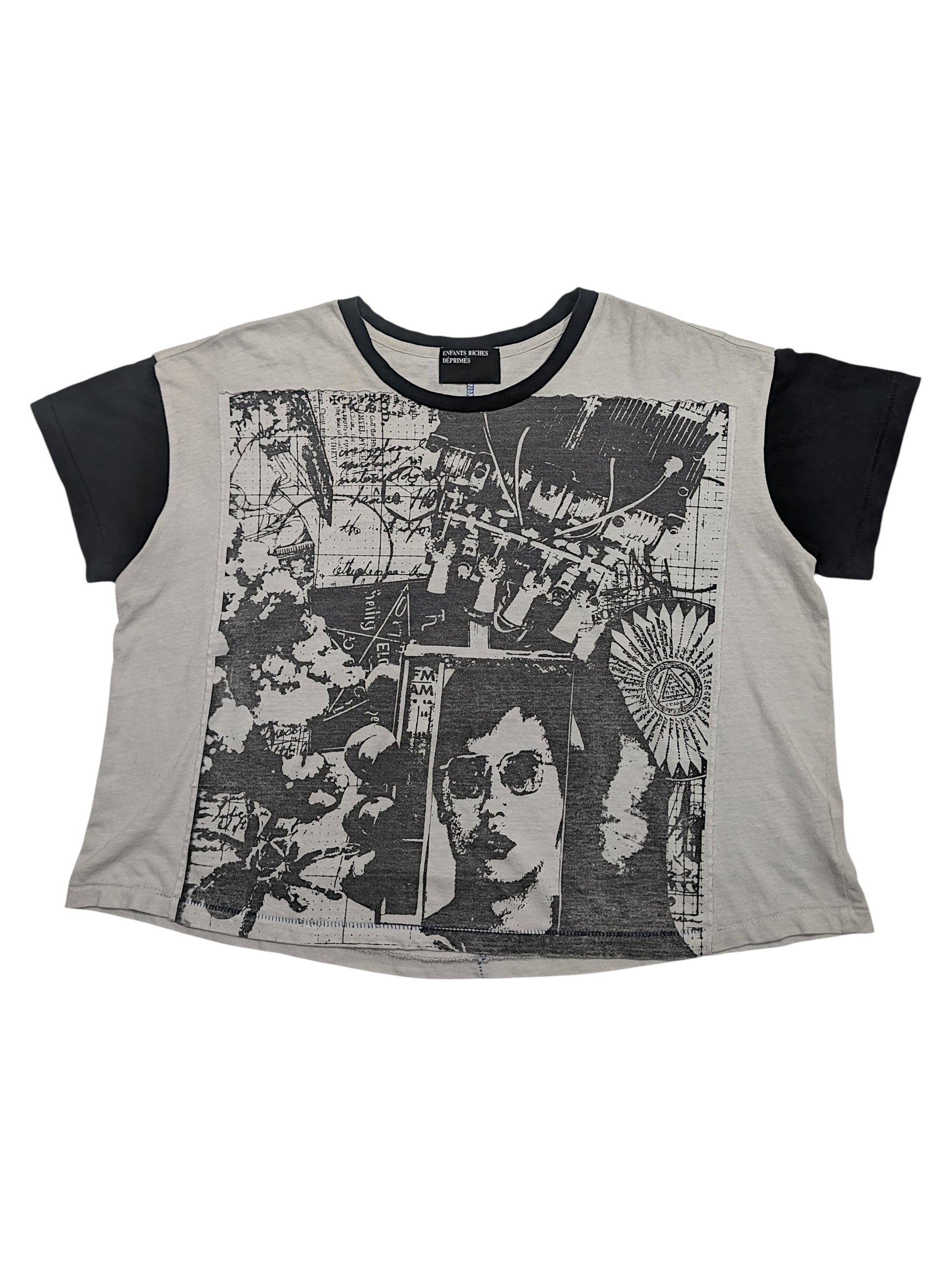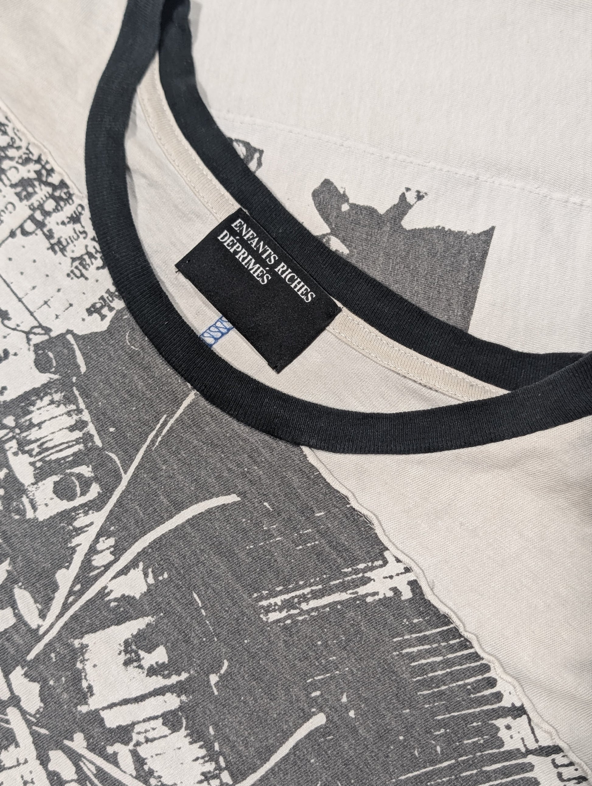 Enfants Riches Déprimés Regression IV Assemblage T-shirt in white and black cotton. Features patchwork assemblage construction, front and back graphic print, cropped hem, dropped shoulders, and contrast blue stitching.