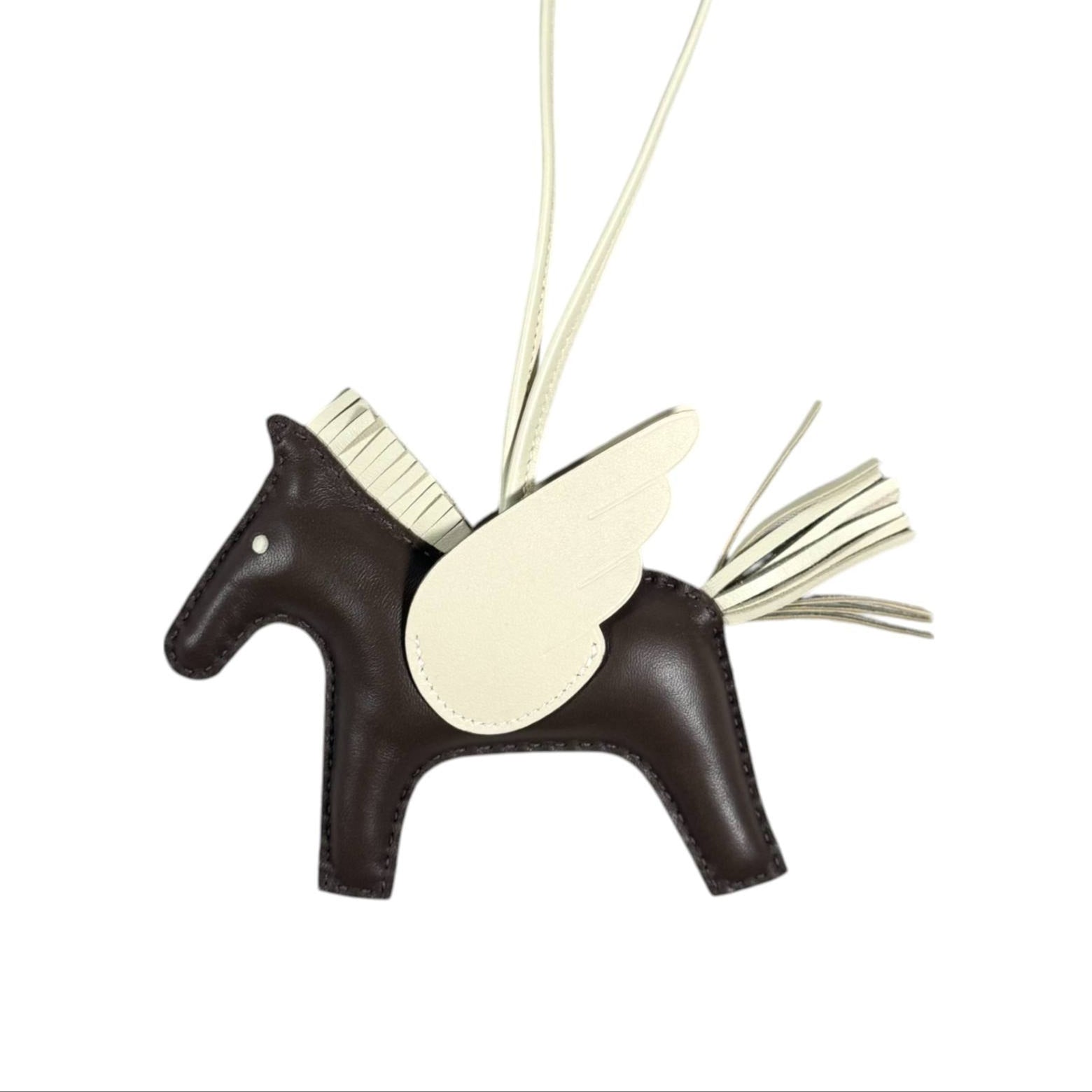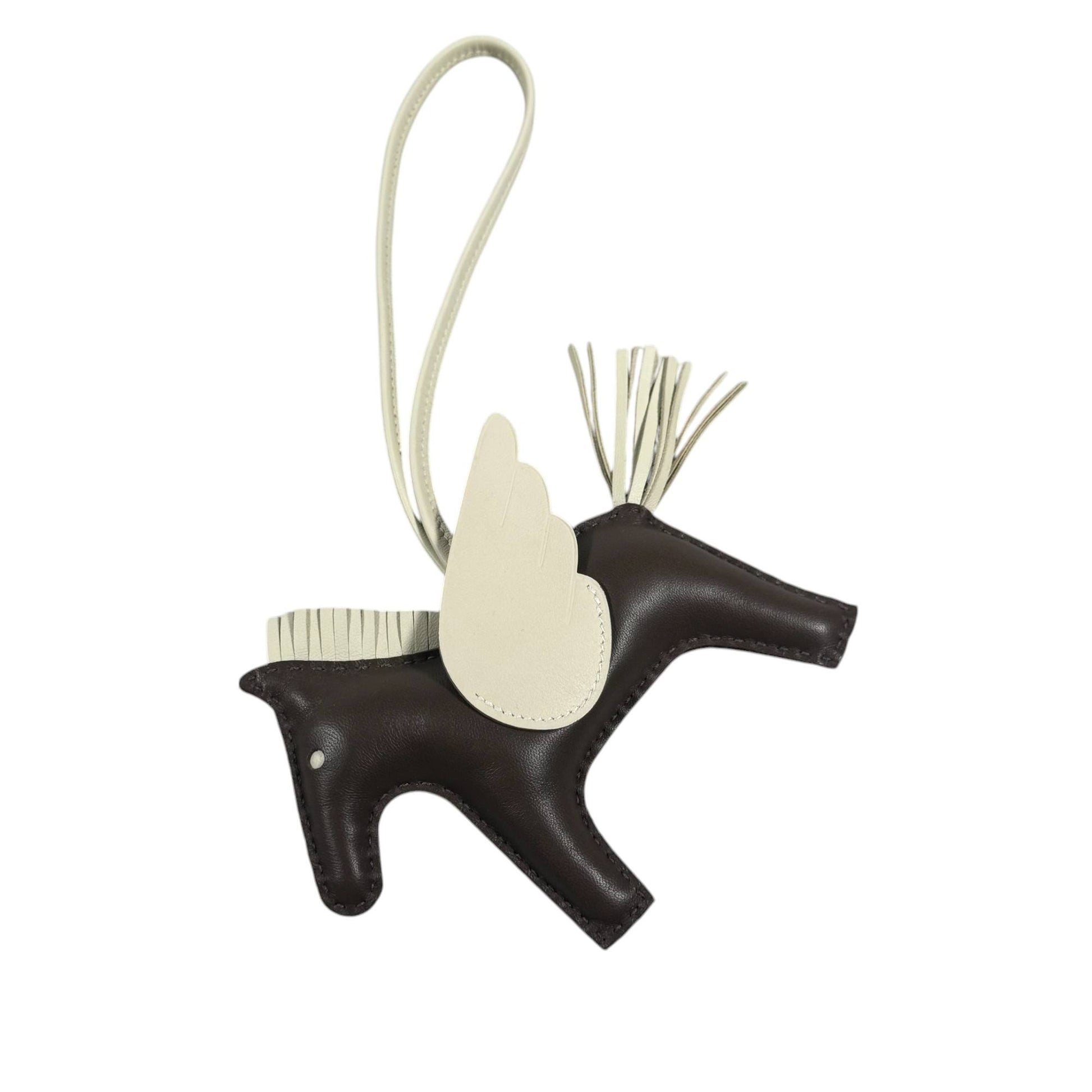 Crafted in chocolate brown and chalk cream white milo lambskin with chalk cream off-white wing. Iconic winged horse silhouette with fringe mane and tail. Made in France.