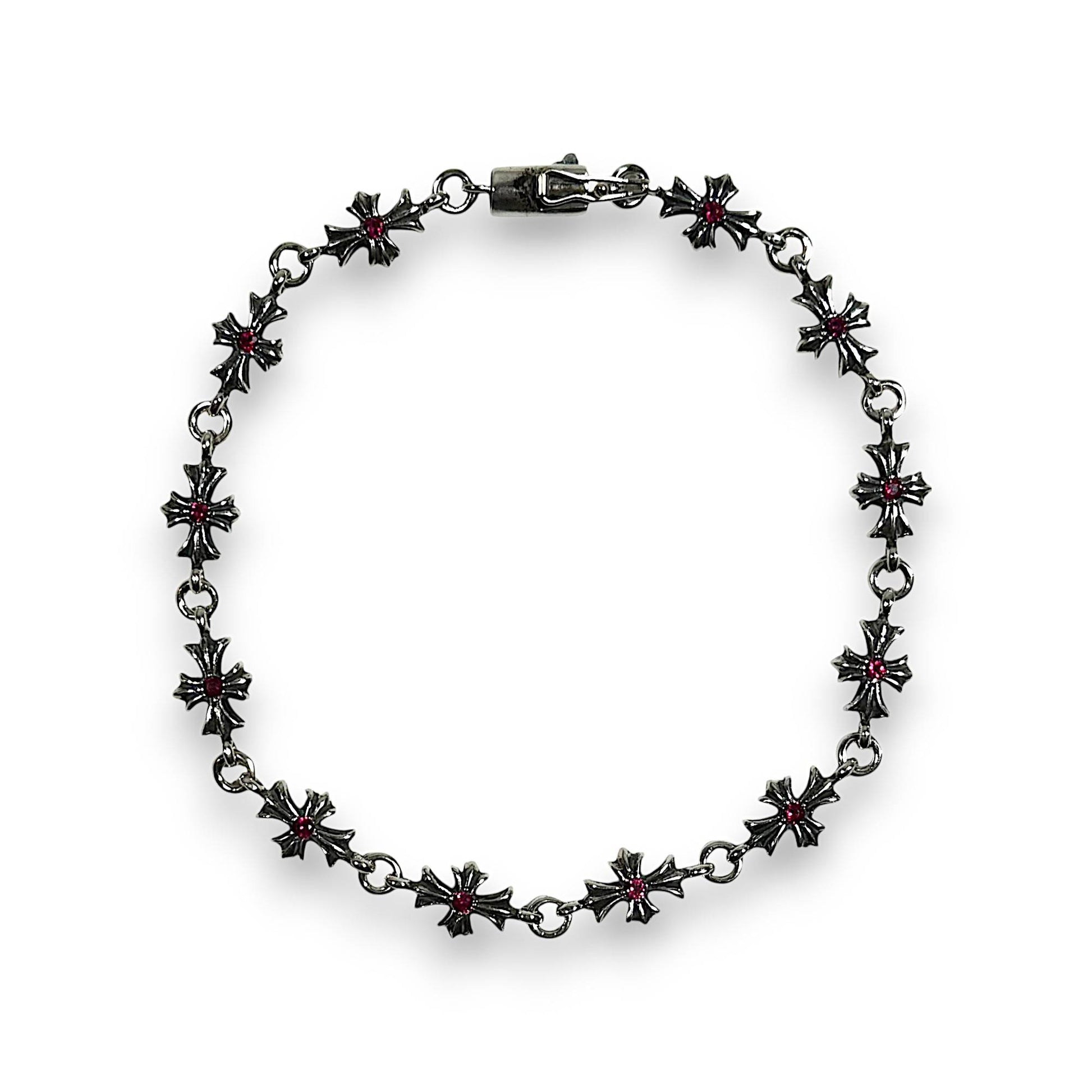 Chrome Hearts Tiny E Ruby Bracelet in .925 silver. This bracelet is extremely rare as much as it is beautiful. With double sided rubies on each link, this Tiny E bracelet is a true elegant collectors piece, and a perfect addition to any bracelet stack.