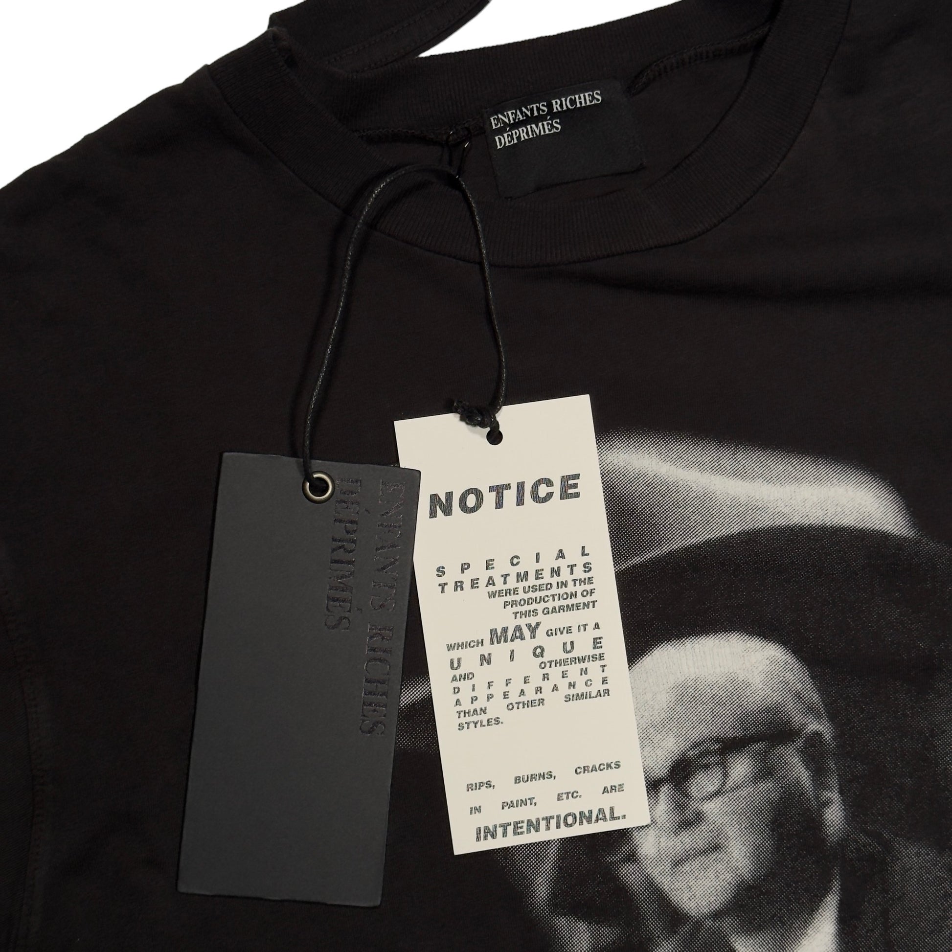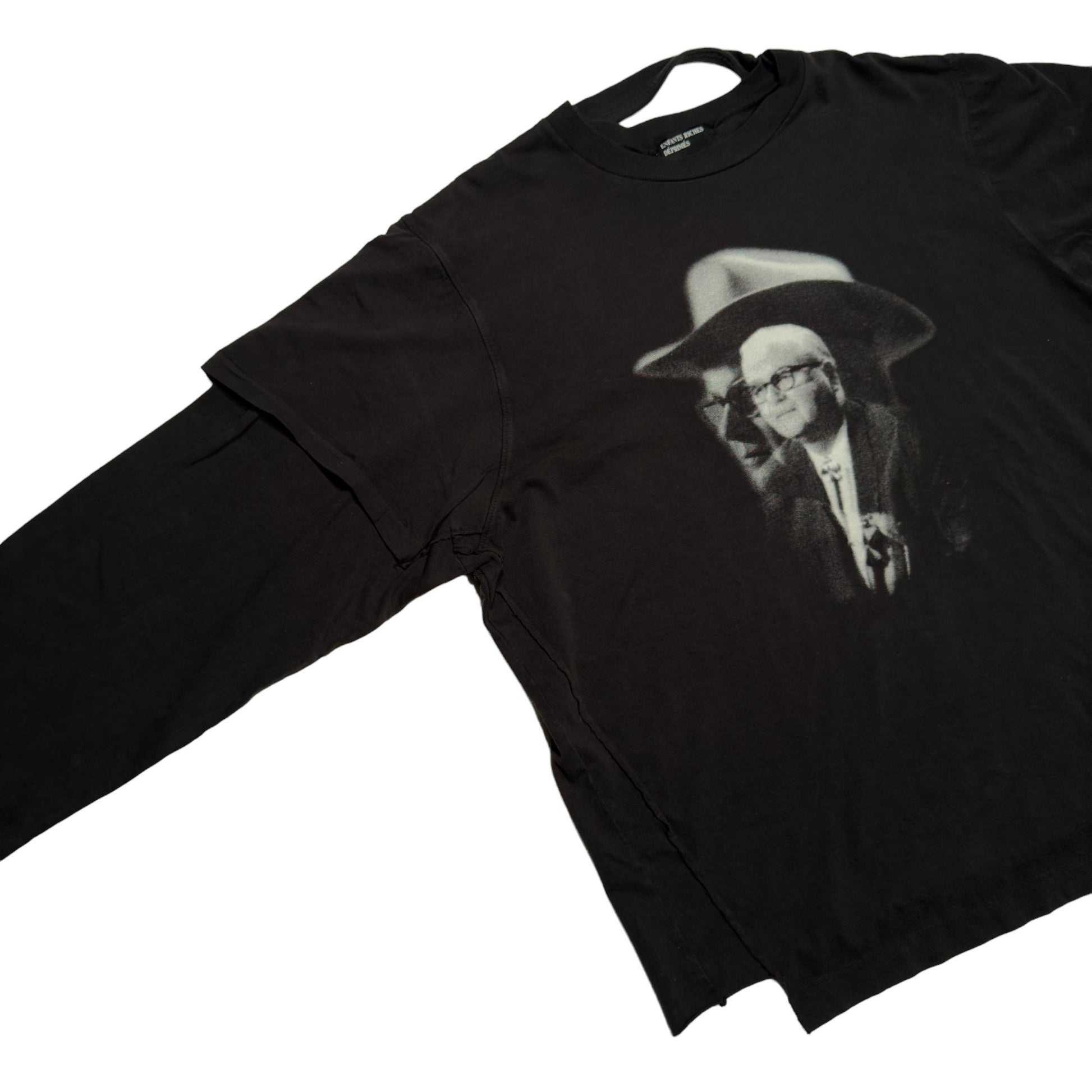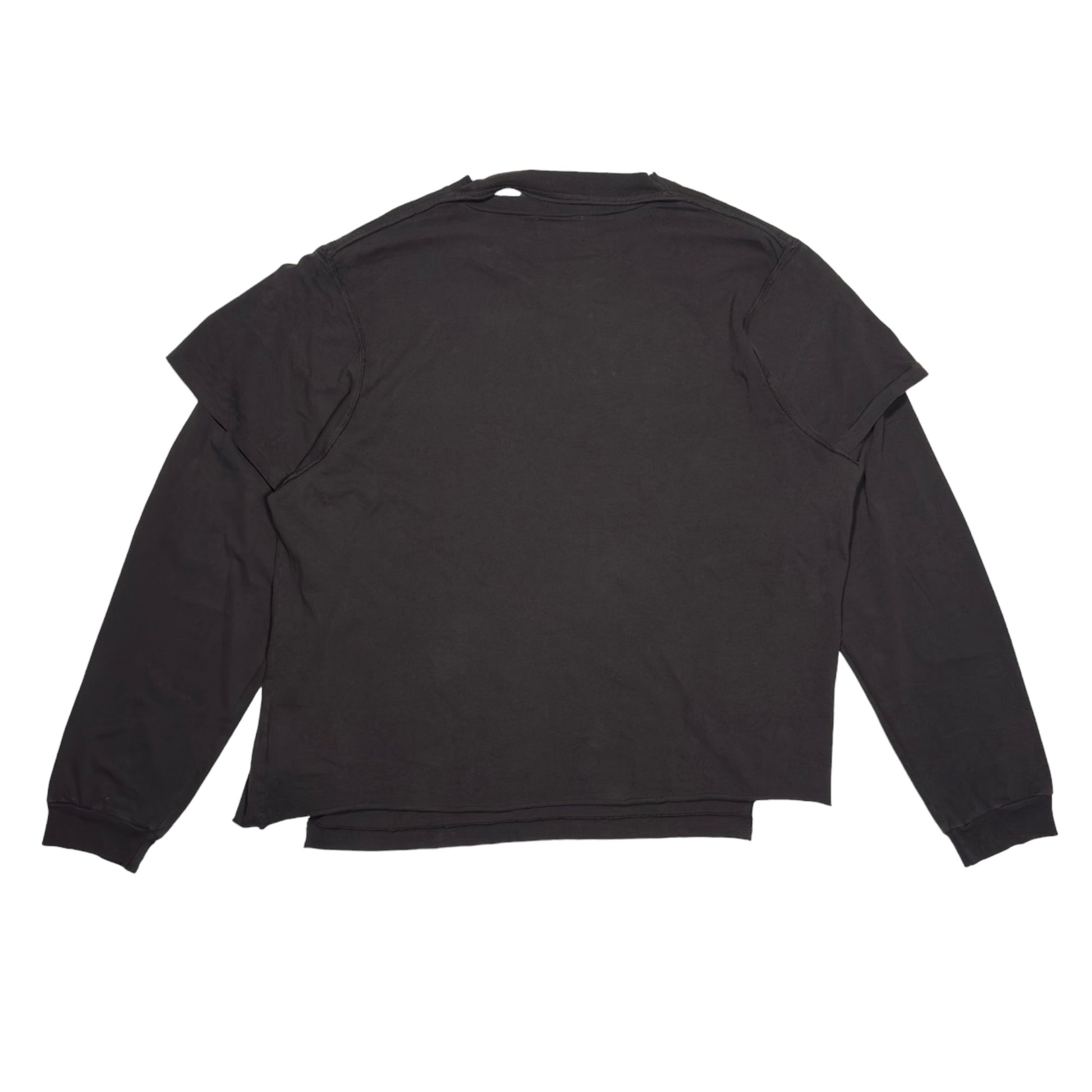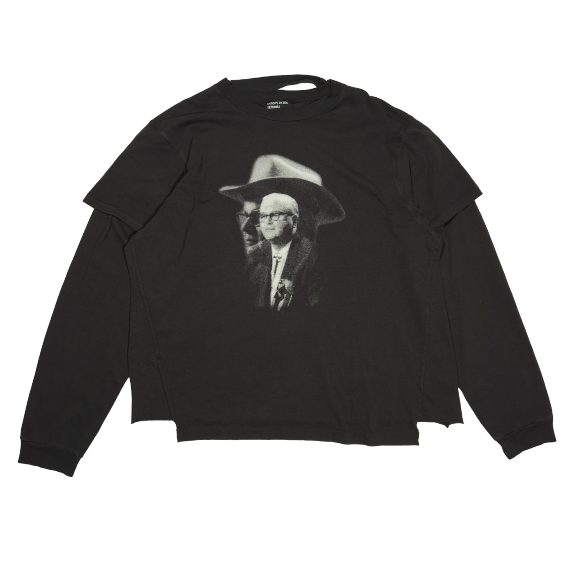 RE-CONSTRUCTED DOUBLE LAYER LONG-SLEEVE T-SHIRT MADE OF HEAVY WEIGHT COTTON JERSEY. PRINTED ARTWORK AT FRONT. HEAVY VINTAGE WASH PROCESS. HEAVY DISTRESSING THROUGHOUT. MADE IN THE USA.