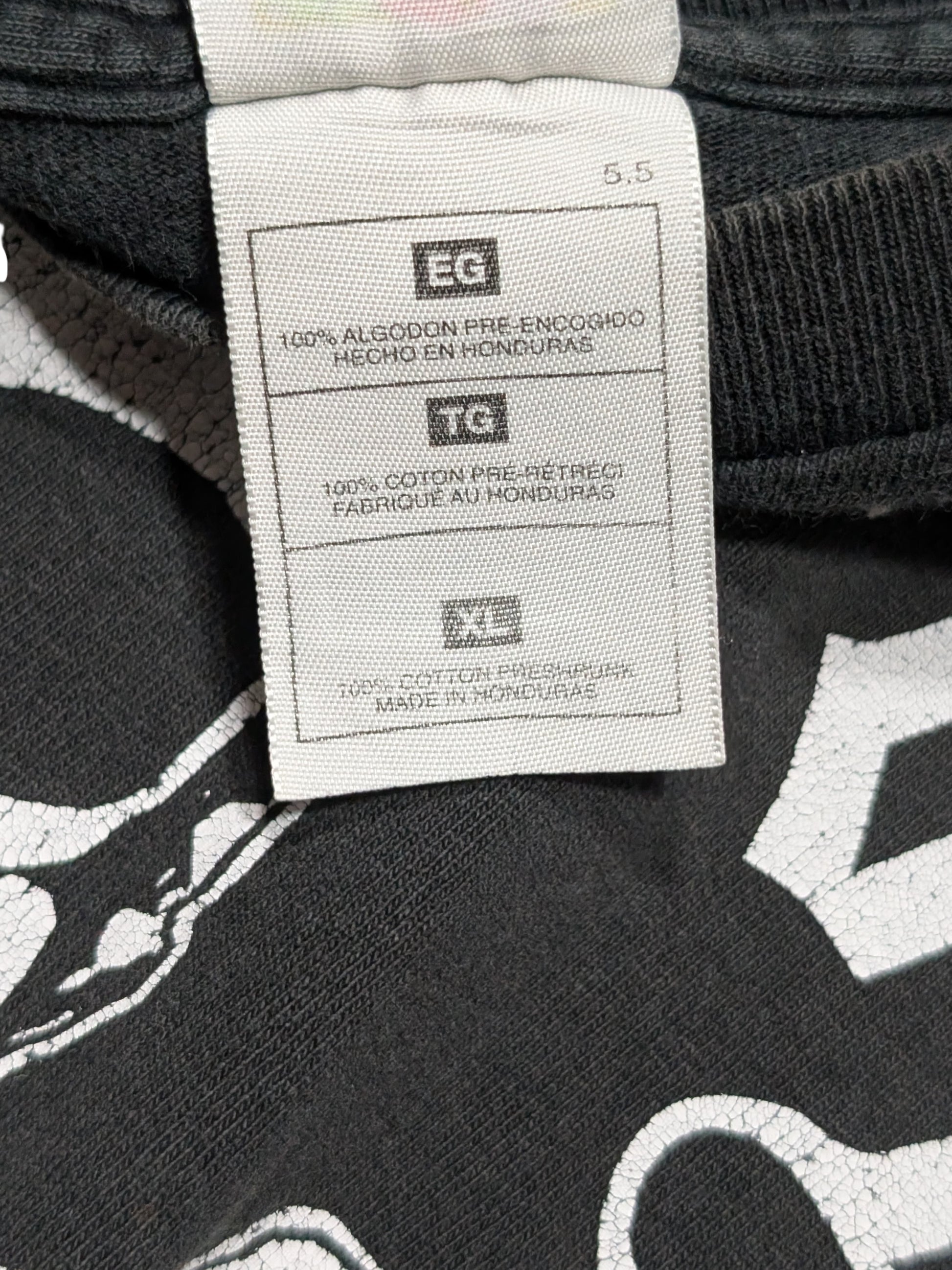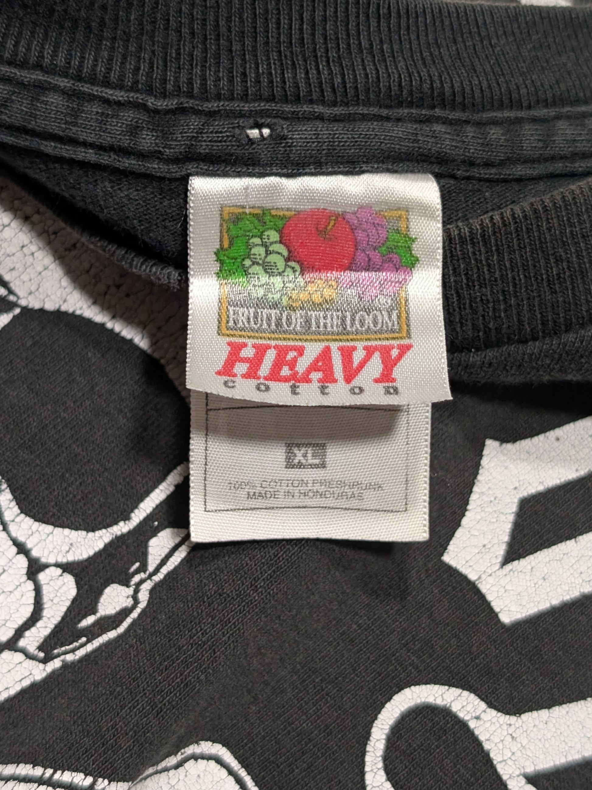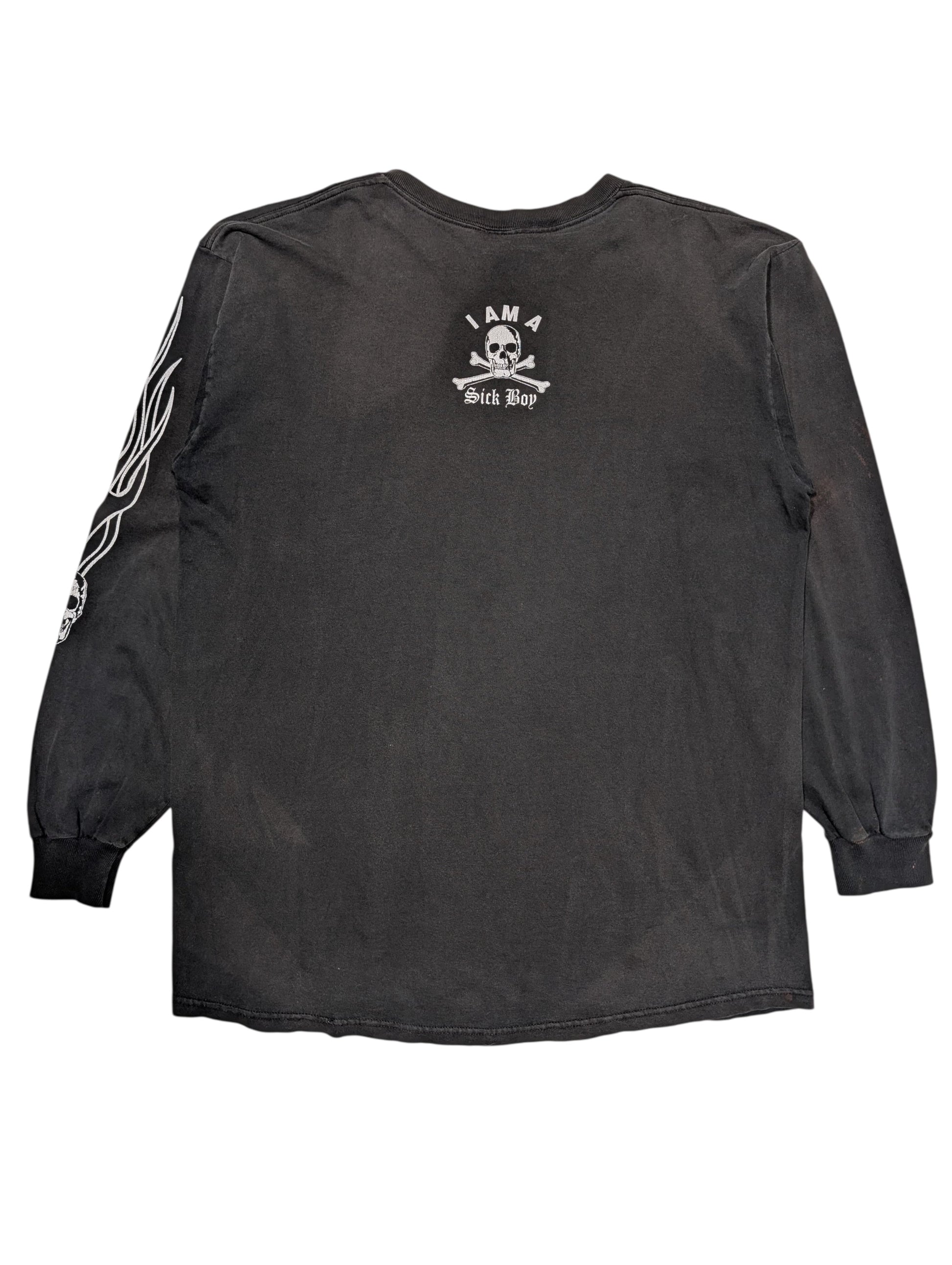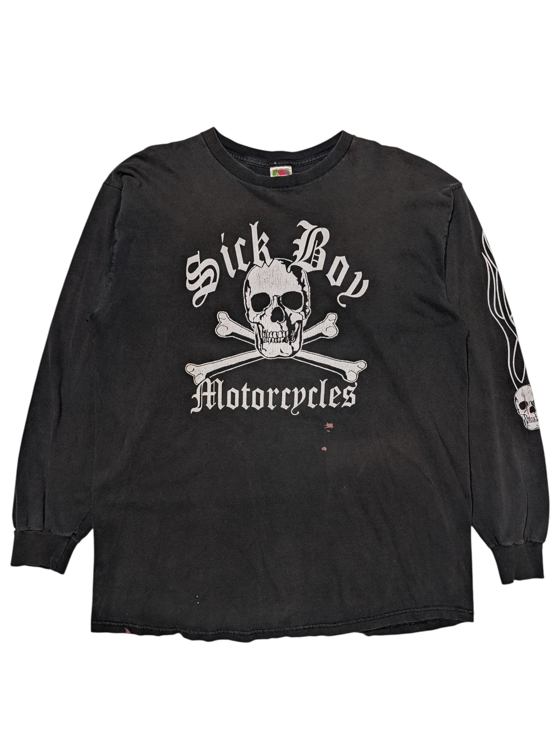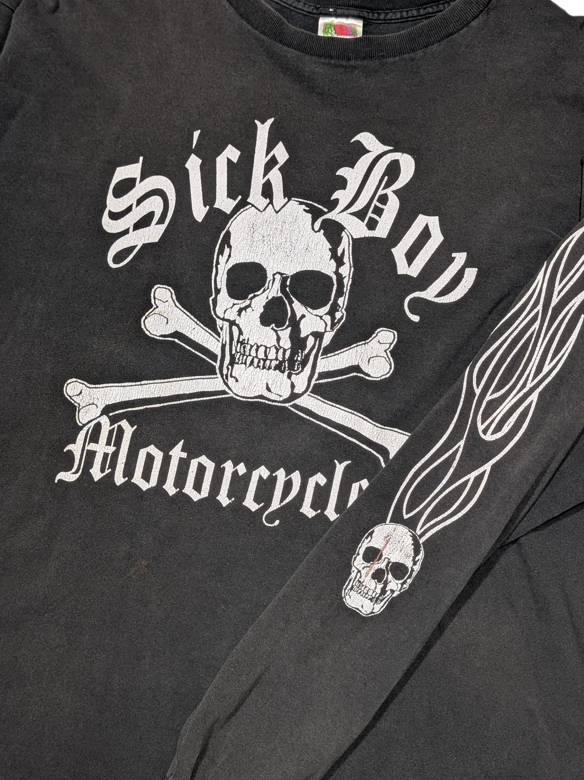 Sick Boy Motorcycles long sleeve tee in black cotton with skull and crossbones graphic, sleeve hits, and back logo. Classic 1990s biker tee on Fruit of the Loom Heavy tag.